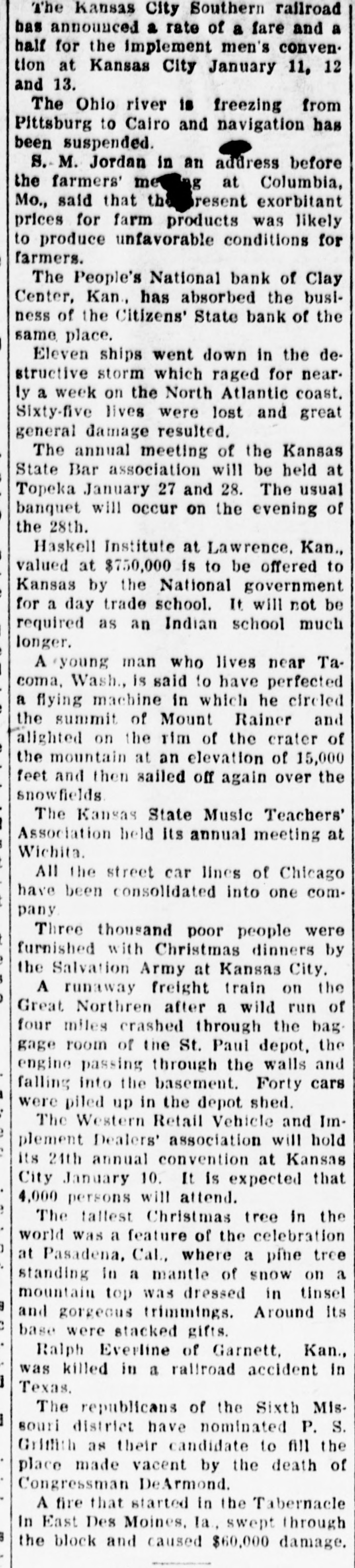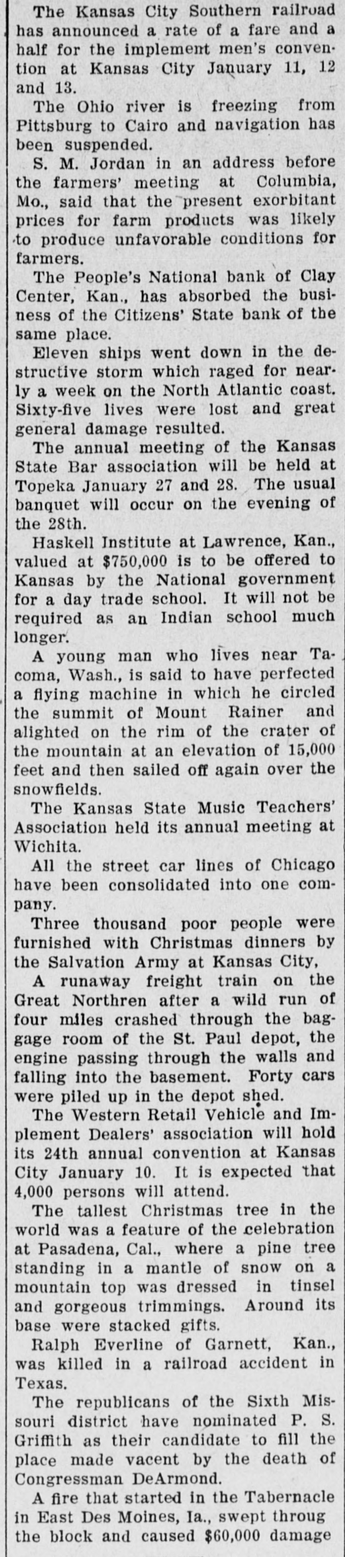 The Kansas City Southern railroad has announced a rate of a fare and a half for the implement men's conven. tion at Kansas City January 11, 12 and 13. The Ohio river is freezing from Pittsburg to Cairo and navigation has been suspended. S. M. Jordan in an address before the farmers' me ng at Columbia, Mo., said that the resent exorbitant prices for farm products was likely to produce unfavorable conditions for farmers. The People's National bank of Clay Center, Kan., has absorbed the business of the Citizens' State bank of the same place. Eleven ships went down in the destructive storm which raged for nearly a week on the North Atlantic coast. Sixty-five lives were lost and great general damage resulted. The annual meeting of the Kansas State Bar association will be held at Topeka January 27 and 28. The usual banquet will occur on the evening of the 28th. Haskell Institute at Lawrence. Kan., valued at $750,000 is to be offered to Kansas by the National government for a day trade school. It will not be required as an Indian school much longer. A young man who lives near Tacoma, Wash., is said to have perfected a flying machine in which he circled the summit of Mount Rainer and alighted on the rim of the crater of the mountain at an elevation of 15,000 feet and then sailed off again over the snowfields The Kansas State Music Teachers' Association held its annual meeting at Wichita. All the street car lines of Chicago have been consolidated into one company Three thousand poor people were furnished with Christmas dinners by the Salvation Army at Kansas City. A runaway freight train on the Great Northren after a wild run of four miles crashed through the bag. gage room of the St. Paul depot, the engine passing through the walls and falling into the basement. Forty cars were piled up in the depot shed. The Western Retail Vehicle and Implement Dealers' association will hold its 24th annual convention at Kansas City January 10. It is expected that 4,000 persons will attend. The tallest Christmas tree in the world was a feature of the celebration at Pasadena, Cal., where a pine tree standing in a mantle of snow on a mountain top was dressed in tinsel and gorgeous trimmings. Around its base were stacked gifts. Ralph Everline of Garnett, Kan., was killed in a rallroad accident in Texas. The republicans of the Sixth Missouri district have nominated P. S. Griffith as their candidate to fill the place made vacent by the death of Congressman DeArmond. A fire that started in the Tabernacle In East Des Moines, la, swept through the block and caused $60,000 damage.
