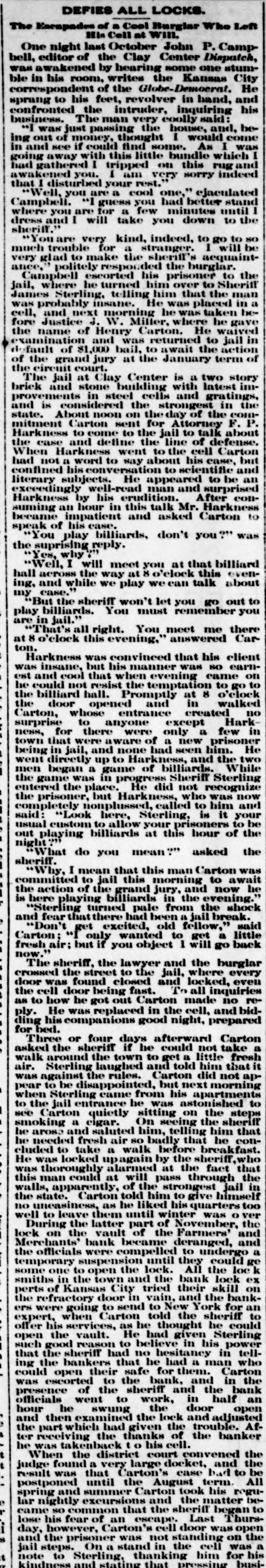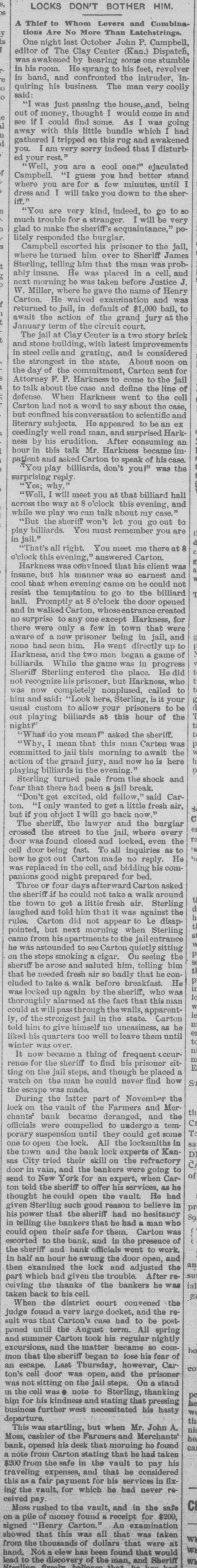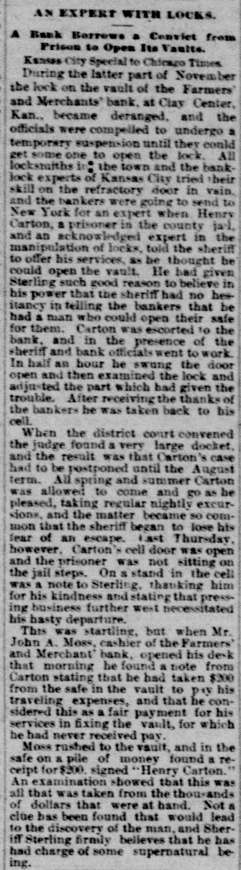 During the latter part of November the lock on the vault of the Farmers and Merchants' bank became deranged, and the officials were compelled to undergo a temporary suspension until they could get some one to open the lock. All the locksmiths in the town and the bank lock experts of Kansas City tried their skill on the refractory door in vain, and the bankers were going to send to New York for an expert, when Carton told the sheriff to offer his services, as he thought he could open the vault. He had given Sterling such good reason to believe in his power that the sheriff had no hesitancy in telling the bankers that he had a man who could open their safe for them. Carton was escorted to the bank, and in the presence of the sheriff and bank officials went to work. In half an hour he swung the door open, and then examined the lock and adjusted the part which had given the trouble. After receiving the thanks of the bankers he was taken back to his cell.