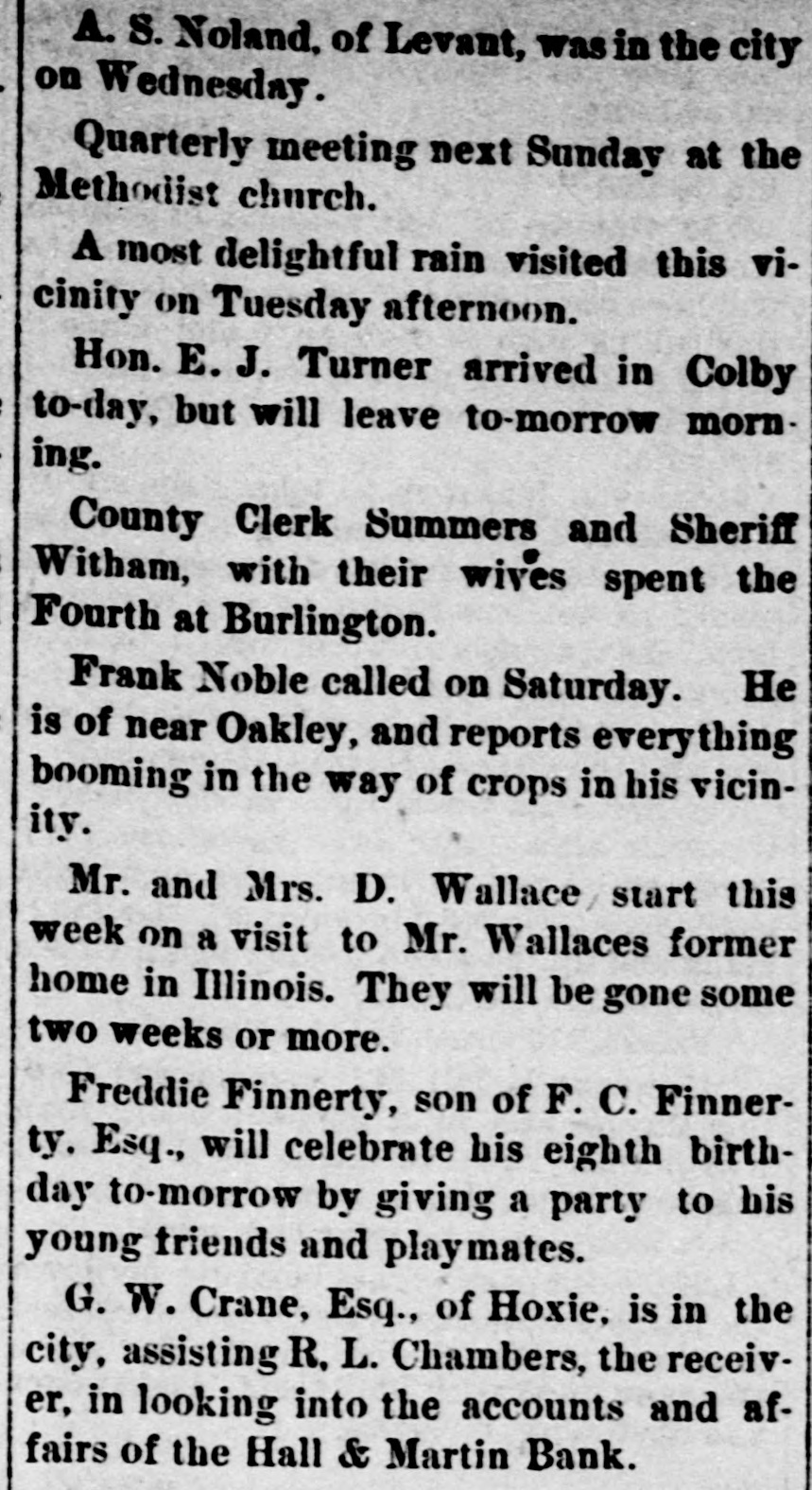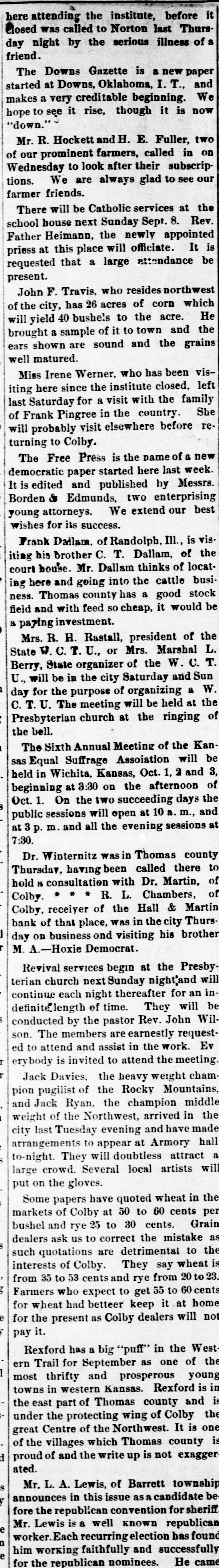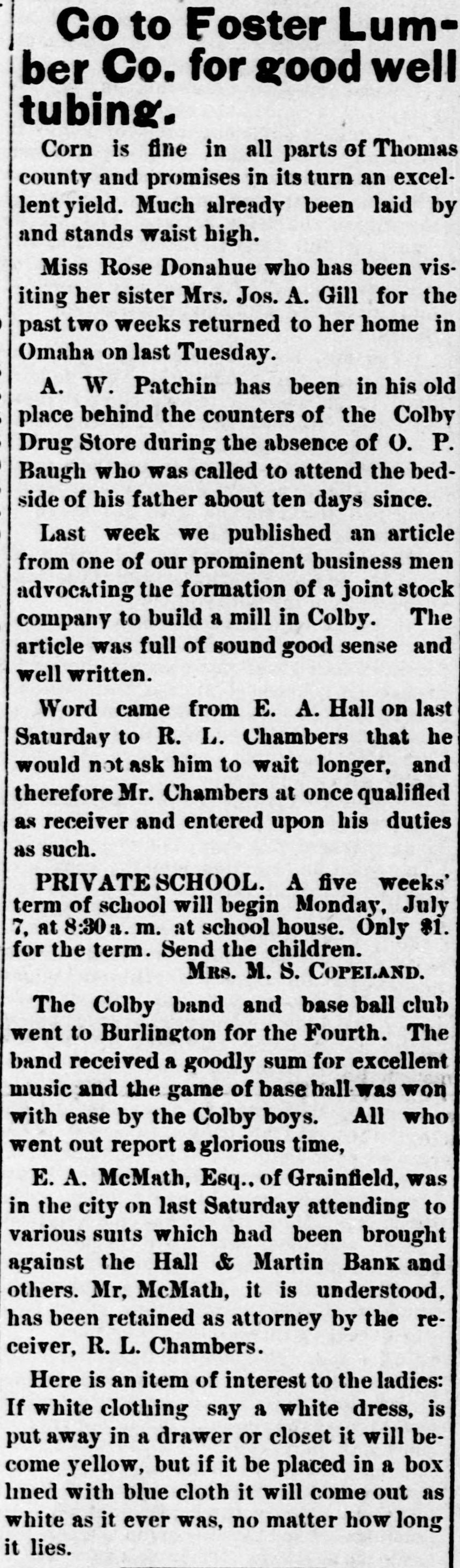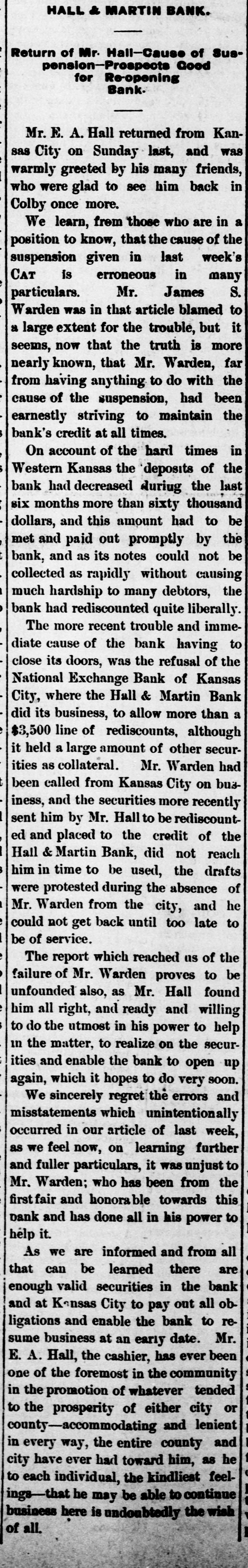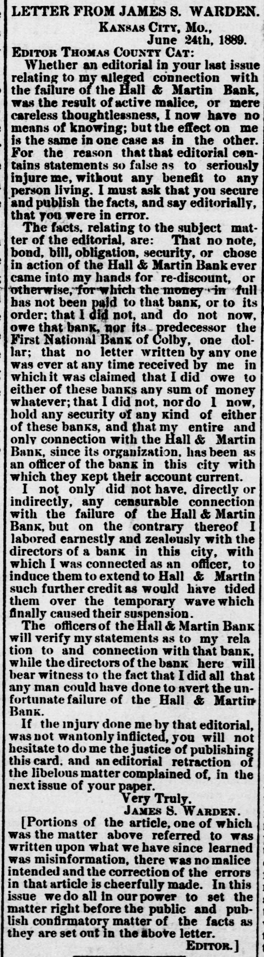 LETTER FROM JAMES S. WARDEN. KANSAS CITY, Mo., June 24th, 1889. EDITOR THOMAS COUNTY CAT: Whether an editorial in your last issue relating to my alleged connection with the failure of the Hall & Martin Bank, was the result of active malice, or mere careless thoughtlessness, I now have no means of knowing; but the effect on me is the same in one case as in the other. For the reason that that editorial contains statements so false as to seriously injure me, without any benefit to any person living. I must ask that you secure and publish the facts, and say editorially, that you were in error. The facts. relating to the subject matter of the editorial, are: That no note, bond, bill, obligation, security, or chose in action of the Hall & Martin Bank ever came into my hands for re-discount, or otherwise, for which the money in full has not been paid to that bank, or to its order: that I did not, and do not now, owe that bank, nor its predecessor the First National Bank of Colby, one dollar; that no letter written by any one was ever at any time received by me in which it was claimed that I did owe to either of these banks any sum of money whatever; that I did not, nor do 1 now, hold any security of any kind of either of these banks, and that my entire and only connection with the Hall & Martin Bank, since its organization. has been as an officer of the bank in this city with which they kept their account current. I not only did not have. directly or indirectly, any censurable connection with the failure of the Hall & Martin Bank, but on the contrary thereof I labored earnestly and zealously with the directors of a bank in this city, with which I was connected as an officer, to induce them to extend to Hall & Martin such further credit as would have tided them over the temporary wave which finally caused their suspension. The officers of the Hall & Martin Bank will verify my statements as to my rela tion to and connection with that bank, while the directors of the bank here will bear witness to the fact that I did all that any man could have done to avert the unfortunate failure of the Hall & Martin Bank. If the injury done me by that editorial, was not wantonly inflicted, you will not hesitate to do me the justice of publishing this card. and an editorial retraction of the libelous matter complained of, in the next issue of your paper. Very Truly. JAMES S. ARDEN. [Portions of the article, one of which was the matter above referred to was written upon what we have since learned was misinformation, there was no malice intended and the correction of the errors in that article is cheerfully made. In this issue we do all in our power to set the matter right before the public and publish confirmatory matter of the facts as they are set out in the above letter. EDITOR.]
