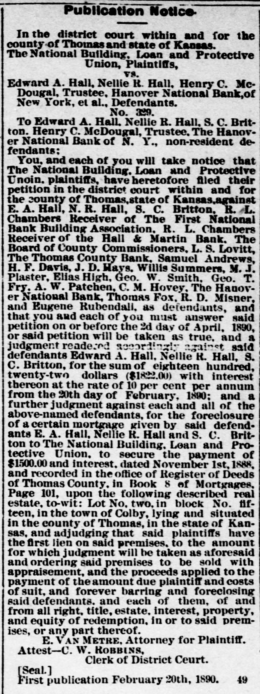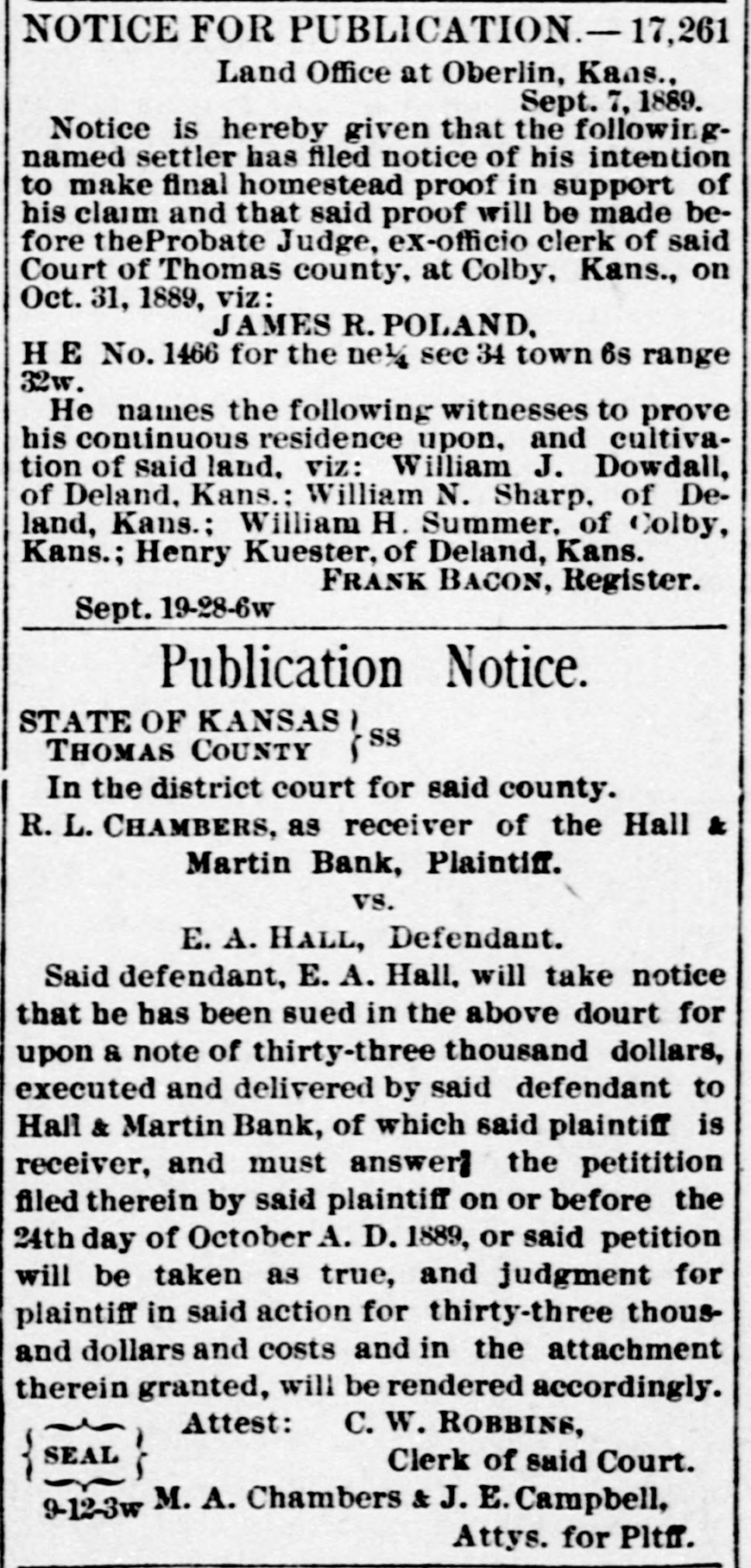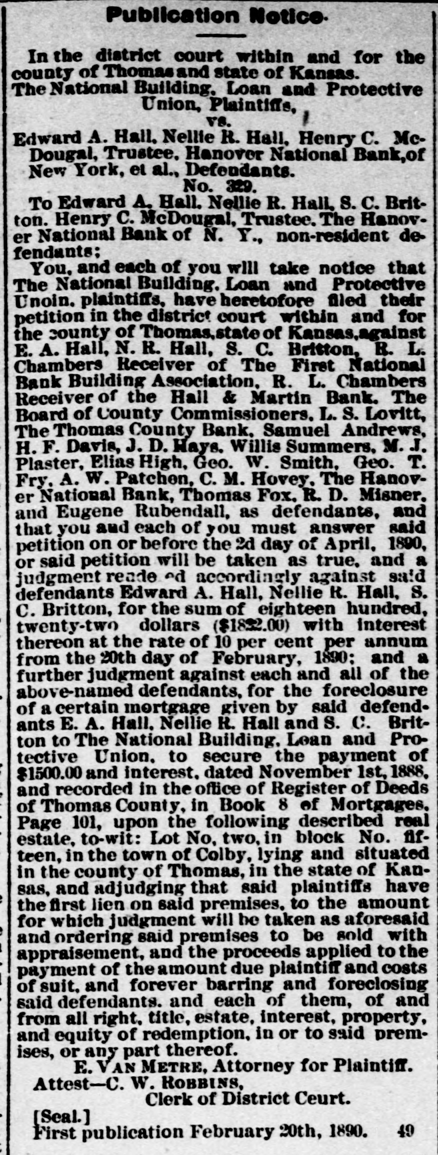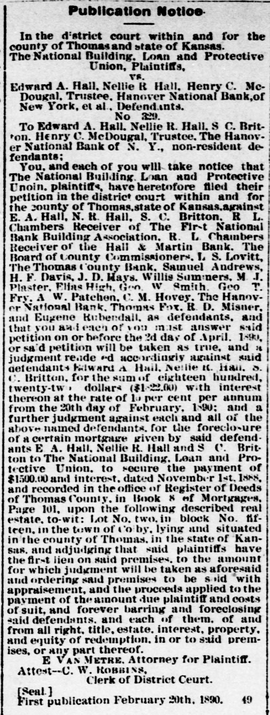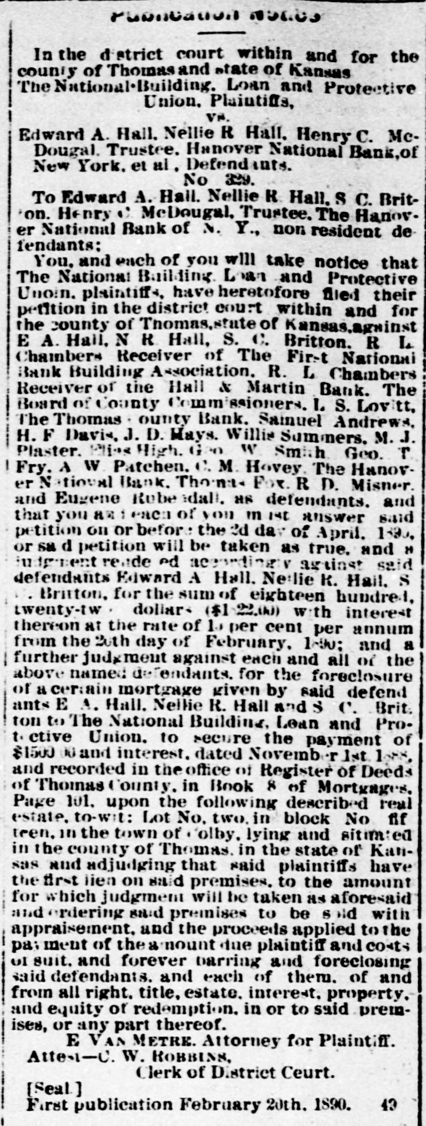 LETTER FROM JAMES S. WARDEN. KANSAS CITY, Mo., June 24th, 1889. EDITOR THOMAS COUNTY CAT: Whether an editorial in your last issue relating to my alleged connection with the failure of the Hall & Martin Bank, was the result of active malice, or mere careless thoughtlessness, I now have no means of knowing; but the effect on me is the same in one case as in the other. For the reason that that editorial contains statements so false as to seriously injure me, without any benefit to any person living. I must ask that you secure and publish the facts, and say editorially, that you were in error. The facts. relating to the subject matter of the editorial, are: That no note, bond, bill, obligation, security, or chose in action of the Hall & Martin Bank ever came into my hands for re-discount, or otherwise, for which the money in full has not been paid to that bank, or to its order: that I did not, and do not now, owe that bank, nor its predecessor the First National Bank of Colby, one dollar; that no letter written by any one was ever at any time received by me in which it was claimed that I did owe to either of these banks any sum of money whatever; that I did not, nor do 1 now, hold any security of any kind of either of these banks, and that my entire and only connection with the Hall & Martin Bank, since its organization. has been as an officer of the bank in this city with which they kept their account current. I not only did not have. directly or indirectly, any censurable connection with the failure of the Hall & Martin Bank, but on the contrary thereof I labored earnestly and zealously with the directors of a bank in this city, with which I was connected as an officer, to induce them to extend to Hall & Martin such further credit as would have tided them over the temporary wave which finally caused their suspension. The officers of the Hall & Martin Bank will verify my statements as to my rela tion to and connection with that bank, while the directors of the bank here will bear witness to the fact that I did all that any man could have done to avert the unfortunate failure of the Hall & Martin Bank. If the injury done me by that editorial, was not wantonly inflicted, you will not hesitate to do me the justice of publishing this card. and an editorial retraction of the libelous matter complained of, in the next issue of your paper. Very Truly. JAMES S. ARDEN. [Portions of the article, one of which was the matter above referred to was written upon what we have since learned was misinformation, there was no malice intended and the correction of the errors in that article is cheerfully made. In this issue we do all in our power to set the matter right before the public and publish confirmatory matter of the facts as they are set out in the above letter. EDITOR.]
