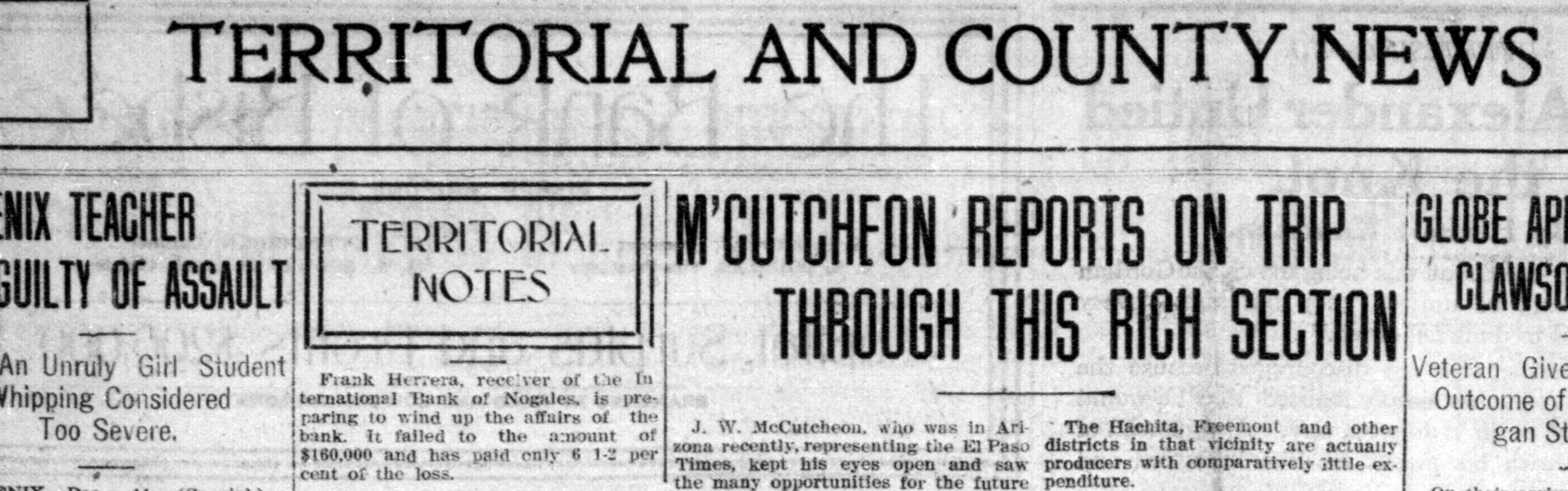 TERRITORIAL AND COUNTY NEWS NIX TEACHER GLOBE API TERRITORIAL M'CUTCHEON REPORTS ON TRIP NOTES GUILTY OF ASSAULT CLAWSO THROUGH THIS RICH SECTION Veteran Give An Unruly Girl Student Frank Herrera, receiver of the In ternational Bank of Nogales, is preOutcome of Whipping Considered paring to wind up the affairs of the J. W. McCutcheon, who was in Ari- The Hachita, Freemont and other Too Severe. bank. It failed to the amount of gan St districts in that vicinity are actually zona recently, representing the El Paso $160,000 and has paid only 6 1-2 per producers with comparatively little exTimes, kept his eyes open and saw cent of the loss. NNW the the many opportunities for the future penditure. Couth .