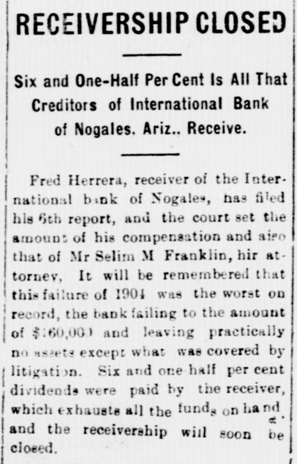 RECEIVERSHIP CLOSED Six and One-Half Per Cent Is All That Creditors of International Bank of Nogales. Ariz.. Receive. Fred Herrera, receiver of the International bank of Nogales, has filed his 6th report, and the court set the amount of his compensation and airo that of Mr Selim M Franklin, hir attorney, It will be remembered that this failure of 1904 was the worst on record, the bank failing to the amount of $160,000 and leaving practically no assets except what was covered by litigation. Six and one half per cent dividends were paid by the receiver, which exhausts all the funds on ha nd R . and the receivership will soon be closed.