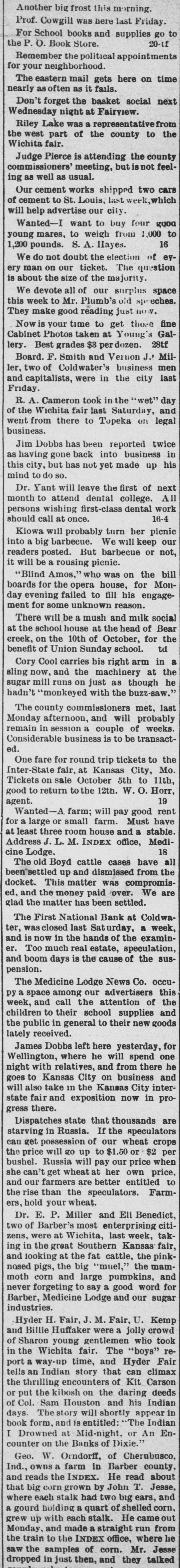 Prof. Cowgill was here last Friday. For School books and supplies go to the P. O. Book Store. 20-tf Remember the political appointments for your neighborhood. The eastern mail gets here on time nearly often as it fails. Don't forget the basket social next Wednesday night at Fairview. Riley Lake was a representative from the west part of the county to the Wichita fair. Judge Pierce is attending the county commissioners' meeting, but is not feeling as well as usual. Our cement works shipped two cars of cement to St. Louis, last week, which will help advertise our city Wanted-I want to buy four good young mares, to weigh from 1,000 to 16 1,200 pounds. S. A. Hayes. We do not doubt the election of eyery man on our ticket. The question is about the size of the majority. We devote all of our surplus space this week to Mr. Plumb's old sp eches. They make good reading just now. Now is your time to get those fine Cabinet Photos taken at Young's Gallery. Best grades $3 perdozen. 28tf Board. F. Smith and Vernon J.! Miller, two of Coldwater's business men and capitalists, were in the city last Friday. R. A. Cameron took in the "wet" day of the Wichita fair last Saturday, and went from there to Topeka on legal business. Jim Dobbs has been reported twice as having gone back into business in this city, but has not yet made up his mind to do so. Dr. Yant will leave the first of next month to attend dental college. All persons wishing first-class dental work 16-4 should call at once. Kiowa will probably turn her picnic into a big barbecue. We will keep our readers posted. But barbecue or not, it will be a rousing picnic. "Blind Amos," who was on the bill boards for the opera house, for Monday evening failed to fill his engagement for some unknown reason. There will be a mush and milk social at the school house at the head of Bear creek, on the 10th of October, for the benefit of Union Sunday school. td Cory Cool carries his right arm in a sling now, and the machinery at the sugar mill runs on just as though he hadn't "monkeyed with the buzz-saw.' The county commissioners met, last Monday afternoon, and will probably remain in session a couple of weeks. Considerable business is to be transacted. One fare for round trip tickets to the Inter-State fair, at Kansas City, Mo. Tickets on sale October 5th to 11th, good to return to the 12th. W. O. Horr, 19 agent. Wanted-A farm; will pay good rent for a large or small farm. Must have at least three room house and a stable. Address J. L. M. INDEX office, Medi18 cine Lodge. The old Boyd cattle cases have all been settled up and dismissed from the docket. This matter was compromised, and the money paid over. We are glad the matter has been settled. The First National Bank at Coldwater, was closed last Saturday, a week, and is now in the hands of the examiner. Too much real estate, speculation, and boom days is the cause of the suspension. The Medicine Lodge News Co. occupy a space among our advertisers this week, and call the attention of the children to their school supplies and the public in general to their new goods lately received. James Dobbs left here yesterday, for Wellington, where he will spend one night with relatives, and from there he goes to Kansas City on business and will also take in the Kansas City interstate fair and exposition now in progress there. Dispatches state that thousands are starving in Russia. If the speculators can get possession of our wheat crops the price will go up to $1.50 or $2 per bushel. Russia will pay our price when she can't get wheat at her own price, and our farmers are better entitled to the rise than the speculators. Farmers, hold your wheat. Dr. E. P. Miller and Eli Benedict, two of Barber's most enterprising citizens, were at Wichita, last week, taking in the great Southern Kansas fair, and looking at the fat cattle, the pinknosed pigs, the big "muel," the mammoth corn and large pumpkins, and never forgeting to say a good word for Barber, Medicine Lodge and our sugar industries. Hyder H. Fair, J. M. Fair, U. Kemp and Billie Huffaker were a jolly crowd of Sharon young gentlemen who took in the Wichita fair. The "boys" report a way-up time, and Hyder Fair tells an Indian story that can climax the thrilling encounters of Kit Carson or put the kibosh on the daring deeds of Col. Sam Houston and his Indian days. The story will shortly appear in book form, and is entitled: "The Indian I Drowned at Mid-night, or An Encounter on the Banks of Dixie." Geo. W. Orndorff, of Cherubusco, Ind., owns a farm in Barber county, and reads the INDEX. He read about that big corn grown by John T. Jesse, where each stalk had two big ears, and a gourd holding a quart of shelled corn. grew up with each stalk. He came out Monday, and made a straight run from the train to the INDEX office, where he saw the samples of corn. Mr. Jesse