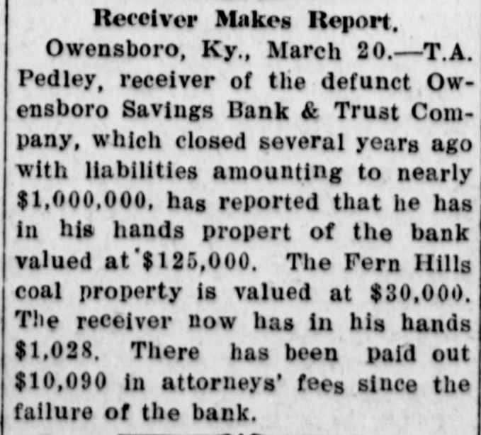 Receiver Makes Report. Owensboro, Ky., March 20.-T.A. Pedley, receiver of the defunct Owensboro Savings Bank & Trust Company, which closed several years ago with liabilities amounting to nearly $1,000,000, has reported that he has in his hands propert of the bank valued at'$125,000. The Fern Hills coal property is valued at $30,000. The receiver now has in his hands $1,028. There has been paid out $10,090 in attorneys' fees since the failure of the bank.