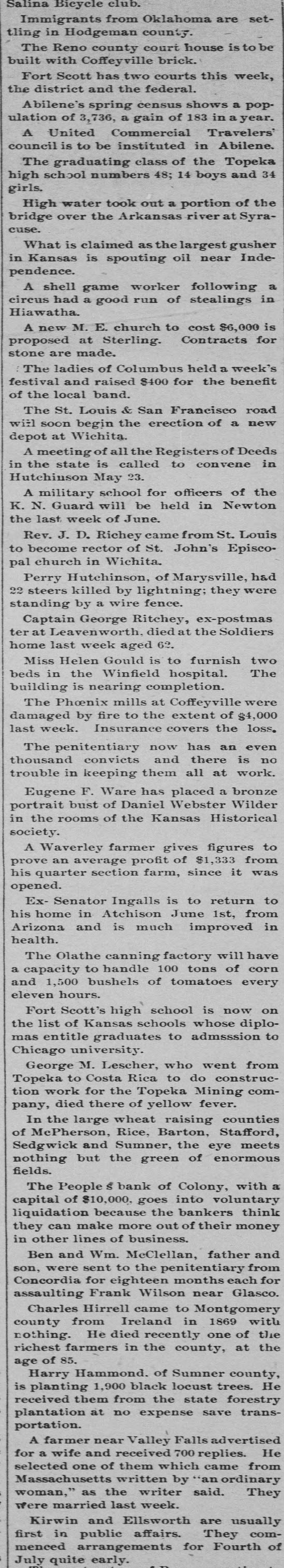 The Reno county court house is to be built with Coffeyville brick. Fort Scott has two courts this week, the district and the federal. Abilene's spring census shows a population of 3,736, a gain of 183 in a year. A United Commercial Travelers' council is to be instituted in Abilene. The graduating class of the Topeka high school numbers 48; 14 boys and 34 girls. High water took out a portion of the bridge over the Arkansas river at Syracuse. What is claimed as the largest gusher in Kansas is spouting oil near Independence. A shell game worker following a circus had a good run of stealings in Hiawatha. A new M. E. church to cost $6,000 is proposed at Sterling. Contracts for stone are made. The ladies of Columbus held a week's festival and raised $400 for the benefit of the local band. The St. Louis & San Francisco road will soon begin the erection of a new depot at Wichita. A meeting of all the Registers of Deeds in the state is called to convene in Hutchinson May 23. A military school for officers of the K. N. Guard will be held in Newton the last week of June. Rev. J. D. Richey came from St. Louis to become rector of St. John's Episcopal church in Wichita. Perry Hutchinson, of Marysville, had 22 steers killed by lightning; they were standing by a wire fence. Captain George Ritchey, ex-postmas ter at Leavenworth, died at the Soldiers home last week aged 62. Miss Helen Gould is to furnish two beds in the Winfield hospital. The building is nearing completion. The Phoenix mills at Coffeyville were damaged by fire to the extent of $4,000 last week. Insurance covers the loss. The penitentiary now has an even thousand convicts and there is no trouble in keeping them all at work. Eugene F. Ware has placed a bronze portrait bust of Daniel Webster Wilder in the rooms of the Kansas Historical society. A Waverley farmer gives figures to prove an average profit of $1,333 from his quarter section farm, since it was opened. Ex- Senator Ingalls is to return to his home in Atchison June 1st, from Arizona and is much improved in health. The Olathe canning factory will have a capacity to handle 100 tons of corn and 1,500 bushels of tomatoes every eleven hours. Fort Scott's high school is now on the list of Kansas schools whose diplomas entitle graduates to admsssion to Chicago university. George M. Lescher, who went from Topeka to Costa Rica to do construction work for the Topeka Mining company, died there of yellow fever. In the large wheat raising counties of McPherson, Rice, Barton, Stafford, Sedgwick and Sumner, the eye meets nothing but the green of enormous fields. The People S bank of Colony, with a capital of $10,000, goes into voluntary liquidation because the bankers think they can make more out of their money in other lines of business. Ben and Wm. McClellan, father and son, were sent to the penitentiary from Concordia for eighteen months each for assaulting Frank Wilson near Glasco. Charles Hirrell came to Montgomery county from Ireland in 1869 with nothing. He died recently one of the richest farmers in the county, at the age of 85. Harry Hammond. of Sumner county, is planting 1,900 black locust trees. He received them from the state forestry n at no sore trans