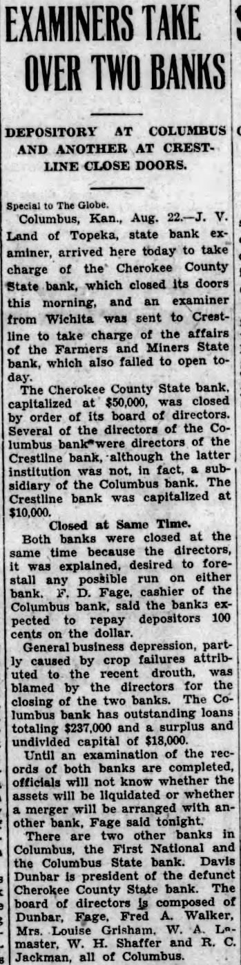 DEPOSITORY AT COLUMBUS AND ANOTHER AT CRESTLINE CLOSE DOORS. Columbus, Kan., Aug. Land of Topeka, state bank exarrived here today to take aminer, of the Cherokee County charge which closed its doors State bank, this and an examiner morning, Wichita was sent to Crestfrom of the affairs line take charge Miners State the Farmers which also failed to open tobank, The Cherokee County State bank. $50,000, closed capitalized at its board of directors. order Several of the directors of the Codirectors of the lumbus although the latter Crestline bank, institution was in fact, Columbus bank. The sidiary the bank was capitalized at Crestline $10,000. Closed at Same Time. Both banks were closed the because the directors, time was explained, desired foreon either stall possible cashier of the bank. Columbus bank, said the banks depositors 100 pected repay cents the dollar. depression, partfailures attribcaused crop the recent drouth, was uted by the directors for the blamed of the two banks. The Coclosing bank has outstanding loans lumbus $237,000 and and totaling undivided capital $18,000. Until examination of the ords both banks are completed, will know whether the officials assets will be liquidated whether arranged with merger other bank, Fage said tonight. There other banks First National and Columbus, Columbus State bank. Davis Dunbar president of defunct County State bank. The Cherokee board directors composed Dunbar, Fage, Fred Walker, Louise Grisham. Shaffer and Jackman, all of Columbus.