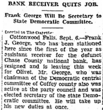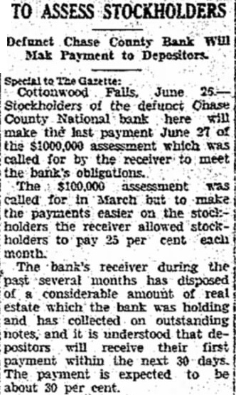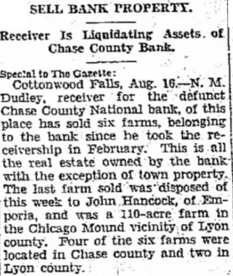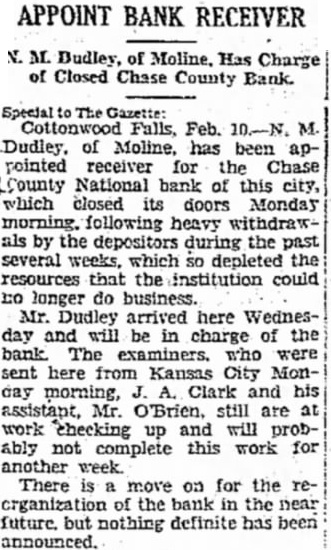 APPOINT BANK RECEIVER N. M. Budley, of Moline. Has Charge of Closed Chase County Bank. Special The Gazette: Cottonwood Falls, Feb. 10.-N. M. Dudley. of Moline, has been appointed receiver for the Chase County National bank of this city, which closed its doors Monday morning. following heavy withdrawals by the depositors during the past several weeks, which so depleted the resources that the institution could DO longer do business. Mr. Dudley arrived here Wednesday and will be in charge of the bank The examiners. who were sent here from Kansas City Monday morning, J. A. Clark and his assistant, Mr. O'Brien, still are at work checking up and will probably not complete this work for another week. There is a move on for the reorganization of the bank in the near future. but nothing definite has been announced.
