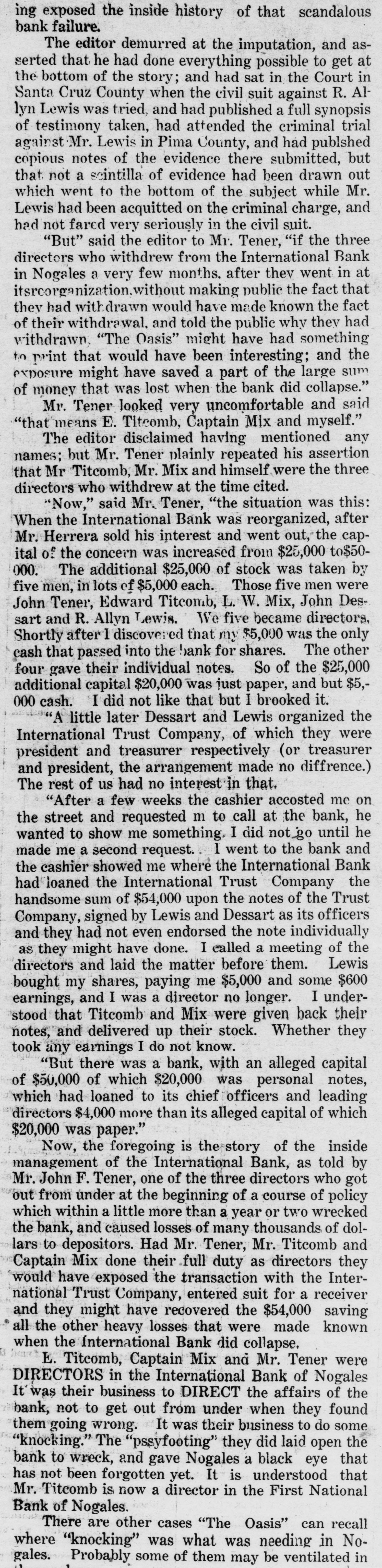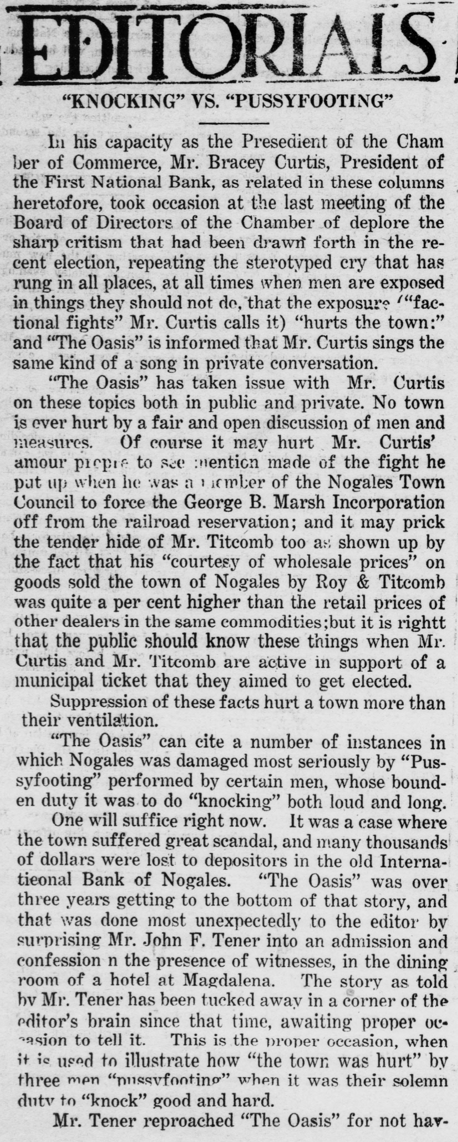 # EDITORIALS "KNOCKING" VS. "PUSSYFOOTING" In his capacity as the Presedient of the Chamber of Commerce, Mr. Bracey Curtis, President of the First National Bank, as related in these columns heretofore, took occasion at the last meeting of the Board of Directors of the Chamber of deplore the sharp critism that had been drawn forth in the recent election, repeating the sterotyped cry that has rung in all places, at all times when men are exposed in things they should not do, that the exposure "factional fights" Mr. Curtis calls it) "hurts the town:" and "The Oasis" is informed that Mr. Curtis sings the same kind of a song in private conversation. "The Oasis" has taken issue with Mr. Curtis on these topics both in public and private. No town is ever hurt by a fair and open discussion of men and measures. Of course it may hurt Mr. Curtis' amour propre to see mention made of the fight he put up when he was a member of the Nogales Town Council to force the George B. Marsh Incorporation off from the railroad reservation; and it may prick the tender hide of Mr. Titcomb too as shown up by the fact that his "courtesy of wholesale prices" on goods sold the town of Nogales by Roy & Titcomb was quite a per cent higher than the retail prices of other dealers in the same commodities; but it is rightt that the public should know these things when Mr. Curtis and Mr. Titcomb are active in support of a municipal ticket that they aimed to get elected. Suppression of these facts hurt a town more than their ventilation. "The Oasis" can cite a number of instances in which Nogales was damaged most seriously by "Pussyfooting" performed by certain men, whose bounden duty it was to do "knocking" both loud and long. One will suffice right now. It was a case where the town suffered great scandal, and many thousands of dollars were lost to depositors in the old International Bank of Nogales. "The Oasis" was over three years getting to the bottom of that story, and that was done most unexpectedly to the editor by surprising Mr. John F. Tener into an admission and confession n the presence of witnesses, in the dining room of a hotel at Magdalena. The story as told by Mr. Tener has been tucked away in a corner of the editor's brain since that time, awaiting proper occasion to tell it. This is the proper occasion, when it is used to illustrate how "the town was hurt" by three men "pussyfooting" when it was their solemn duty to "knock" good and hard. Mr. Tener reproached "The Oasis" for not hav-