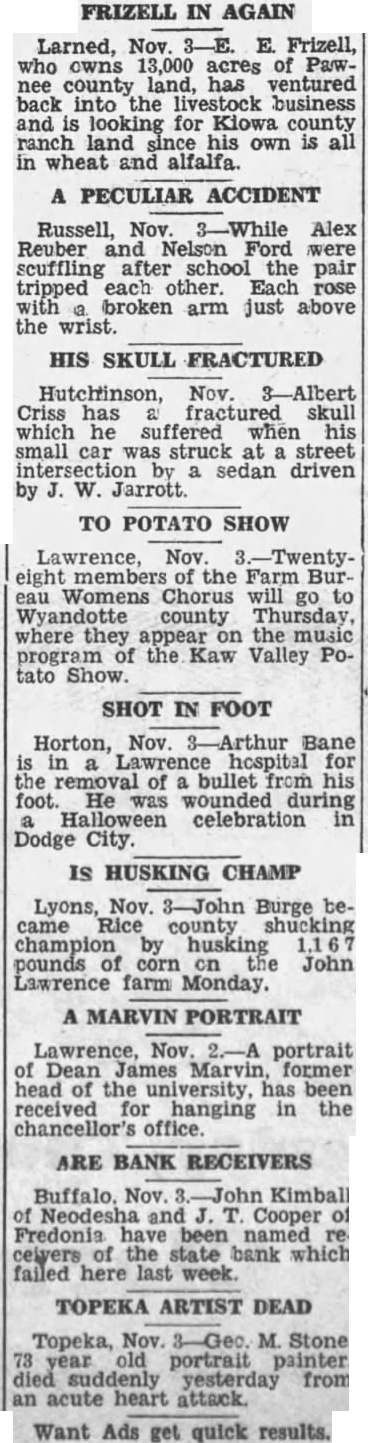 FRIZELL IN AGAIN Larned, Nov. E. Frizell, who owns 13,000 acres of Pawnee county land, has ventured back into the livestock business and looking for Kiowa county ranch land since own is in wheat and alfalfa. A PECULIAR ACCIDENT Russell, Nov. Alex Reuber and Nelson Ford were scuffling after school the pair tripped each other. Each rose broken arm just above the wrist. HIS SKULL FRACTURED Nov. Criss has fractured skull which he suffered when small car was struck at street intersection by sedan driven Jarrott. TO POTATO SHOW Lawrence, Nov. eight members the Farm BurWomens Chorus will go to Wyandotte county Thursday, where they appear on the music the Kaw Valley Poprogram tato Show. SHOT IN FOOT Horton, Nov. Bane in hospital of bullet from his foot. He wounded during celebration in Dodge City. IS HUSKING CHAMP Lyons, Nov. Burge became Rice county shucking champion by husking pounds corn on the John Lawrence farm Monday. MARVIN PORTRAIT Lawrence, Nov. portrait Dean James Marvin, former head of the university, has been received hanging in the chancellor's office. ARE BANK RECEIVERS and Cooper Fredonia been named ceivers of the state bank which here last week. TOPEKA ARTIST DEAD Topeka, Nov. M. Stone, old portrait died suddenly yesterday from acute heart attack. Want Ads get quick results.