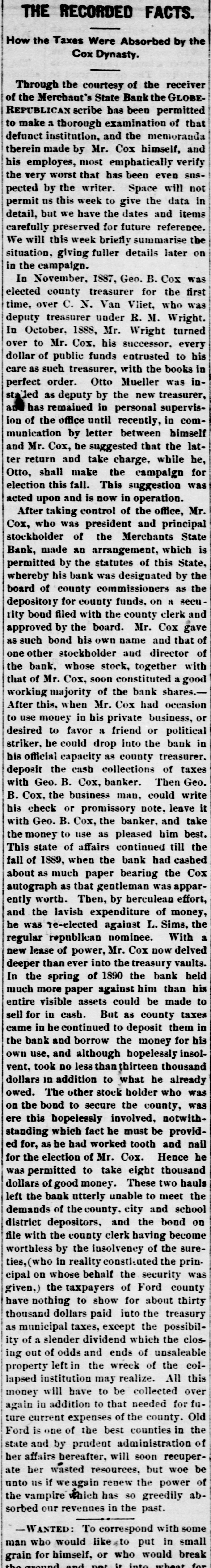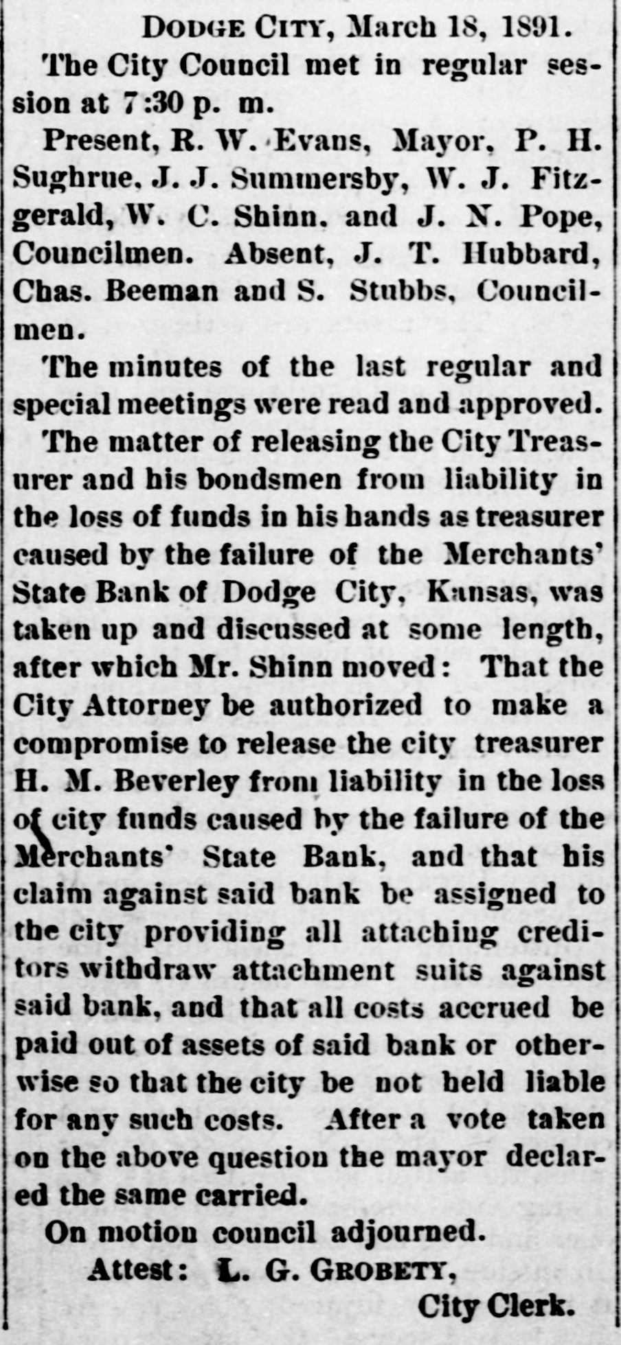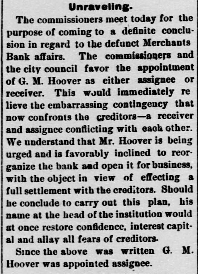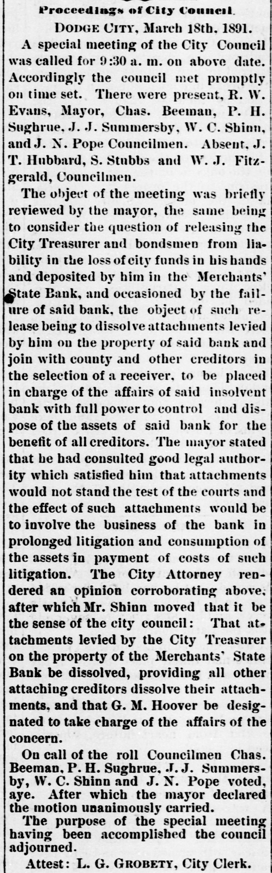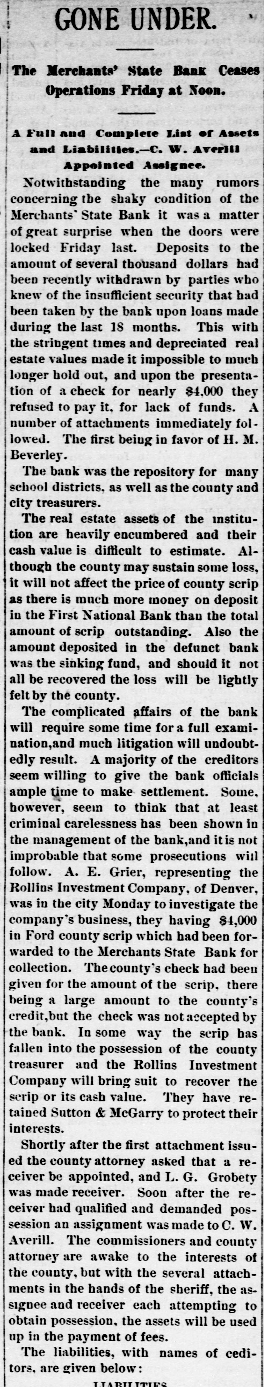 THE DOORS CLOSED. THE MERCHANTS' STATE BANK OF DODGE CITY CLOSES ITS DOORS AT NOON TO-DAY Ata little after 12 o'clock to-day the doors of the Merchants' State Bank of this city were closed. For some time ugly rumors were afloat regarding the shaky condition of the institution and this led to the withdrawal of a large amount of deposits. These increased of late and the withdrawal of depos its amounted to practically a run on the bank. It is understood that the bank le nt a large amount of money on paper, and failed to take sufficient security during its earlier days. This it was able to carry until the hard times set in and the stringency in monetary matters came about. Large sums of money were loaned on individuals' notes, and no security of any kind was obtained. The collapse of the boom period and the stringency left the borrowers unable to meet their obligations. The bank was the depository of county funds. of many district schools and some townships: also of the city and and city school funds. The immediate cause of the closing was an attachment for $3,500 gotten out by City Treasurer Beverly. Mr. Beverly drew a check for the amount on the bank, but it was not paid for lack of funds. Two hours time 6 was given to procure the amount, but t this did not avail and the attachment P was issued. The bank is in arrears on the county funds to the amount of a $16,950. Other depositors or losers are as follows. John Riney, $430; school district 16, $118; John Kilburn, $100Grand View township, $400; L. E. McGarry, $100; Strange Summersby, $700; L Oliver Ellswick, a farmer living north of c town, $800; A. O. U. W. Lodge, $175. a This makes a total of $22,773, but there to are other depositors whose names could et not be learned. The city school funds, a amounting to $4,000, were recently withti drawn and placed in the First National. th Several attachments were gotten out be al sides that of City Treasurer Beverley's. u The appraisement of property is now p taking place. The bank owned a large T amount of real estate, though that al turned over by the Cox assignment is in encumbered, and but a small amount te could be realized on it above the mortle gages. Its most valuable possession is the block consisting of the City Drug al Store, bank and post office building. Not per a dollar of funds is left in the vaults. th H. J. Strange. president of the institupl tion, told the TIMES man that the county ca would lose nothing by the closing of the dr bank, and Commissioner McKinney who was looking after the county's interest, expressed the same opinion, The law, relif quires banks, where county funds are co deposited. to give a bond, and while it is said such a bond was given in this case, st on Deputy County Clerk Crane was unable to find a record of it when the TIMES ro W man called. There is a difference of ta opinion as to whether or not the bondsmen of the county treasurer can be held go are for the funds. as it is claimed they are released from obligation when funds are ro ba deposited elsewhere than in the treasurho er's office. We understand that some as $15,000 of county funds are deposited with the First National, The affairs of Pu bu the institution are in such a complicated condition that it is difficult to get at the eas facts, Following is the statement of the an ed condition of the bank made in January: