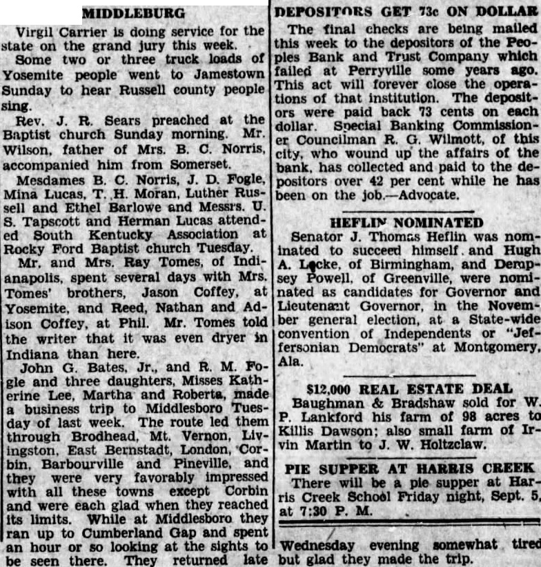 MIDDLEBURG Virgil Carrier is doing service for the state on the grand jury this week. Some two or three truck loads of Yosemite people went to Jamestown Sunday to hear Russell county people sing. Rev. J. R. Sears preached at the Baptist church Sunday morning. Mr. Wilson. father of Mrs. B. C. Norris, accompanied him from Somerset. Mesdames B. C. Norris, J. D. Fogle, Mina Lucas. T. H Moran, Luther Russell and Ethel Barlowe and Messrs. U. S. Tapscott and Herman Lucas attended South Kentucky Association at Rocky Ford Baptist church Tuesday. Mr. and Mrs. Ray Tomes, of Indianapolis, spent several days with Mrs. Tomes' brothers, Jason Coffey, at Yosemite, and Reed, Nathan and Adison Coffey, at Phil. Mr. Tomes told the writer that it was even dryer in Indiana than here. John G. Bates. Jr., and R. M. Fogle and three daughters, Misses Katherine Lee, Martha and Roberta, made a business trip to Middlesboro Tuesday of last week. The route led them through Brodhead, Mt. Vernon, Livingston, East Bernstadt, London, Corbin, Barbourville and Pineville, and they were very favorably impressed with all these towns except Corbin and were each glad when they reached its limits. While at Middlesboro they DEPOSITORS GET 73c ON DOLLAR The final checks are being mailed this week to the depositors of the Peoples Bank and Trust Company which failed at Perryville some years ago. This act will forever close the operations of that institution. The depositors were paid back 73 cents on each dollar. Special Banking Commissioner Councilman R. G. Wilmott, of this city, who wound up the affairs of the bank. has collected and paid to the depositors over 42 per cent while he has been on the job.-Advocate. $12,000 REAL ESTATE DEAL Baughman & Bradshaw sold for W. P. Lankford his farm of 98 acres to Killis Dawson; also small farm of Irvin Martin to J. W. Holtzclaw. PIE SUPPER AT HARRIS CREEK There will be a pie supper at Harris Creek School Friday night, Sept. 5, at 7:30 P. M. ran up to Cumberland Gap and spent an hour or so looking at the sights to Wednesday evening somewhat tired be seen there. They returned late but glad they made the trip.