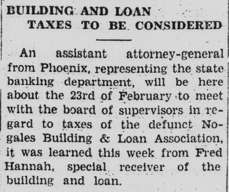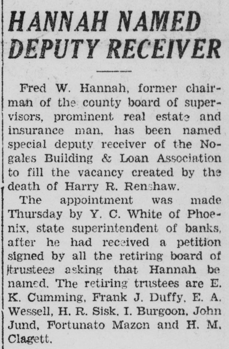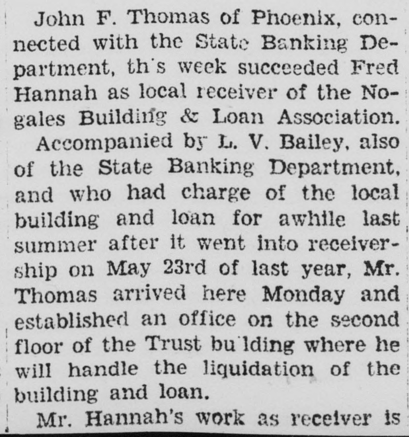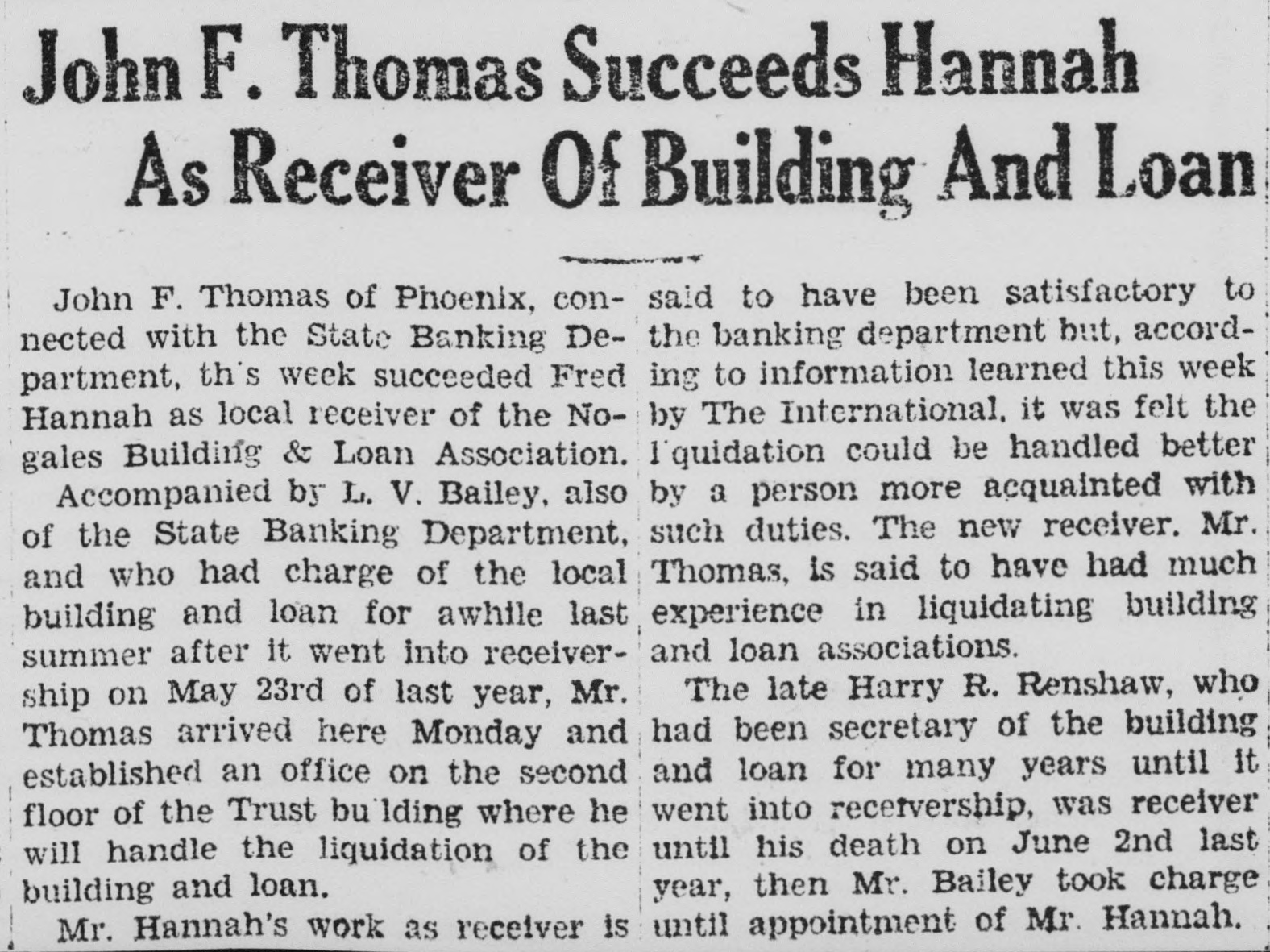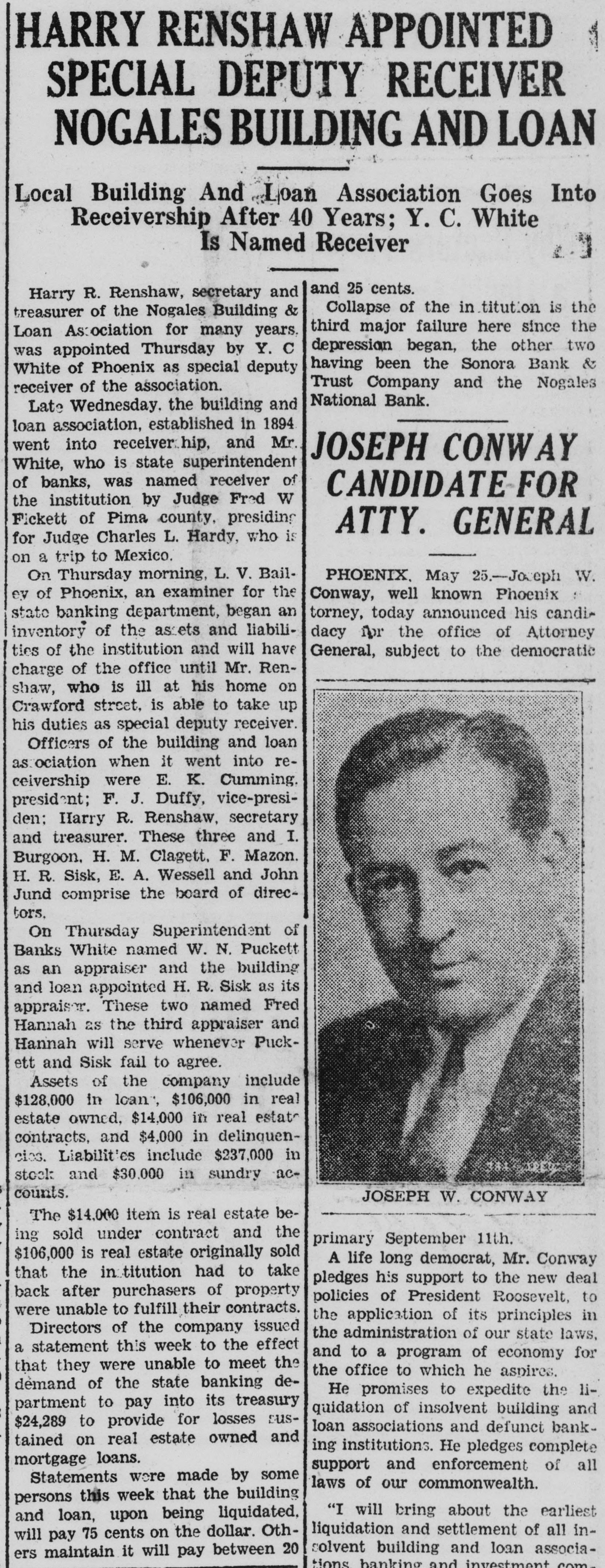 HARRY RENSHAW APPOINTED SPECIAL DEPUTY RECEIVER NOGALES BUILDING AND LOAN Local Building And Loan Association Goes Into Receivership After 40 Years; Y. C. White Is Named Receiver and 25 cents. Harry R. Renshaw, secretary and Collapse of the in titution is the treasurer of the Nogales Building & third major failure here since the Loan As: ociation for many years. depression began, the other two was appointed Thursday by Y. C having been the Sonora Bank & White of Phoenix as special deputy Trust Company and the Nogales receiver of the association. National Bank. Late Wednesday. the building and loan association, established in 1894 went into receiver: hip, and Mr. JOSEPH CONWAY White, who is state superintendent of banks, was named receiver of CANDIDATE-FOR the institution by Judge Fred W Fickett of Pima county, presiding ATTY. GENERAL for Judge Charles L. Hardy, who is on a trip to Mexico. On Thursday morning, L. V. BailPHOENIX, May 25.-Joceph W. ey of Phoenix, an examiner for the Conway, well known Phoenix state banking department, began an torney, today announced his candiinventory of the assets and liabilidacy for the office of Attorney ties of the institution and will have General, subject to the democratic charge of the office until Mr. Renshaw, who is ill at his home on Crawford street, is able to take up his duties as special deputy receiver. Officers of the building and loan as ociation when it went into receivership were E. K. Cumming. president; F. J. Duffy, vice-presiden: Harry R. Renshaw, secretary and treasurer. These three and I. Burgoon. H. M. Clagett. F. Mazon. H. R. Sisk, E. A. Wessell and John Jund comprise the board of directors. On Thursday Superintendent of Banks White named W. N. Puckett as an appraiser and the building and loan appointed H. R. Sisk as its appraisor. These two named Fred Hannah as the third appraiser and Hannah will serve whenever Puckett and Sisk fail to agree. Assets of the company include $128,000 in loan, $106,000 in real estate owned, $14,000 in real estat contracts, and $4,000 in delinquencics. Liabilities include $237,000 in 383 stock and $30.000 in sundry accounts. JOSEPH W. CONWAY The $14,000 item is real estate being sold under contract and the primary September 11th. $106,000 is real estate originally sold A life long democrat, Mr. Conway that the in titution had to take pledges his support to the new deal back after purchasers of property policies of President Roosevelt, to were unable to fulfill their contracts. the application of its principles in Directors of the company issued the administration of our state laws, a statement this week to the effect and to a program of economy for that they were unable to meet the the office to which he aspires. demand of the state banking deHe promises to expedite the lipartment to pay into its treasury quidation of insolvent building and $24,289 to provide for losses susloan associations and defunct banktained on real estate owned and ing institutions. He pledges complete mortgage loans. support and enforcement of all Statements were made by some laws of our commonwealth. persons this week that the building "I will bring about the earliest and loan, upon being liquidated, liquidation and settlement of all inwill pay 75 cents on the dollar. Othsolvent building and loan associaers maintain it will pay between 20 tions banking and investment com.
