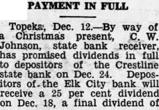 PAYMENT IN FULL Topeka, Dec. 12.-By way of a Christmas present, C. W. Johnson, state bank receiver, has promised dividends in full to depositors of the Crestline state bank on Dec. 24. Depositors of the Elk City bank will receive a 25 per cent dividend on Dec. 18, a final dividend of