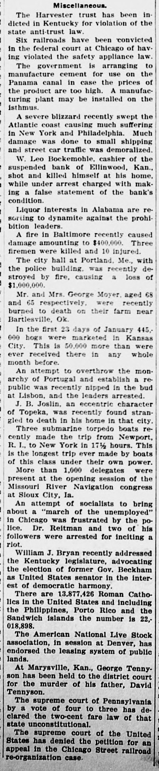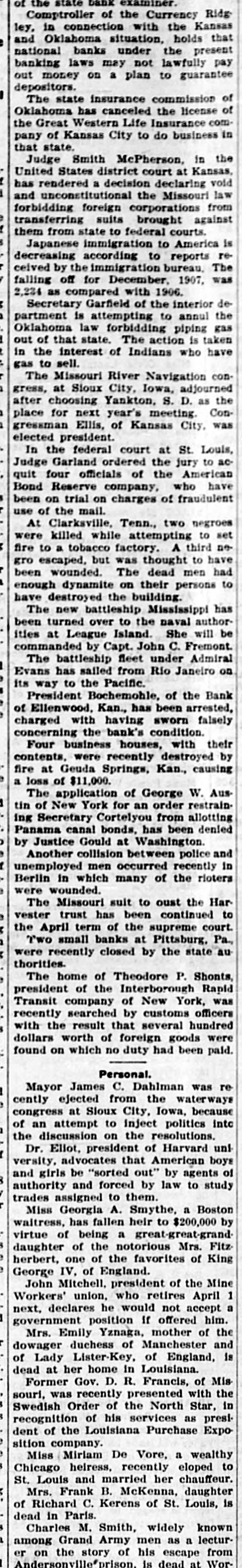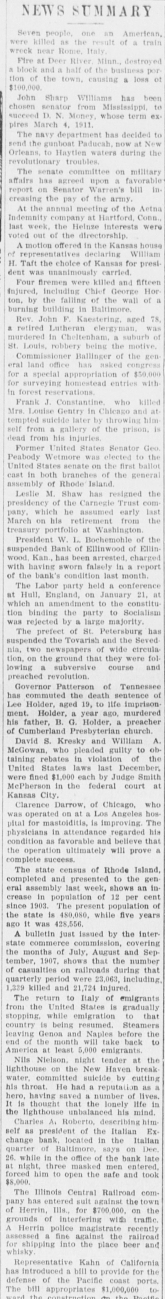 NEWS SUMMARY Seven people, one an American, were killed as the result of a train wreck near Rome, Italy. Fire at Deer River Minn., destroyed a block and a half of the business portion of the town, causing a loss of $100,000. John Sharp Williams has been chosen senator from Mississippi, to succeed D. N. Money, whose term ex. pires March 4, 1911. The navy department has decided to send the gunboat Paducah, now at New Orleans, to Haytien waters during the revolutionary troubles. The senate committee on military affairs has agreed upon a favorable report on Senator Warren's bill in. creasing the pay of the army. At the annual meeting of the Aetna Indemnity company at Hartford, Conn. last week. the Heinze interests were voted out of the directorship. A motion offered in the Kansas house of representatives declaring William H. Taft the choice of Kansas for president was unanimously carried. Four firemen were killed and fifteen Injured, including Chief George Hor ton. by the falling of the wall of a burning building in Baltimore. Rev. John F. Kaestering, aged 78, a retired Lutheran elergyman, was murdered in Cheltenham, a suburb of St. Louis, robbery being the motive. Commissioner Ballinger of the general land office has asked congress for a special appropriation of $50,000 for surveying homestead entries with in forest reservations. Frank J. Constantine. who killed Mrs. Louise Gentry in Chicago and at tempted suicide later by throwing him self from a gallery of the prison, is dead from his injuries. Former United States Senator Geo. Peabody Wetmore was elected to the United States senate on the first ballot cast in both branches of the general assembly of Rhode Island. Leslie M. Shaw has resigned the presidency of the Carnegie Trust company, which he assumed early last March on his retirement from the treasury portfolio at Washington. President W. L. Bochemohle of the suspended Bank of Ellinwood of Ellinwood. Kan., has been arrested. charged with having sworn falsely in a report of the bank's condition last month. The Labor party held a conference at Hull, England, on January 21, at which an amendment to the constitution binding the party to Socialism was rejected by a large majority. The prefect of St. Petersburg has suspended the Tovarish and the Seved nia, two newspapers of wide circulation, on the ground that they were following a subversive course and preached revolution. Governor Patterson of Tennessee has commuted the death sentence of Lee Holder, aged 19, to life imprison ment. Holder, a year ago, murdered his father, B. G. Holder, a preacher of Cumberland Presbyterian church. David S. Kresky and William A. McGowan, who pleaded guilty to obtaining rebates in violation of the United States laws last December. were fined $1,000 each by Judge Smith McPherson in the federal court at Kansas City. Clarence Darrow, of Chicago, who was operated on at a Los Angeles hospital for mastoiditis, is improving. The physicians in attendance regarded his condition as favorable and believe that the operation ultimately will prove a complete success. The state census of Rhode Island, completed and presented to the general assembly last week, shows an increase in population of 12 per cent since 1903. The present population of the state is 480,080, while five years ago it was 428,556. A bulletin just issued by the interstate commerce commission, covering the months of July, August and September, 1907, shows that the number of casualties on railroads during that quarterly period were 23,063, including, 1,339 killed and 21,724 injured. The return to Italy of emigrants from the United States is gradually stopping, while emigration to that country is being resumed. Steamers leaving Genoa and Naples before the end of the month will take back to America at least 5,000 emigrants. Nils Nielson, night tender at the lighthouse on the New Haven break water. committed suicide by cutting his throat. He had a reputation as a hero, having saved a number of lives. It is thought that the lonely life in the lighthouse unbalanced his mind. Charles As Roberto, describing himself as president of the Italian Exchange bank, located in the Italian quarter of Baltimore, says on Dec. 26. while in the office of the bank late at night, three masked men entered. forced him to open the safe and took $8,000. The Illinois Central Railroad company has entered suit against the town of Herrin, Ills., for $700,000, on the grounds of interfering with traffic. A Herrin police magistrate recently assessed a fine against the railroad for shipping into the place beer and whisky. Representative Kahn of California has introduced a bill to provide for the