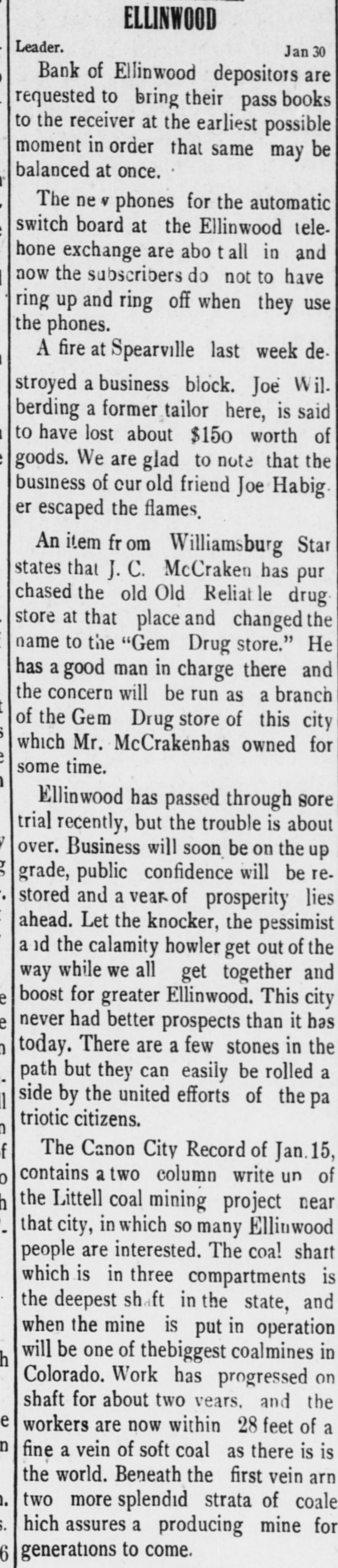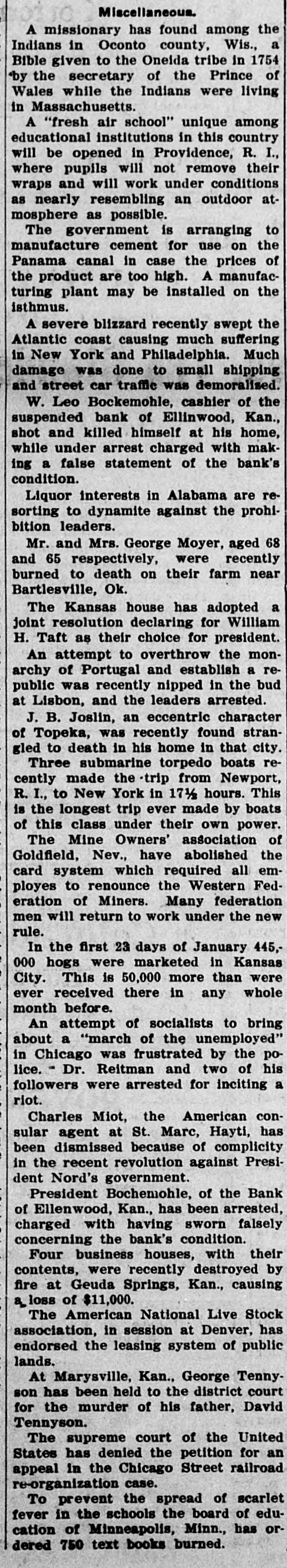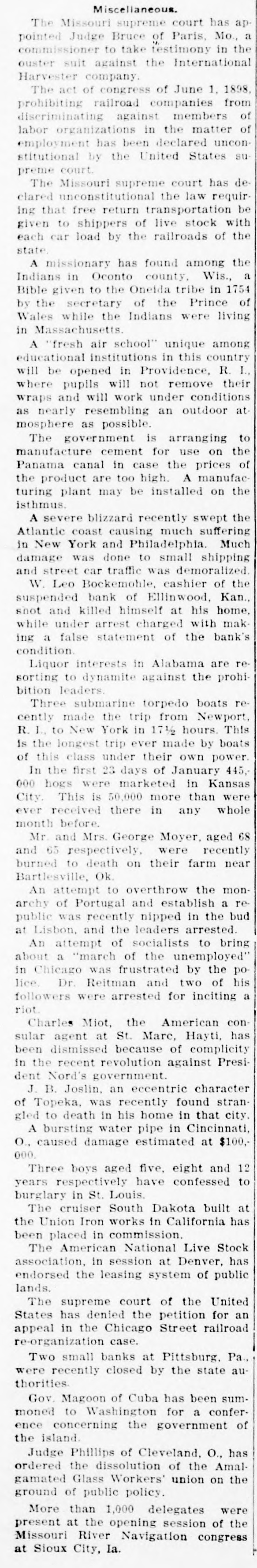 NEWS SUMMARY Seven people, one an American, were killed as the result of a train wreck near Rome, Italy. Fire at Deer River Minn., destroyed a block and a half of the business portion of the town, causing a loss of $100,000. John Sharp Williams has been chosen senator from Mississippi, to succeed D. N. Money, whose term ex. pires March 4, 1911. The navy department has decided to send the gunboat Paducah, now at New Orleans, to Haytien waters during the revolutionary troubles. The senate committee on military affairs has agreed upon a favorable report on Senator Warren's bill in. creasing the pay of the army. At the annual meeting of the Aetna Indemnity company at Hartford, Conn. last week. the Heinze interests were voted out of the directorship. A motion offered in the Kansas house of representatives declaring William H. Taft the choice of Kansas for president was unanimously carried. Four firemen were killed and fifteen Injured, including Chief George Hor ton. by the falling of the wall of a burning building in Baltimore. Rev. John F. Kaestering, aged 78, a retired Lutheran elergyman, was murdered in Cheltenham, a suburb of St. Louis, robbery being the motive. Commissioner Ballinger of the general land office has asked congress for a special appropriation of $50,000 for surveying homestead entries with in forest reservations. Frank J. Constantine. who killed Mrs. Louise Gentry in Chicago and at tempted suicide later by throwing him self from a gallery of the prison, is dead from his injuries. Former United States Senator Geo. Peabody Wetmore was elected to the United States senate on the first ballot cast in both branches of the general assembly of Rhode Island. Leslie M. Shaw has resigned the presidency of the Carnegie Trust company, which he assumed early last March on his retirement from the treasury portfolio at Washington. President W. L. Bochemohle of the suspended Bank of Ellinwood of Ellinwood. Kan., has been arrested. charged with having sworn falsely in a report of the bank's condition last month. The Labor party held a conference at Hull, England, on January 21, at which an amendment to the constitution binding the party to Socialism was rejected by a large majority. The prefect of St. Petersburg has suspended the Tovarish and the Seved nia, two newspapers of wide circulation, on the ground that they were following a subversive course and preached revolution. Governor Patterson of Tennessee has commuted the death sentence of Lee Holder, aged 19, to life imprison ment. Holder, a year ago, murdered his father, B. G. Holder, a preacher of Cumberland Presbyterian church. David S. Kresky and William A. McGowan, who pleaded guilty to obtaining rebates in violation of the United States laws last December. were fined $1,000 each by Judge Smith McPherson in the federal court at Kansas City. Clarence Darrow, of Chicago, who was operated on at a Los Angeles hospital for mastoiditis, is improving. The physicians in attendance regarded his condition as favorable and believe that the operation ultimately will prove a complete success. The state census of Rhode Island, completed and presented to the general assembly last week, shows an increase in population of 12 per cent since 1903. The present population of the state is 480,080, while five years ago it was 428,556. A bulletin just issued by the interstate commerce commission, covering the months of July, August and September, 1907, shows that the number of casualties on railroads during that quarterly period were 23,063, including, 1,339 killed and 21,724 injured. The return to Italy of emigrants from the United States is gradually stopping, while emigration to that country is being resumed. Steamers leaving Genoa and Naples before the end of the month will take back to America at least 5,000 emigrants. Nils Nielson, night tender at the lighthouse on the New Haven break water. committed suicide by cutting his throat. He had a reputation as a hero, having saved a number of lives. It is thought that the lonely life in the lighthouse unbalanced his mind. Charles As Roberto, describing himself as president of the Italian Exchange bank, located in the Italian quarter of Baltimore, says on Dec. 26. while in the office of the bank late at night, three masked men entered. forced him to open the safe and took $8,000. The Illinois Central Railroad company has entered suit against the town of Herrin, Ills., for $700,000, on the grounds of interfering with traffic. A Herrin police magistrate recently assessed a fine against the railroad for shipping into the place beer and whisky. Representative Kahn of California has introduced a bill to provide for the