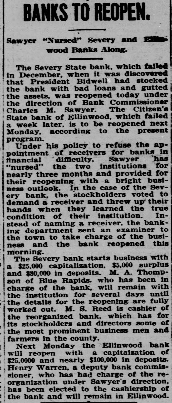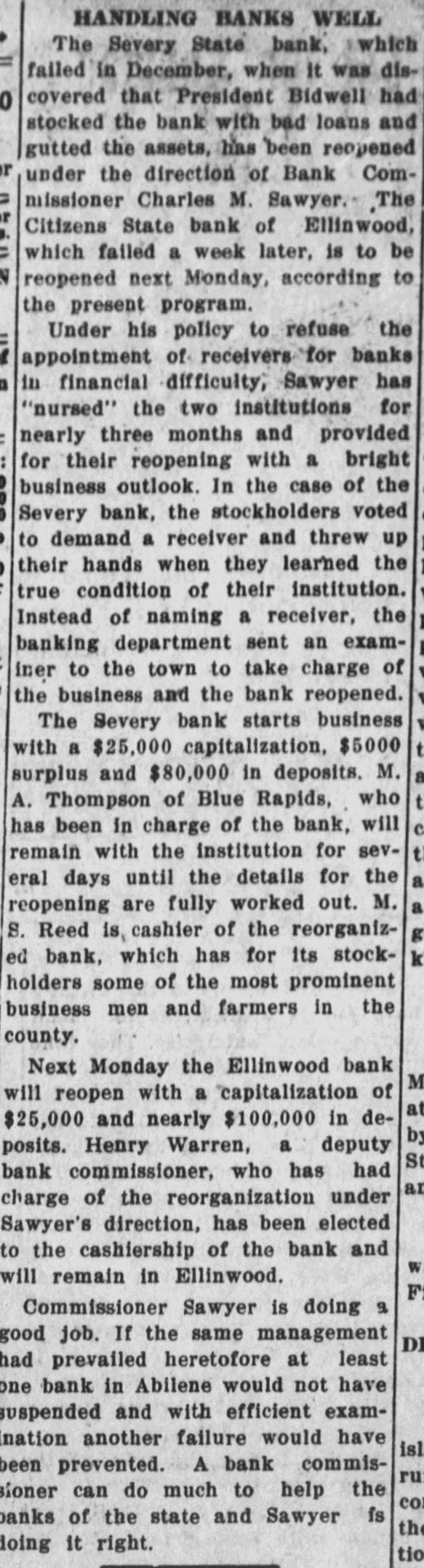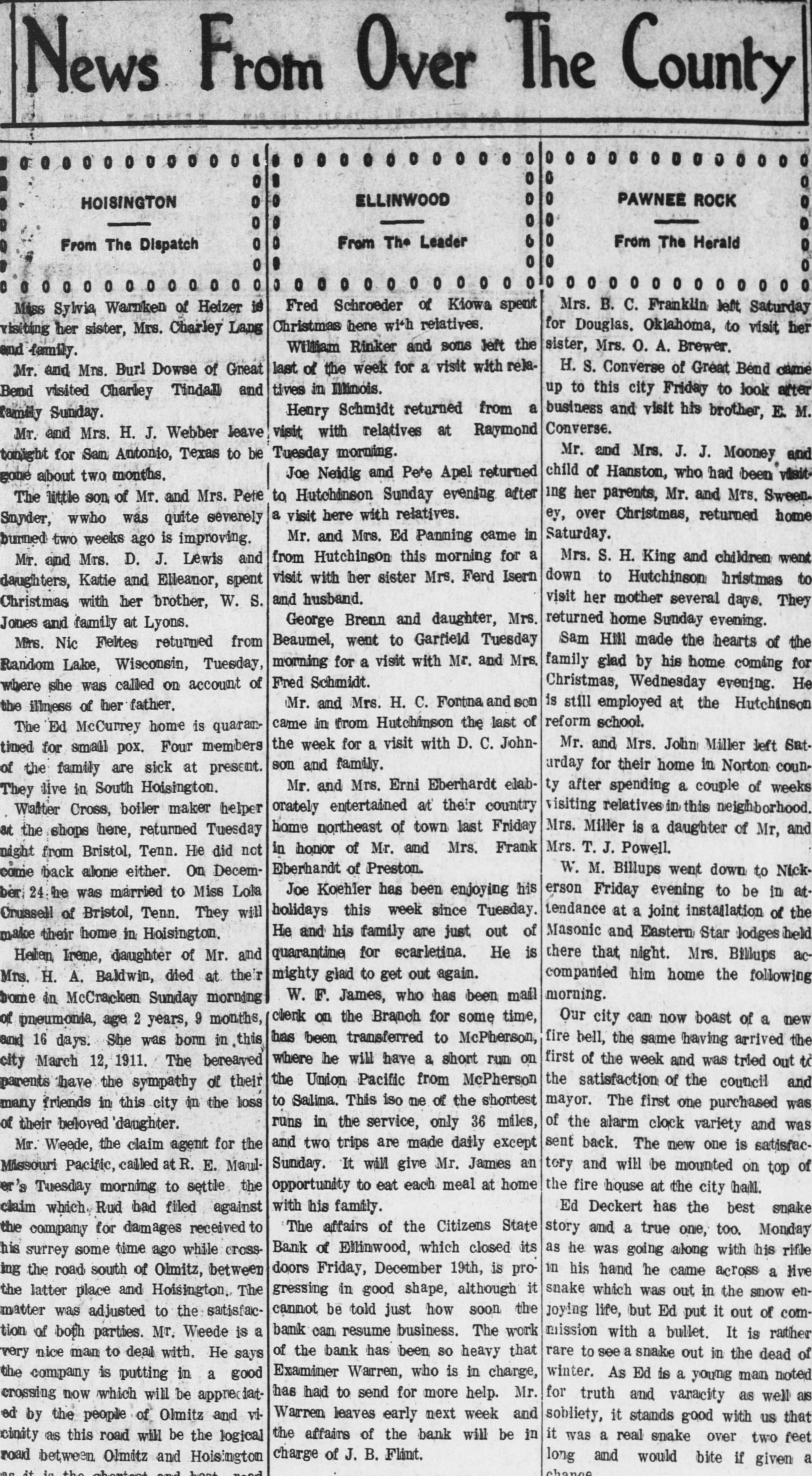 News From Over The County 0 0 0 e 0 0 I 0 0 0 0 PAWNEE ROCK 0 ELLINWOOD 0 0 HOISINGTON 0 0 0 o 0 B 0 0 From The Herald 0 From The Leader 0 0 From The Dispatch Q 0 0 e 0 0 0 0 0 0 0 0 0 0 0 0 0 0 0 0 0 0 0 0 0 0 Fred Schroeder of Kiowa spent Mrs. B. C. Franklin left Saturday Miss Sylvia Warnken of Heizer is Christmas here with relatives. for Douglas. Oklahoma, to visit her visiting her sister, Mrs. Charley Lang sister, Mrs. O. A. Brewer. William Rinker and sons left the and family. H. S. Converse of Great Bend came last of the week for a visit with relaMr. and Mrs. Burl Dowse of Great tives in Illinois. up to this city Friday to look after Bend visited Charley Tindall and business and visit his brother, E. M. Henry Schmidt returned from a family Sunday. Converse. visit with relatives at Raymond Mr. and Mrs. H. J. Webber leave Mr. and Mrs. J. J. Mooney and tonight for San Antonio, Texas to bie Tuesday morning. child of Hanston, who had been visit Joe Neidig and Pete Apel returned gobie about two months. ing her parents, Mr. and MTS. Sween. to Hutchinson Sunday evening after The little son of Mr. and Mrs. Pete a visit here with relatives. ey, over Christmas, returned home Snyder, wwho was quite sevenely Saturday. Mr. and Mrs. Ed Panning came in burned two weeks ago is improving. from Hutchingon this morning for a Mrs. S. H. King and children went Mr. and Mrs. D. J. Lewis and visit with her sister Mrs. Ferd Isern down to Hutchinson hristmas to daughters, Katie and Elleanor, spent and husband. visit her mother several days. They Christmas with her brother, W. S. returned home Sunday evening. George Brenn and daughter, Mrs. Jones and family at Lyons. Beaumel, went to Garfield Tuesday Sam Hill made the hearts of the Mrs. Nic Fleites returned from morning for a visit with Mr. and Mrs. family glad by his home coming for Random Lake, Wisconsin, Tuesday, Fred Schmidt. Christmas, Wednesday evening. He where she was called on account of Mr. and Mrs. H. C. Fontna and son is still employed at the Hutchinson the illness of her father. reform school. came in from Hutchinson the last of The Ed McCurrey home is quaramthe week for a visit with D. C. JohnMr. and Mrs. John Miller left Sattined for small pox. Four members son and family. arday for their home in Norton counof the family are sick at present. Mr. and Mrs. Erni Eberhardt elabty after spending a couple of weeks They live in South Hoisington. visiting relatives in this neighborhood. orately entertained at their country Waiter Cross, boiler maker helper home northeast of town last Friday Mrs. Miller is a daughter of Mr, and at the shops here, returned Tuesday Mrs. T. J. Powell. in honor of Mr. and Mrs. Frank night from Bristol, Tenn. He did not Eberhandt of Preston. W. M. Billups went down to Nickcome back alone either. On DecemJoe Koehler has been enjoying his erson Friday evening to be in at ber 24 he was married to Miss Lola tendance at a joint installation of the holidays this week since Tuesday. Crussell of Bristol, Tenn. They will He and his family are just out of Masonic and Eastern Star lodges held make their home in Hoisington. quarantine for scarletina. He is there that night. Mrs. Billups acHelen Irene, daughter of Mr. and mighty glad to get out again. companied him home the following Mrs. H. A. Baldwin, died at their morning. W. F. James, who has been mail home in McCracken Sunday morning clerk on the Branch for some time, Our city can now boast of a new of pneumonia, age 2 years, 9 months, has been transferred to McPherson, fire bell, the same having arrived the and 16 days. She was born in this where he will have a short run on first of the week and was tried out tc city March 12, 1911. The bereayed the Union Pacific from McPherson the satisfaction of the council and parents have the sympathy of their to Salina. This iso me of the shortest mayor. The first one purchased was many friends in this city in the loss runs in the service, only 36 miles, of their beloved daughter. of the alarm clock variety and was sent back. The new one is satisfacand two trips are made daily except Mr. Weede, the claim agent for the Sunday. It will give Mr. James an Missouri Pacific, called at R. E. Maultory and will be mounted on top of opportunity to eat each meal at home the fire house at the city hall. er's Tuesday morning to settle the with his family. Ed Deckert has the best snake claim which Rud had filed against The affairs of the Citizens State story and a true one, too. Monday the company for damages received to Bank of Ellinwood, which closed its as he was going along with his rifle his surrey some time ago while crossin his hand he came across a live doors Friday, December 19th, is proing the road south of Olmitz, between snake which was out in the snow engressing in good shape, although it the latter place and Hoisington. The cannot be told just how soon the matter was adjusted to the satisfacjoying life, but Ed put it out of combank can resume business. The work mission with a bullet. It is rather tion of both parties. Mr. Wieede is a of the bank has been so heavy that rare to see a snake out in the dead of very nice man to deal with. He says Examiner Warren, who is in charge, the company is putting in a good winter. As Ed is a young man noted has had to send for more help. Mr. crossing now which will be appreciatfor truth and varacity as well als Warren leaves early next week and ed by the peopile of Olmitz and visobliety, it stands good with us that the affairs of the bank will be in it was a real snake over two feet cinity as this road will be the logical charge of J. B. Flint. road between Olmitz and Hoisington long and would bite if given a 0.0 it in the abortect and heat "nod chance