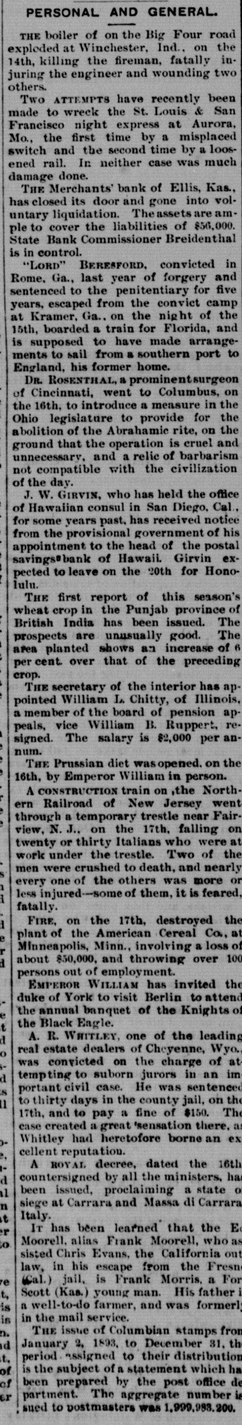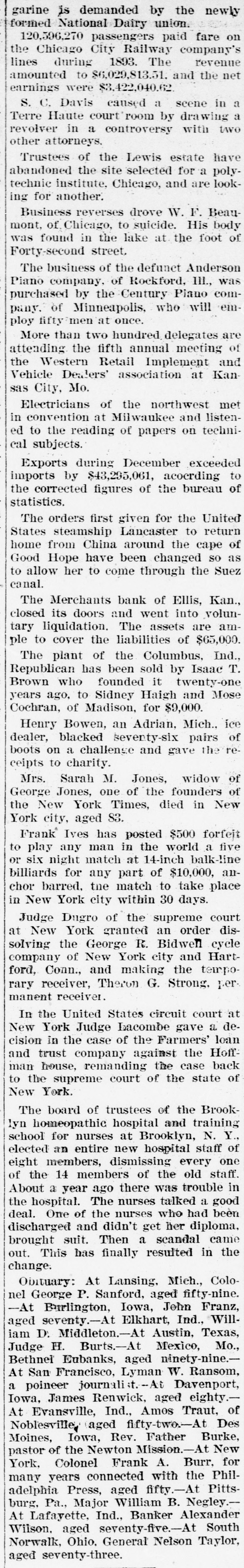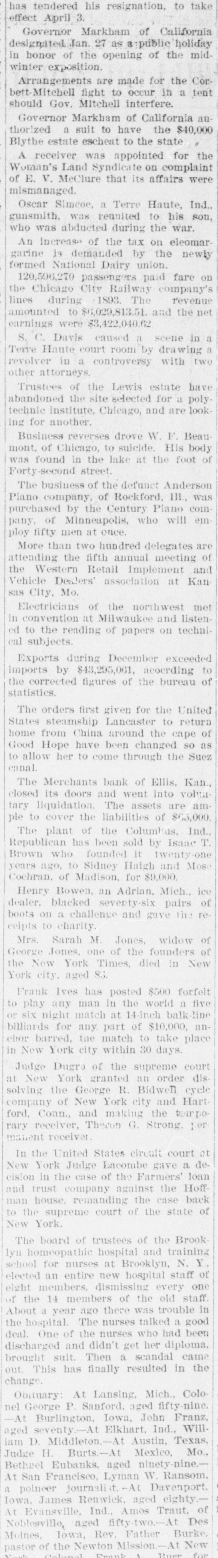 # FINANCIAL AND INDUSTRIAL -The Merchants Bank of Eilis. Kan., closed its doors Monday and went into voluntary liquidation. The asses are ample to cover the liabilities of $65,000. State Bank Commissioner Breidenthal has been sent for to take control. -The strike at the Charleroi plate-glass works at Pittsburg has developed trouble that may result in violence and bloodshed. Monday a party of nonunion men were taken to the works and assigned to the packing department. The strikers regarded this as the beginning of an arrangement to fill the works with nonunion men, and accosted a party of the new men, to induce them not to help break the strike. There was a row, in which several shots were fired, but nobody was hit. The strikers insist that the nonunion workmen did the shooting. The sheriff and three deputies arrived during the afternoon, and eight arrests Here made. Tuesday morning those arrested were released on bail in $300 each for trial at court. The indications are that trouble will follow. -The Wood Harvester Company was victorious in its suit against the Esterly concern for infringement of patent. -Judgment for nearly $200.000 was confessed by the Ohio Valley Road in favor of the Chesapeake, Obio and Southwestern. -Executions aggregating $18,000 were issued against George A. Ruth & Co., Philadelphia, dealers in chinaware. -R. G. Dan & Co.'s Weekly Review of Trade says: Lusiness has distinctly improved since the new year came, and the gain is no longer visible only in speculative markets. It is the only kind of improvement that has in it possibilities of lasting, because it is based upon actuail increase in the production of industries. As all rejoice to see it, there is perhaps a little disposition to reckon the gain greater than it is as yet, but several large establishments have started part force hoping to increase, and more smaller works have started than have stopped. Orders from dealers whose stocks approach exhaustion form a prominent cause; another is the widely prevalent impression that action at Washington will be more satisfactory than many have expected; and a belief that in any case the situation will not be changed until goods now iu the works can be marketed has weight in some trades. Whatever the causes even a moderate gain is most cheering.