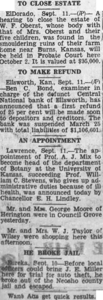 TO CLOSE ESTATE ElDorado, Sept. 11.-(P)hearing to close the estate of W. F. Oberst, whose body with that of Mrs. Oberst and their five children, was found in the smouldering ruins of their farm home near Burns, Kansas, will be held in Probate Court here October 2. It is valued at $25,000. TO MAKE REFUND Ellsworth, Kan., Sept. 11.-(P) Ben C. Bond, examiner in charge of the defunct Central National bank of Ellsworth, has announced that a first refund of 25 per cent will be made soon to depositors and creditors. The bank was suspended March 25 with total liabilities of $1,106,601. AN APPOINTMENT Lawrence, Sept. appointment of Prof A. J. Mix to become head of the department of Botany at the University of Kansas, succeeding Prof. William C. Stevens, who gives up administrative duties because of ill health, was announced today by Chancellor E. H. Lindley. Mr. and Mrs. George Moore of Herington were in Council Grove yesterday. Mr. and Mrs. W. J. Taylor of Wilsey were shopping here this HE BROKE JAIL officers could bring J. E. Miller here for trial for auto theft, he broke out of the Neosho county jail and escaped. Want Ads get quick results.