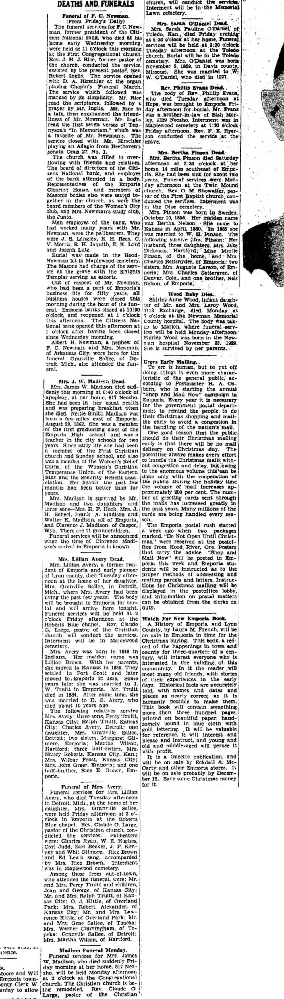 Funeral (From Friday's Mrs. Sarah O'Daniel Dead. The funeral services Mrs. Pauline O'Daniel, former president of the Toledo, Friday evening National bank, died his her home. Funeral home early Wednesday morning, services held o'clock held o'clock morning Tuesday afternoon the First church. Toledo church. Burial Rice, former cemetery. O'Daniel born church, conducted service. November 1859, Davis assisted the present pastor, Rev. Missouri. married Robert The opened O'Daniel, died in 1927. Hirschler at the organ Funeral March. Phillip Evans Dead. The of Phillip Evans, by its simplicity. Mr. Rice who afternoon Tuesday read the followed by brought Emporls by Mr. Inglis. Mr. Rice Mr. talk, then the friend- Bish liness of Mr. Newman. Mr. Inglis Neosho. the first seven verses Tencemetery which Friday favorite The conducted the service the service closed with Hirschler grave. from Beethoven's Opus No. Mrs. Bertha Pinson Dead. The church was filled to overMrs. Bertha Pinson died Saturday flowing with friends and afternoon 5:30 o'clock board directors the Citi- home, miles southeast National bank, and employes She had been sick about bank attended in body. Funeral services Representatives the Emporia Twin Mound Clearing House, and members church. pasMasonic bodies also were seated the First church, gether church. were the ducted Interment the Women's Olpe cemetery. club. and Mrs. study Mrs. Pinson born in Sweden, Junto. October 1858. Her Men of the bank. who Nelson. many years Kansas April, 1880. Newman, They Pinson. The Pinson: Her Morris, Jaquith, Lord husband. three Jake Joseph Dickason. Myrtle Burial made in the HoodPinson, home, and Charles Reifsnyder. of charge the sisters, Augusta Larson, ice the grave with the Knights Charles Denver, Colo., and brother, Out respect Newman, Nelson, Emporia. had been part of Emporia's business fifty Wood Baby business houses were closed Shirley Anne morning during the hour the Mr. of and Mrs. Leroy Wood, eral. Emporia banks closed Exchange, Monday died and reopened o'clock o'clock the Newman Memorial this afternoon. The Citizens Na- County hospital. The body tional bank opened this where funeral after having been closed will held afternoon. Monday since morning Shirley Wood born Albert nephew of hospital and Mrs. Newman. Elie survived by her parents. were here for the funeral. Granville Sallee. DeUrges Early Mailing. troit, Mich., also attended the funbut to Madison Dead. died suddenly her 817 Neosho. had usual when died. Nettle east August She was member first Emporia and teacher in city for Since been member First Christian Sunday school, member Women's Relief Corps, Women's Christian Temperance Union. the Eastern and Security Benefit health past months had been better than for Mrs. Madison survived by Mr. Madison daughters and Hoch, Scheel, Frank Madison Walter Madison, all of Emporia, and Clarence Casper, Funeral services when the time Clarence arrival Emporia known. Mrs. Littlan Avery Dead. Mrs. Lillian resiEmporia and early pioneer Lyon died afterthe her daughter, Granville Detroit. where Mrs. Avery had been past. years. will brought to Emporia arrive here tonight. Funeral will held o'clock Friday afternoon the Roberts Blue chapel. Rev. Claude pastor the Christian church, conduct the services. Interment will be Maplewood cemetery. Mrs. Avery was born in 1848 Indiana. name Lillion Brown. With parents, moved Kansas They settled Fort Scott later moved 1856. Some Truitt Truitt 1884. After time, she Avery, died about survive Percy City: Ralph Kansas City: Charles one daughter, Mrs. two Wilson, Hartford: three Mrs. Nancy Roberts. Kansas City, Wilbur Frost. City: John Rice Brown, Emporia. Funeral of Mrs. Avery. Funeral services Mrs. Lillian Avery. died Tuesday afternoon home her Mrs. Friday afternoon clock Emporia Roberts Blue chapel. Claude Large, pastor the Christian ducted services. Ryan. Hughes, Judd. Earl KenWhit Rice Brown Ed Lewis Rice Brown. Interment in Among those the Mrs. Truitt and children. Jean and George. Kansas City: Truitt. KanCity: Overland Park: Robert Alexander. Kansas City: Mr. and Overland Park: Mrs. Gene Topeka: Warner Cunningham. Granville Sallee. Detroit: peka: Martha Wilson, of Hartford. Funeral Mrs. died suddenly will o'clock the church. Claude the church, conduct the Interment will be in the cemetery. doing things even more teristic general public, cording to Postmaster born, starting annual Now" campaign Emporia. Every year the government postal ment remind people their early avoid congestion the nation's mail. One good that the public should their early that there will be no delivery The makes every handle the withcongestion and but the with cooperation public. holiday volume of approximately per cent. The greeting cards through has increased greatly past years. Many the cards are being handled every The Emporia postal rush started week ago when packages marked. Not Open Until Christwere received at the postoffrom Hood River. Ore. Posters carry the 'Shop Mail Now" be posted Emporia and Emporia students be instructed to the proper methods of addressing and parcels and letters. tions for mailing in the on postal be obtained from the clerks duty. Watch For New Emporia Book. History of Emporia Lyon Laura M. will sale Emporia in time for the buying. This book, of happenings town county tury, everyone interested the building community. the reader meet many old friends, stories their experiences early told. with names and dates and places nearly correct as possible make This book more three hundred pages. printed beautiful paper, bound blue cloth with lettering be valuable reference. interest please instruct. and young and and middle-aged peruse profit Gazette and sale Eckdall Carty and other Emporia probably Decemsome Christmas