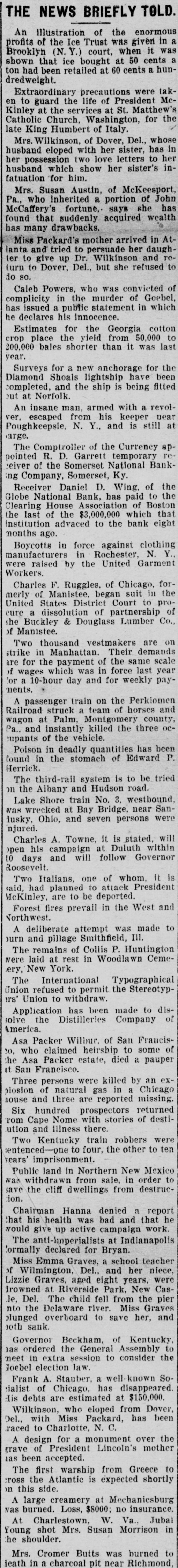THE NEWS BRIEFLY TOLD An illustration of the enormou profits of the Ice Trust was given in Brooklyn (N. Y.) court, when it wa shown that ice bought at 50 cents ton had been retailed at 60 cents a hur dredweight. Extraordinary precautions were tal en to guard the life of President M Kinley at the services at St. Matthew Catholic Church, Washington, for th late King Humbert of Italy. Mrs. Wilkinson, of Dover, Del., whos husband eloped with her sister, has i her possession two love letters to he husband which show her sister's in fatuation for him. Mrs. Susan Austin, of McKeespor Pa., who inherited a portion of Joh McCaffery's fortune, says she ha found that suddenly acquired wealt has many drawbacks. Miss Packard's mother arrived in A lanta and tried to persuade her daugh ter to give up Dr. Wilkinson and re turn to Dover, Del., but she refused I do SO. Caleb Powers, who was convicted โฌ complicity in the murder of Goebe has issued a public statement in whic he declares his innocence. Estimates for the Georgia cotto crop place the yield from 50,000 t 200,000 bales shorter than it was las year. Surveys for a new anchorage for th Diamond Shoals lightship have bee completed, and the ship is being fitte out at Norfolk. An insane man, armed with a revol ver, escaped from his keeper nea Poughkeepsie, N. Y., and is still a arge. The Comptroller of the Currency at pointed R. D. Garrett temporary re ceiver of the Somerset National Bank ing Company, Somerset, Ky. Receiver Daniel D. Wing, of th Globe National Bank. has paid to th Clearing House Association of Bosto the last of the $3,000,000 which tha institution advaced to the bank eigh months ago. Boycotts in force against clothin manufacturers in Rochester, N. Y were raised by the United Garmen Workers. Charles F. Ruggles, of Chicago, for merly of Manistee, began suit in th United States District Court to pro cure a dissolution of partnership ( she Buckley & Douglass Lumber Co of Manistee. Two thousand vestmakers are o strike in Manhattan. Their demand are for the payment of the same scal of wages which was in force last yea 'or a 10-hour day and for weekly pay ments. A passenger train on the Perkiome Railroad struck a team of horses an wagon at Palm. Montgomery count Pa., and instantly killed the three oo cupants of the vehicle. Poison in deadly quantities has bee found in the stomach of Edward I Herrick. The third-rail system is to be trie on the Albany and Hudson road. Lake Shore train No. 3. westbound was wrecked at Bay Bridge, near San dusky, Ohio, and seven persons wer njured. Charles A. Towne, it is stated, will open his campaign at Duluth withi 10 days and will follow Governo Roosevelt. Two Italians, one of whom, it i said, had planned to attack Presiden McKinley, are to be deported. Forest fires prevail in the West an Northwest. A deliberate attempt was made t ourn and pillage Smithfield, III. The remains of Collis P. Huntingto were laid at rest in Woodlawn Ceme ery, New York. The International Typographica Union refused to permit the Stereotyp ers' Union to withdraw. Application has been made to dis solve the Distilleries Company 0 America. Asa Packer Wilbur. of San Francis 20, who claimed heirship to some o the Asa Packer estate, died a paupe it San Francisco. Three persons were killed by an ex plosion of natural gas in a Chicag house and three are reported missing Six hundred prospectors returne rom Cape Nome with stories of desti ution and illness there. Two Kentucky train robbers wer sentenced-one to four, the other to te years' imprisonment. Public land in Northern New Mexic was withdrawn from sale, in order t save the cliff dwellings from destruc tion. Chairman Hanna denied a repor that his health was bad and that h would give up active campaign work. The anti-imperialists at Indianapoli 'ormally declared for Bryan. Miss Emma Graves, a school teache of Wilmington, Del., and her niece Lizzie Graves, aged eight years, wer drowned at Riverside Park, New Cas Je, Del. The child fell from the pie nto the Delaware river. Miss Grave blunged overboard to save her, and oth sank. Governor Beckham, of Kentucky has ordered the General Assembly t
