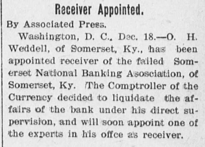 Receiver Appointed. By Associated Press. Washington, D. C., Dec. 18.-0. H. Weddell, of Somerset, Ky., has been appointed receiver of the failed Somerset National Banking Asosciation, of Somerset, Ky. The Comptroller of the Currency decided to liquidate the affairs of the bank under his direct supervision, and will soon appoint one of the experts in his offce as receiver.