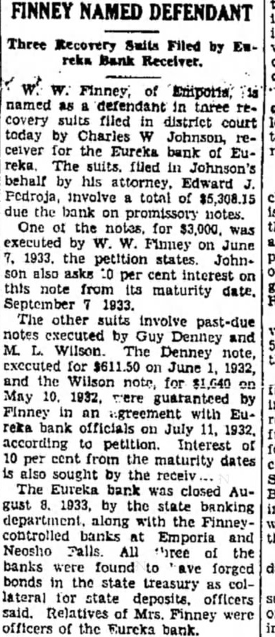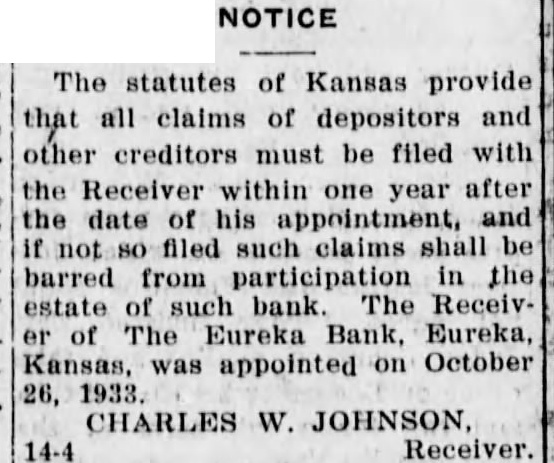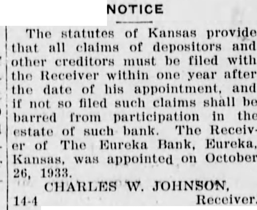 Special to The Gazette: Eureka, Oct. 31-W. H. Hamer. of Madison, is now receiver of the Eureka bank, closed since August 8. Appointment was made the latter part of last week from the office of Charles W. Johnson, state receiver, in Topeka. Previous to his appointment Mr. Hamer had been special deputy bank commissioner here for three weeks.
