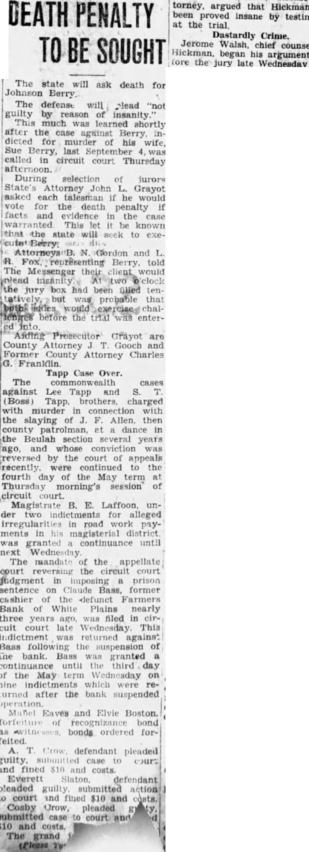 Signature Missing. Mr. Grayot contended that the absence of Dr. Bailey's signature on the bond book "shows plainly a permediated effort to sell those bonds without the knowledge of Dr. Bailey. In keeping this emergency fund, it is strange, strange, gentlemen, that there is not one scratch of the pen to show the bonds were sold Is that banking During Mr. Grayot's speech, a hot verbal encounter ensued between opposing counsel, which percipitated from continual ob jections advanced by Mr Waddill. The prosecutor made reference to these objections and Mr. Waddill was immediately on his feet stating that he knew bis rights in court as well as Mr. Grayot, who charged that the 00jections were merely intended to throw him off the line of his speech. Judge Laffoon informed the defense counsel that he could object as many times as he wished. Admits Bond Sale. Bass, the only defense witness, was severely cross examined by Commonwealth Attorney John L. Grayot Thursday afternoon, ad mitted he sold W. B. Bailey Liberty loan bonds. valued at $4.250, entrusted to his care while he was cashier of the Farmers Bank of White Plains, and said Dr. Bailey had knowledge of the sale for he (Bass) had informed him of the Dr. Bailey testified Wednesday afternoon he did not know his bonds had been sold until after the bank suspended in May. 1925, and discovery was made only when liquidation was in progress under the direction of the state banking department. Dr. Bailey testified he had not given Bass or anyone else authority to sell the bonds. Bass, in his testimony. stated he had inormed Dr. Balley OF the bank opening bond d partment and had explained it to him in detail, telling him bonds would be bought and sold The def endant said he did not give Dr. Bailey credit for the $4 250 Liberty bonds at the bank when sold, but placed the saie proceeds in the emergency fund because Dr. Bailey m ght want to draw on it or buy bonds When Bass was asked by Commonwealth Attorney Grayot if it was customary for banks to sel: bonds placed in their cust dy. Bass said "some do, but not all. He said he got the bond department form he used from a Louisville bank and thought it was from Liberty Insur ince bank When asked if it was not state on the back of certificates issued following receipt of bonds by the bank while he was cashier that bonds like those described would be returned to the owner, Bass stated any bonds like those n.ent oned in the certificate would do. Get New Receipt. He said Dr Bailey's reason for not signing the bond register was because he was issued a new receipt when his oll one was taken up and it was not necessary to sign the registe y. Plains declared its 100 percent dividend June 23, 1923, payable June 30, 1923. Bass said He testineo he owned 19 shares of stock then and he received about $7,900 as his dividend pait; his wite owned 33 shares, receiv ng $3, 300: his father, 5 shares, got $500: sister, 10 shares of st ck receiving $1,000 and a consn named Murphey, owner $1,000 when the shares receiving wife received more than at that time Bass admitted The bank had declared a 13 and at that time it had $15.00 fits. When the June, 1923. divi dend was declared it reduced in surplus to $5,000 and lef $1 0.03 as undivided profits,