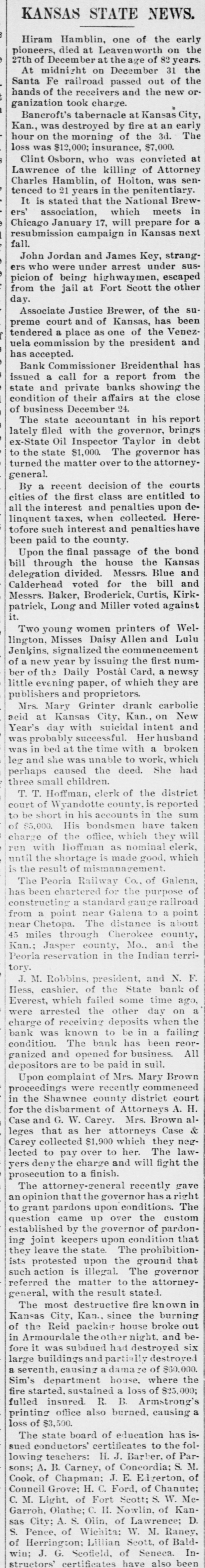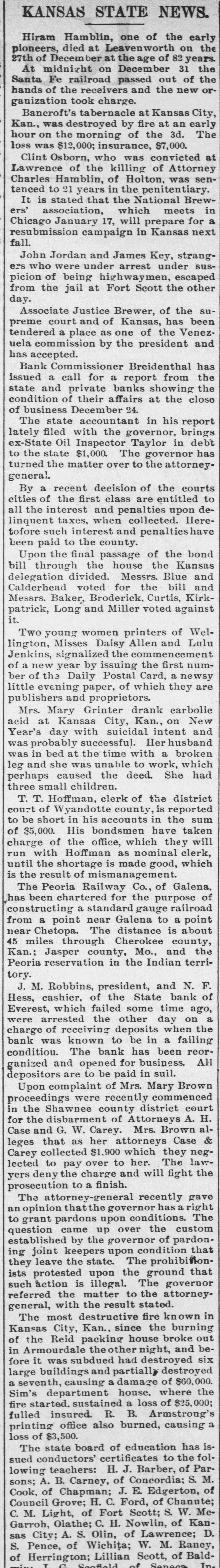 KANSAS STATE NEWS. Hiram Hamblin, one of the early pioneers, died at Leavenworth on the 27th of December at theage of 82 years. At midnight on December 31 the Santa Fe railroad passed out of the hands of the receivers and the new or. ganization took charge. Baneroft's tabernacle at Kansas City, Kan., was destroyed by fire at an early hour on the morning of the 3d. The loss was $12,000; insurance, $7,000. Clint Osborn, who was convicted at Lawrence of the killing of Attorney Charles Hamblin, of Holton. was sentenced to 21 years in the penitentiary. It is stated that the National Brewers' association, which meets in Chicago January 17, will prepare for a resubmission campaign in Kansas next fall. John Jordan and James Key, strangers who were under arrest under suspicion of being highwaymen, escaped from the jail at Fort Scott the other day. Associate Justice Brewer, of the supreme court and of Kansas, has been tendered a place as one of the Venezuela commission by the president and has accepted. Bank Commissioner Breidenthal has issued a call for a report from the state and private banks showing the condition of their affairs at the close of business December 24. The state accountant in his report lately filed with the governor, brings ex-State Oil Inspector Taylor in debt to the state $1,000. The governor has turned the matter over to the attorneygeneral. By a recent decision of the courts cities of the first class are entitled to all the interest and penalties upon delinquent taxes, when collected. Heretofore such interest and penaltieshave been paid to the county. Upon the final passage of the bond bill through the house the Kansas delegation divided. Messrs. Blue and Calderhead voted for the bill and Messrs. Baker, Broderick, Curtis, Kirkpatrick, Long and Miller voted against it. Two young women printers of Wellington, Misses Daisy Allen and Lulu Jenkins, signalized the commencement of a new year by issuing the first number of the Daily Postal Card, a newsy little evening paper, of which they are publishers and proprietors. Mrs. Mary Grinter drank carbolic acid at Kansas City, Kan., on New Year's day with suicidal intent and was probably successful. Her husband was in bed at the time with a broken leg and she was unable to work, which perhaps caused the deed. She had three small children. T. T. Hoffman, clerk of the district court of Wyandotte county, is reported to be short in his accounts in the sum of $5,000. His bondsmen have taken charge of the office, which they will run with Hoffman as nominal clerk, until the shortage is made good, which is the result of mismanagement. The Peoria Railway Co., of Galena, has been chartered for the purpose of constructing a standard gauge railroad from a point near Galena to a point near Chetopa. The distance is about 45 miles through Cherokee county, Kan.: Jasper county, Mo., and the Peoria reservation in the Indian territory. J. M. Robbins, president, and N. F. Hess, cashier. of the State bank of Everest, which failed some time ago, were arrested the other day on a charge of receiving deposits when the bank was known to be in a failing condition. The bank has been reorganized and opened for business. All depositors are to be paid in sull. Upon complaint of Mrs. Mary Brown proceedings were recently commenced in the Shawnee county district court for the disbarment of Attorneys A. H. Case and G. W. Carey. Mrs. Brown alleges that as her attorneys Case & Carey collected $1,900 which they neglected to pay over to her. The lawyers deny the charge and will fight the prosecution to a finish. The attorney-general recently gave an opinion that the governor has a right to grant pardons upon conditions. The question came up over the custom established by the governor of pardoning joint keepers upon condition that they leave the state. The prohibitionists protested upon the ground that such action is illegal. The governor referred the matter to the attorneygeneral, with the result stated. The most destructive fire known in City,