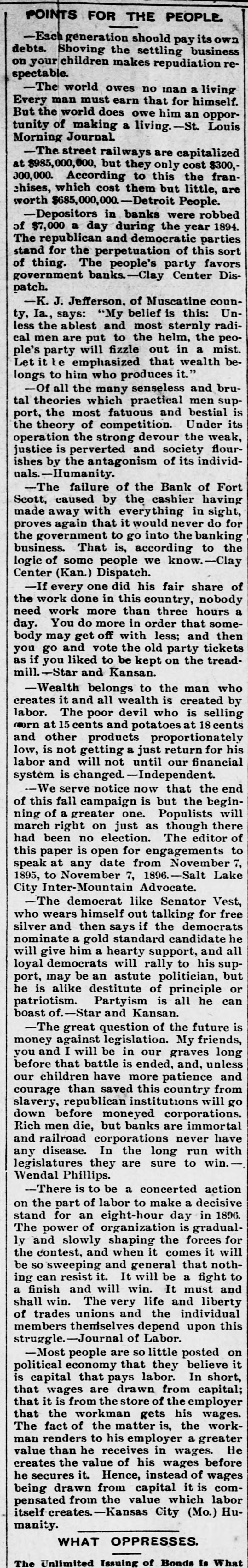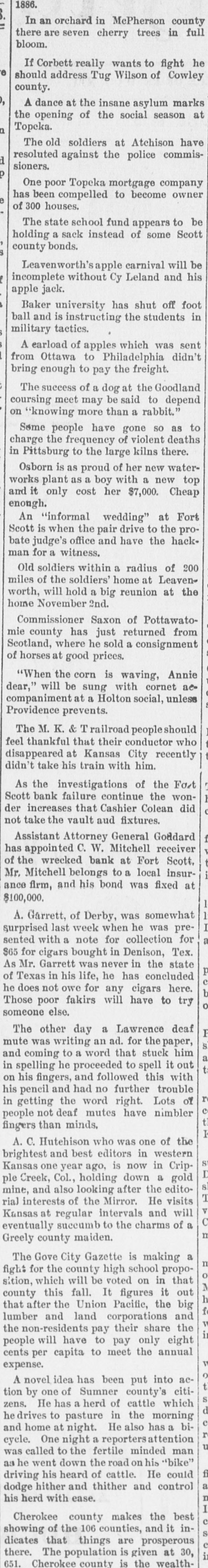 1886. In an orchard in McPherson county there are seven cherry trees in full bloom. If Corbett really wants to fight he e should address Tug Wilson of Cowley county. A dance at the insane asylum marks the opening of the social season at Topeka. The old soldiers at Atchison have resoluted against the police commissioners. One poor Topeka mortgage company has been compelled to become owner of 300 houses. The state school fund appears to be holding a sack instead of some Scott county bonds. Leavenworth'sapple carnival will be incomplete without Cy Leland and his apple jack. Baker university has shut off foot ball and is instructing the students in military tactics. A earload of apples which was sent from Ottawa to Philadelphia didn't bring enough to pay the freight. The success of a dog at the Goodland coursing meet may be said to depend on "knowing more than a rabbit." Some people have gone so as to charge the frequency of violent deaths in Pittsburg to the large kilns there. Osborn is as proud of her new waterworks plant as a boy with a new top and it only cost her $7,000. Cheap enough. An "informal wedding" at Fort Scott is when the pair drive to the probate judge's office and have the hackman for a witness. Old soldiers within a radius of 200 miles of the soldiers' home at Leavenworth, will hold a big reunion at the home November 2nd. Commissioner Saxon of Pottawatomie county has just returned from Scotland, where he sold a consignment of horses at good prices. "When the corn is waving, Annie dear," will be sung with cornet aecompaniment at a Holton social, unless Providence prevents. The M. K. & T railroad peopleshould feel thankful that their conductor who disappeared at Kansas City recently didn't take his train with him. As the investigations of the Fast Scott bank failure continue the wonder increases that Cashier Colean did not take the vault aud fixtures. Assistant Attorney General Goddard f has appointed C. W. Mitchell receiver of the wrecked bank at Fort Scott, Mr. Mitchell belongs to a local insurance firm, and his bond was fixed at $100,000. A. Garrett, of Derby, was somewhat I surprised last week when he was presented with a note for collection for a $65 for cigars bought in Denison, Tex. As Mr. Garrett was never in the state p of Texas in his life, he has concluded he does not owe for any cigars here. Those poor fakirs will have to try o someone else. The other day a Lawrence deaf P mute was writing an ad. for the paper, S and coming to a word that stuck him a in spelling he proceeded to spell it out t on his fingers, and followed this with his pencil and had no further trouble r in getting the word right. Lots of c people not deaf mutes have nimbler t fingers than minds. I A. C. Hutehison who was one of the brightest and best editors in western S Kansas one year ago, is now in CripD ple Creek, Col., holding down a gold S mine, and also looking after the editoT rial interests of the Mirror. He visits V Kansas at regular intervals and will C eventually succumb to the charms of a n Greely county maiden. The Gove City Gazette is making a n fight for the county high school propoo sition, which will be voted on in that N county this fall. It figures it out h that after the Union Pacific, the big f lumber and land corporations and W the non-residents pay their share the in people will have to pay only eight cents per capita to meet the annual W expense. O A novel idea has been put into act tion by one of Sumner county's citiS zens. He has a herd of cattle which d he drives to pasture in the morning c and home at night. He also has a bir cycle. One night a reportersattention = was called to the fertile minded man as he went down the road on his "bike" driving his heard of cattle. He could fi