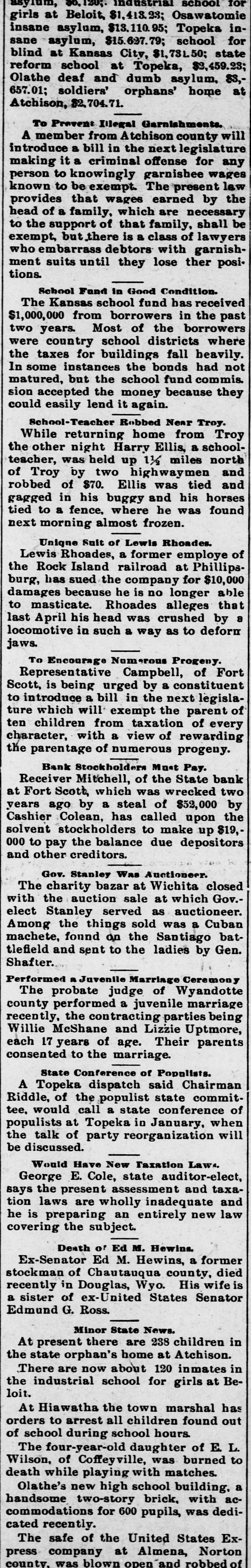 asyrum, industrial school for girls at Beloit, $1,413.23; Osawatomie insane asylum, $13.110.95; Topeka insane asylum, $15.697.79; school for blind at $2,459.23; reform school Kansas at City, Topeka, $1,731.50; state Olathe deaf and dumb asylum, $3,657.01; soldiers' orphans' home at Atchison, $2,704.71. To Prevent Illegal Gernishments. from Atchison county will a bill in the next it criminal to introduce making A member offense legislature for wages any known to be law person knowingly exempt. garnishee The earned present by that wages the head of a are necessary to the of that be provides support family, which family, shall exempt, but there is a class of lawyers who embarrass debtors with garnishment suits until they lose ther positions. School Fund in Good Condition. school fund from borrowers two Most $1,000,000 The Kansas of the has in borrowers received the past were school for buildings the taxes years. country districts fall beavily. where In instances the not but the school matured, some bonds fund because commis. had they sion accepted the money could easily lend it again. School-Teacher Robbed Near Troy. Troy the Harry a While other returning night home Ellis, from schoolwas held up 11/2 of two teacher, Troy by highwaymen miles north and and robbed of $70. Ellis was tied in his buggy a where was tied gagged to fence, and he his horses found next morning almost frozen. Uniqne Suit of Lewis Rhoades. Lewis Rhoades, a former employe of the Rock Island railroad at Phillipshas sued the company for $10,000 because he is no longer to Rhoades damages burg, masticate. alleges able that a last his head was in such a as locomotive April way crushed to deform by jaws. To Encourage Numerous Progeny. Campbell, of Fort is by a to a bill in the next Scott, Representative introduce being urged constituent legislature which will exempt the parent of ten children from taxation of every character, with a view of rewarding the parentage of numerous progeny. Bank Stockholders Must Pay. of the bank Receiver Fort Scott, Mitchell, wrecked State at which was two a steal of Cashier has upon the years ago Colean, by called make $52,000 by solvent stockholders to up $19,000 to pay the balance due depositors and other creditors. Was Auctioneer. Gov. charity Stanley Wichita The bazar at closed with the auction sale at which Gov. elect Stanley served as auctioneer. Among the things sold was a Cuban found on the machete, ladies Santiago by Gen. battlefield and sent to the Shafter. Performed Juvenile Marriage Ceremony judge of Wyandotte a the contracting recently, county The probate performed juvenile parties marriage being McShane and each of age. parents Willie 17 years Lizzie Their Uptmore, consented to the marriage. State Conference of Popplists. dispatch said Chairman of the state Riddle, A Topeka populist conference commit- of tee, would call a state at in the of populists talk Topeka party reorganization January, when will be discussed. Would Have New Taxation Laws. E. Cole, state auditor-elect, the assessment laws are wholly he an new says tion George is preparing present entirely inadequate and taxa- and law covering the subject. Death of Ed M. Hewins. Ex-Senator Ed M. Hewins, a former of Chautauqua county, died in Wyo. a of ex-United stockman recently sister Douglas, States His Senator wife is Edmund G. Ross. Minor State News. there are 238 in the home at At state present orphan's children Atchison. There are now about 120 inmates in the industrial school for girls at Beloit. the town has arrest all children out orders At Hiawatha to marshal found of school during school hours The four-year-old daughter of E. L. Wilson, of Coffeyville, was burned to death while playing with matches. Olathe's new high school building. a handsome two-story brick, with accommodations for 600 pupils, was dedicated recently. of the The safe United Almena, States Norton Express company at county, was blown open and robbed of