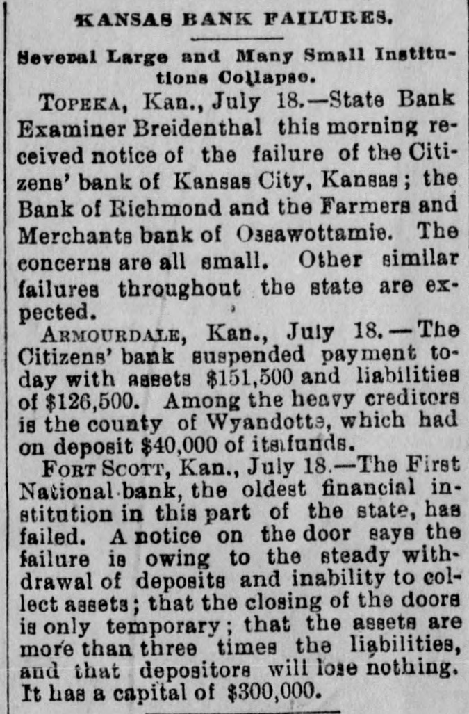 KANSAS BANK FAILURES. Several Large and Many Small Institutions Collapse. TOPEKA, Kan., July 18.-State Bank Examiner Breidenthal this morning received notice of the failure of the Citizens' bank of Kansas City, Kansas; the Bank of Richmond and the Farmers and Merchants bank of The concerns are all small. Other similar failures throughout the state are expected. ARMOURDALE, Kan., July 18. - The Citizens' bank suspended pay ment today with assets $151,500 and liabilities of $126,500. Among the heavy creditors is the county of Wyandotts, which had on deposit $40,000 of itsfunds. FORT SCOTT, Kan., July 18.-The First National-bank, the oldest financial institution in this part of the state, has failed. A notice on the door saye the failure is owing to the steady withdrawal of deposits and inability to collect assets; that the closing of the doors is only temporary; that the assets are more than three times the liabilities, and that depositors will lose nothing. It has a capital of $300,000.