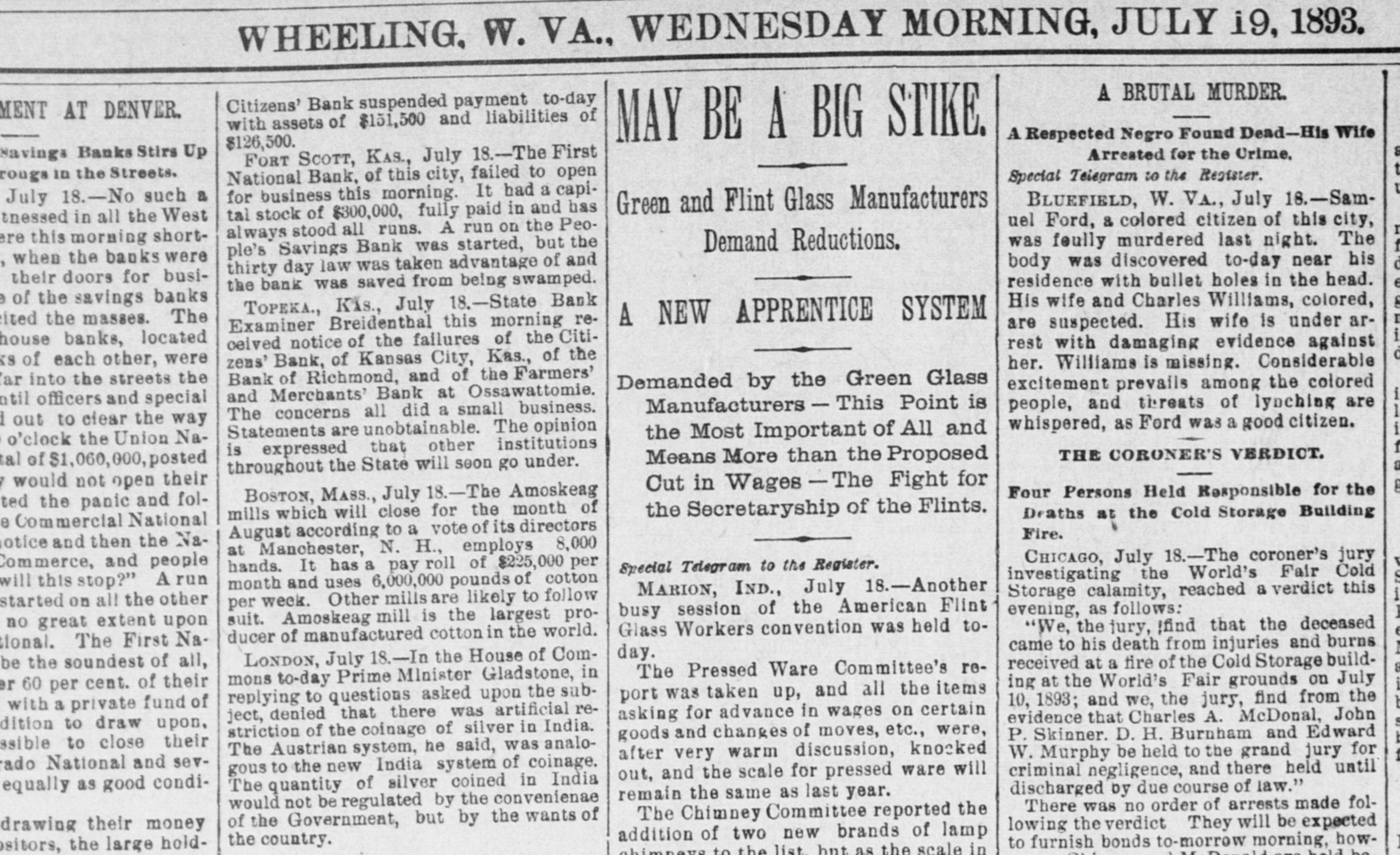 WHEELING, W. VA., WEDNESDAY MORNING, JULY i9, 1893. A BRUTAL MURDER. Citizens' Bank suspended payment to-day MENT AT DENVER. with assets of $151,500 and liabilities of MAY BE A BIG STIKE. A Respected Negro Found Dead-His Wife $126,500. 8 Savings Banks Stirs Up Arreated for the Crime. FORT SCOTT, KAS., July 18.-The First t rougs in the Streets. Special Telegram to the Register. National Bank, of this city, failed to open T for business this morning. It had a capiJuly 18.-No such a BLUEFIELD, W. VA., July 18.-SamGreen and Flint Glass Manufacturers tal stock of $300,000, fully paid in and has tnessed in all the West uel Ford, & colored citizen of this city, I always stood all runs. A run on the Peoare this morning shortwas feully murdered last night. The Demand Reductions. f ple's Savings Bank was started, but the when the banks were body was discovered to-day near his C thirty day law was taken advantage of and their doors for busiresidence with bullet holes in the head. e the bank was saved from being swamped. of the savings banks 6 His wife and Charles Williams, colored, TOPEKA., KAs., July 18.-State Bank I ited the masses. The A NEW APPRENTICE SYSTEM are suspected. His wife is under arExaminer Breidenthal this morning rehouse banks, located ceived notice of the failures of the Citirest with damaging evidence against o KS of each other, were zens' Bank, of Kansas City, Kas., of the her. Williams is missing. Considerable Bank of Richmond, and of the Farmers' ar into the streets the Demanded by the Green Glass excitement prevails among the colored and Merchants' Bank at Ossawattomie. atil officers and special people, and threats of lynching are Manufacturers - This Point is The concerns all did a small business. 1 out to clear the way whispered, as Ford was a good citizen. i Statements are unobtainable. The opinion the Most Important of All and o'clock the Union Nais expressed that other institutions THE CORONER'S VERDICT. Means More than the Proposed tal of $1,060,000, posted throughout the State will soon go under. 7 would not open their Cut in Wages - The Fight for @ Four Persons Held Responsible for the BOSTON, MASS., July 18.-The Amoskeag ted the panic and folthe Secretaryship of the Flints. mills which will close for the month of Deaths at the Cold Storage Building e Commercial National Fire. August according to a vote of its directors otice and then the Naat Manchester, N. H., employs 8,000 CHICAGO, July 18.-The coroner's jury Commerce, and people hands. It has a pay roll of $225,000 per Special Telegram to the Register. investigating the World's Fair Cold will this stop?" A run month and uses 6,000,000 pounds of cotton MARION, IND., July 18.-Another Storage calamity, reached a verdict this started on all the other per week. Other mills are likely to follow evening, as follows: busy session of the American Flint suit. Amoskeag mill is the largest prono great extent upon "We, the jury, !find that the deceased Glass Workers convention was held toducer of manufactured cotton in the world. tional. The First Nacame to his death from injuries and burns day. LONDON, July 18.-In the House of Combe the soundest of all, received at a fire of the Cold Storage buildThe Pressed Ware Committee's remons to-day Prime Minister Gladstone, in ing at the World's Fair grounds on July er 60 per cent. of their port was taken up, and all the items replying to questions asked upon the sub10, 1893; and we, the jury, find from the with a private fund of asking for advance in wages on certain ject, denied that there was artificial reevidence that Charles A. McDonal, John dition to draw upon, striction of the coinage of silver in India. P. Skinner. D. H. Burnham and Edward goods and changes of moves, etc., were, ssible to close their The Austrian system, he said, was analoafter very warm discussion, knocked W. Murphy be held to the grand jury for ado National and sevgous to the new India system of coinage. criminal negligence, and there held until out, and the scale for pressed ware will equally as good condiThe quantity of silver coined in India discharged by due course of law." remain the same as last year. would not be regulated by the convenienae There was no order of arrests made folThe Chimney Committee reported the of the Government, but by the wants of drawing their money lowing the verdict They will be expected addition of two new brands of lamp the country. to furnish bonds to-morrow morning, howsitors, the large holdam hold be chimpava to the list but as the scale in