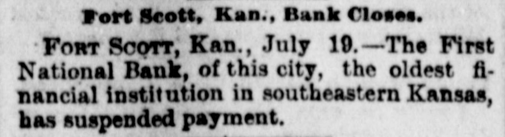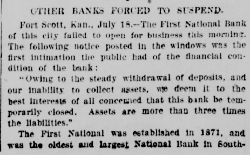 OTHER BANKS FORCED TO SUSPEND. Fort Scott. Kan., July 18.-The First National Bank of this city failed to open for business this morning. The following notice posted in the windows was the first intimation the public had of the financial condition of the bank: "Owing to the steady withdrawal of deposits, and our inability to collect assets, age deem it to the best interests of all concerned that this bank be temporarily closed. Assets are more than three times the liabilities." The First National was established in 1871, and was the oldest and largest National Bank in South-