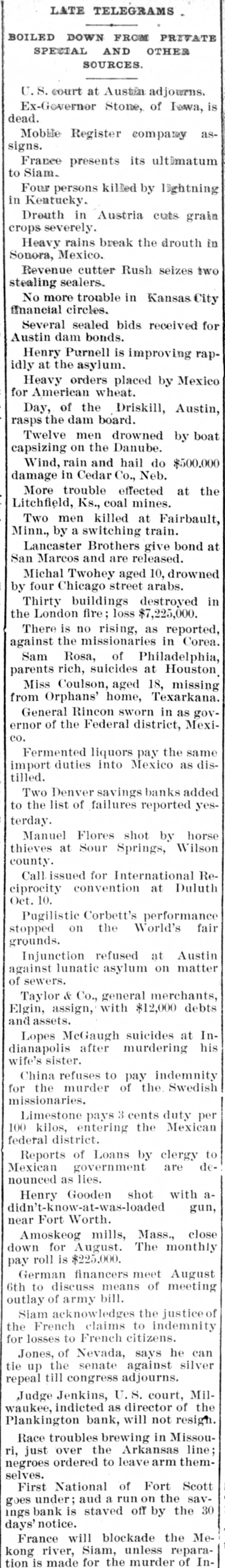 LATE TELEGRAMS BOILED DOWN FROM PRIVATE SPECIAL AND OTHER SOURCES. U.S. court at Austin adjourns. Ex-Governor Stone, of Iowa, is dead. Mobile Register company assigns. France presents its ultimatum to Siam. Four persons killed by lightning in Kentucky. Drouth in Austria cuts grain crops severely. Heavy rains break the drouth in Sonora, Mexico. Revenue cutter Rush seizes two stealing sealers. No more trouble in Kansas City financial circles. Several sealed bids received for Austin dam bonds. Henry Purnell is improving rapidly at the asylum. Heavy orders placed by Mexico for American wheat. Day, of the Driskill, Austin, rasps the dam board. Twelve men drowned by boat capsizing on the Danube. Wind, rain and hail do $500,000 damage in Cedar Co., Neb. More trouble effected at the Litchfield, Ks., coal mines. Two men killed at Fairbault, Minn., a Lancaster by switching Brothers train. give bond at San Marcos and are released. Michal Twohey aged 10, drowned by four Chicago street arabs. Thirty buildings destroyed in the London fire; loss $7,225,000. no as There the is missionaries rising, reported, against in Corea. Sam rich, Rosa, suicides of Philadelphia, parents at Houston Miss Coulson, aged 18, missing from Orphans' home, Texarkana. sworn in as ernor MexiGeneral of the Rincon Federal district, govco. Fermented liquors pay the same import duties into Mexico as distilled. Two Denver savings banks added to the list of failures reported yesterday. Manuel Flores shot by horse thieves at Sour Springs, Wilson county. Call issued for International Reciprocity convention at Duluth Oct. 10. Pugilistic Corbett's performance stopped on the World's fair grounds. Injunction refused at Austin lunatic asylum against on matter of sewers. Taylor & Co., general merchants, Elgin, assign, with $12,000 debts and assets. suicides InLopes McGaugh at dianapolis after murdering his wife's sister. China refuses to pay indemnity for the murder of the Swedish missionaries. Limestone pays 3 cents duty per 100 kilos, entering the Mexican federal district. Reports of Loans to government by clergy are Mexican denounced as lies. Henry Gooden shot with adidn't-know-at-was-loaded gun, near Fort Worth. Amoskeog mills, Mass., close down for August. The monthly pay roll is $225.000. German financers meet 6th to means of discuss meeting August outlay of army bill. the of the to Siam French acknowledges claims indemnity justice for losses to French citizens. Jones, of Nevada, says he can tie up the senate against silver repeal till congress adjourns. Judge Jenkins, U.S. court, Milas will not waukee, Plankington indicted bank, director resign. of the Race troubles in Missouri, over just the brewing Arkansas line; negroes ordered to leave arm themselves. First National of Fort Scott under; aud a run on the ings is staved off 30 goes bank by the savdays'notice. kong unless France river, will Siam, blockade the repara- Metion is made for the murder of In-