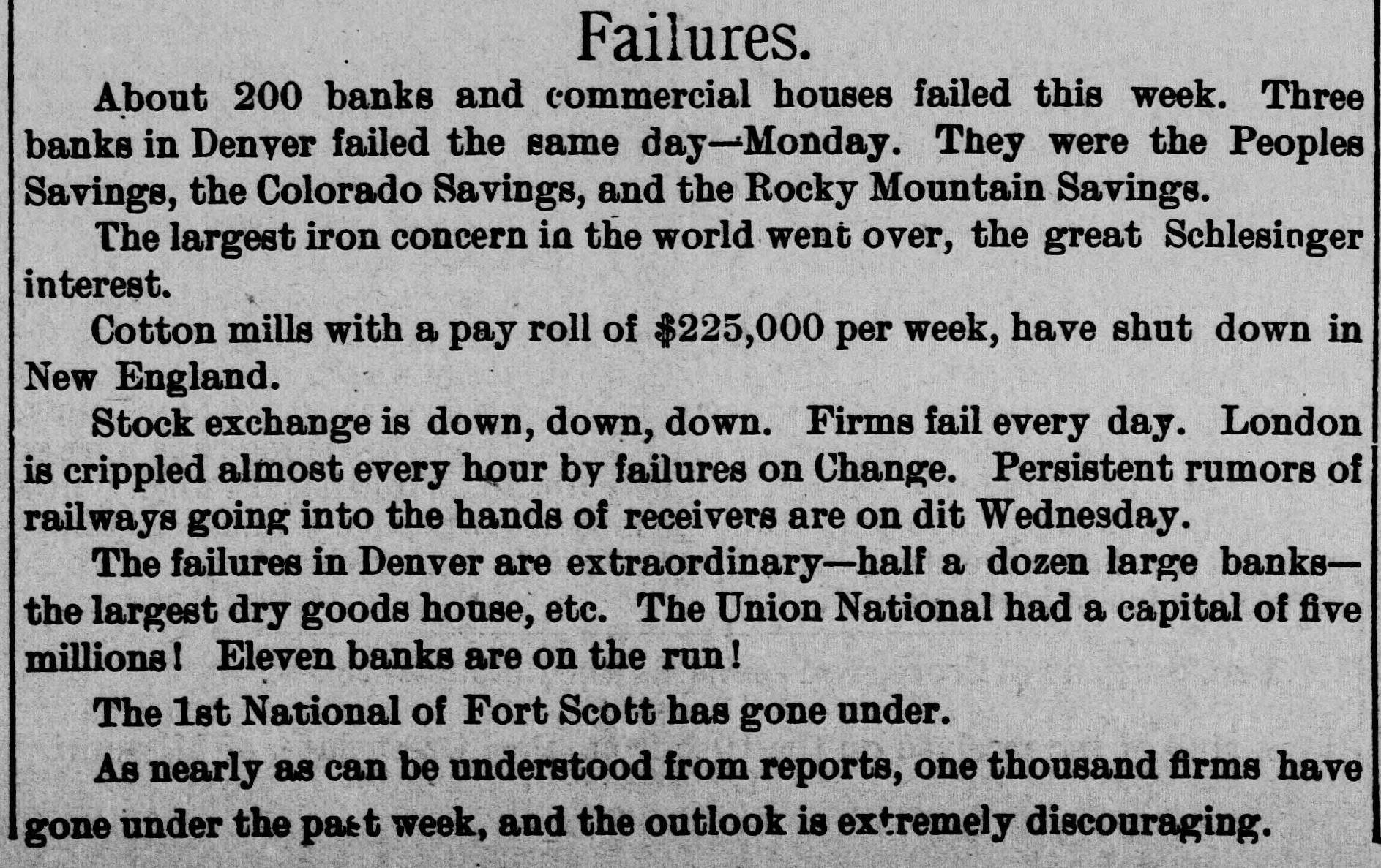 Failures. About 200 banks and commercial houses failed this week. Three banks in Denver failed the same day-Monday. They were the Peoples Savings, the Colorado Savings, and the Rocky Mountain Savings. The largest iron concern in the world went over, the great Schlesinger interest. Cotton mills with a pay roll of $225,000 per week, have shut down in New England. Stock exchange is down, down, down. Firms fail every day. London is crippled almost every hour by failures on Change. Persistent rumors of railways going into the hands of receivers are on dit Wednesday. The failures in Denver are extraordinary-half a dozen large banksthe largest dry goods house, etc. The Union National had a capital of five millions! Eleven banks are on the run! The 1st National of Fort Scott has gone under. As nearly as can be understood from reports, one thousand firms have gone under the past week, and the outlook is extremely discouraging.