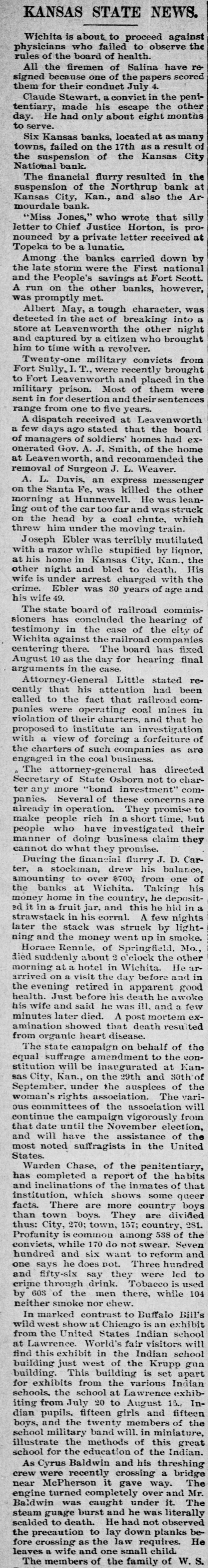 KANSAS STATE NEWS. Wichita is about to proceed against physicians who failed to observe the rules of the board of health. All the firemen of Salina have resigned because one of the papers scored them for their conduct July 4. Claude Stewart, a convict in the penitentiary, made his escape the other day. He had only about eight months to serve. Six Kansas banks, located at as many towns, failed on the 17th as a result of the suspension of the Kansas City National bank. The financial flurry resulted in the suspension of the Northrup bank at Kansas City, Kan., and also the Armourdale bank. "Miss Jones," who wrote that silly letter to Chief Justice Horton, is pronounced by a private letter received at Topeka to be a lunatic. Among the banks carried down by the late storm were the First national and the People's savings at Fort Scott. A run on the other banks, however, was promptly met. Albert May, a tough character, was detected in the act of breaking into a store at Leavenworth the other night and captured by a citizen who brought him to time with a revolver. Twenty-one military convicts from Fort Sully,1 were recently brought to Fort Leavenworth and placed in the military prison. Most of them were sent in for desertion and theirsentences range from one to five years. A dispatch received at Leavenworth a few days ago stated that the board of managers of soldiers' homes had exonerated Gov. A. J. Smith, of the home at Leavenworth, and recommended the removal of Surgeon J. L. Weaver. A. L. Davis, an express messenger on the Santa Fe, was killed the other morning at Hunnewell. He was leaning out of the car too far and was struck on the head by a coal chute, which threw him under the moving train. Joseph Ebler was terribly mutilated with a razor while stupified by liquor, at his home in Kansas City, Kan., the other night and bled to death. His wife is under arrest charged with the crime. Ebler was 30 years of age and his wife 49. The state board of railroad commissioners has concluded the hearing of testimony in the case of the city of Wichita against the railroad companies centering there. The board has fixed August 10 as the day for hearing final arguments in the case. Attorney-General Little stated recently that his attention had been called to the fact that railroad companies were operating coal mines in violation of their charters, and that he proposed to institute an investigation with a view of forcing a forfeiture of the charters of such companies as are engaged in the coal business. The attorney-general has directed Secretary of State Osborn not to charter any more "bond investment" companies. Several of these concerns are already in operation. They promise to make people rich in a short time, but people who have investigated their manner of doing business claim they cannot do what they promise. During the financial flurry J. D. Carter, a stockman, drew his balance, amounting to over $700, from one of the banks at Wichita. Taking his money home in the country, he deposited it in a fruit jar, and this he hid in a strawstack in his corral. A few nights later the stack was struck by lightning and the money went up in smoke. Horace Rennie, of Springfield, Mo., died suddenly about 2 o'elock the other morning at a hotel in Wichita. He ararrived on a visit the day before and in the evening retired in apparent good health. Just before his death he awoke his wife and said he was ill, and a few minutes later died. A post mortem examination showed that death resulted from organic heart disease. The state campaign on behalf of the equal suffrage amendment to the constitution will be inaugurated at Kansas City, Kan., on the 29th and 30th of September, under the auspices of the woman's rights association. The various committees of the association will continue the campaign vigorously from that date until the November election, and will have the assistance of the most noted suffragists in the United States. Warden Chase, of the penitentiary, has completed a report of the habits and inclinations of the inmates of that institution, which shows some queer facts. There are more country boys than town boys. They are divided thus: City, 270; town, 157; country, 281. Profanity is common among 538 of the convicts, while 170 do not swear. Seven hundred and six want to reform and one says he does not. Three hundred and fifty-six say they were led to crime through drink. Tobacco is used by 603 of the men there, while 104 neither smoke nor chew. In marked contrast to Buffalo Bill's wild west show at Chicago is an exhibit from the United States Indian school World's