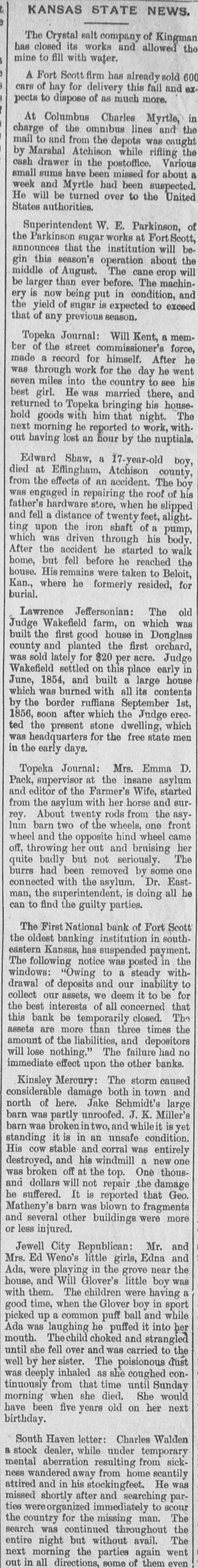 KANSAS STATE NEWS. The Crystal salt company of Kingman has closed its works and allowed the mine to fill with water. A Fort Scott firm has already sold 600 cars of hay for delivery this fall and ex pects to dispose of as much more. At Columbus Charles Myrtle, in charge of the omnibus lines and the mail to and from the depots was caught by Marshal Atchison while rifling the cash drawer in the postoffice. Various small sums have been missed for about a week and Myrtle had been suspected. He will be turned over to the United States authorities. Superintendent W. E. Parkinson, of the Parkinson sugar works at Fort Scott, announces that the institution will begin this season's operation about the middle of August. The cane crop will be larger than ever before. The machinery is now being put in condition, and the yield of sugar is expected to exceed that of any previous season. Topeka Journal: Will Kent, a member of the street commissioner's force, made a record for himself. After he was through work for the day he went seven miles into the country to see his best girl. He was married there, and returned to Topeka bringing his household goods with him that night. The next morning he reported to work, without having lost an hour by the nuptials. Edward Shaw, a 17-year-old boy, died at Effingham, Atchison county, from the effects of an accident. The boy was engaged in repairing the roof of his father's hardware store, when he slipped and fell a distance of twenty feet, alightting upon the iron shaft of a pump, which was driven through his body. After the accident he started to walk home, but fell before he reached the house. His remains were taken to Beloit, Kan., where he formerly resided, for burial. Lawrence Jeffersonian: The old Judge Wakefield farm, on which was built the first good house in Douglass county and planted the first orchard, was sold lately for $20 per acre. Judge Wakefield settled on this place early in June, 1854, and built a large house which was burned with all its contents by the border ruffians September 1st, 1856, soon after which the Judge erected the present stone dwelling, which was headquarters for the free state men in the early days. Topeka Journal: Mrs. Emma D. Pack, supervisor at the insane asylum and editor of the Farmer's Wife, started from the asylum with her horse and surrey. About twenty rods from the asyInm barn two of the wheels, one front wheel and the opposite hind wheel came off, throwing her out and bruising her quite badly but not seriously. The burrs had been removed by some one connected with the asylum. Dr. Eastman, the superintendent, is doing all he can to find the guilty parties. The First National bank of Fort Scott the oldest banking institution in southeastern Kansas, has suspended payment. The following notice was posted in the windows: "Owing to a steady withdrawal of deposits and our inability to collect our assets, we deem it to be for the best interests of all concerned that this bank be temporarily closed. The assets are more than three times the amount of the liabilities, and depositors will lose nothing." The failure had no immediate effect upon the other banks. Kinsley Mercury: The storm caused considerable damage both in town and north of here. Jake Schmidt's large barn was partly unroofed. J. K. Miller's barn was broken in two, and whileit is yet standing it is in an unsafe condition. His cow stable and corral was entirely destroyed, and his windmill a new one was broken off at the top. One thousand dollars will not repair the damage he suffered. It is reported that Geo. Matheny's barn was blown to fragments and several other buildings were more or less injured. Jewell City Republican: Mr. and Mrs. Ed Weno's little girls, Edna and Ada, were playing in the grove near the house, and Will Glover's little boy was with them. The children were having a good time, when the Glover boy in sport picked up a common puff ball and while Ada was laughing he puffed it into her mouth. Thechild choked and strangled until she fell over and was carried to the well by her sister. The poisionous dust was deeply inhaled as she coughed continuously from that time until Sunday morning when she died. She would have been five years old on her next birthday. South Haven letter: Charles Walden a stock dealer, while under temporary mental aberration resulting from sickness wandered away from home scantily attired and in his stockingfeet. He was missed shortly after and searching parties wereorganized immediately to scour the country for the missing man. The search was continued throughout the entire night but without avail. The next morning the parties again went out in all directions, some of them even