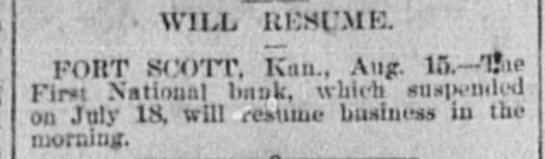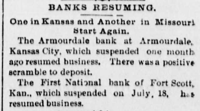 BANKS RESUMING. One in Kansas and Another in Missouri Start Again. The Armourdale bank at Armourdale, Kansas City, which suspended one month ago resumed business. There wasa positive scramble to deposit. The First National bank of Fort Scott, Kan., which suspended on July. 18, has resumed business.