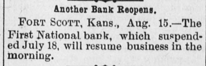 The First National Bank of Fort Scott suspended payment July 18, 1893 due to steady withdrawals and inability to collect assets (reported in multiple papers). It later resumed business mid‑August (reported Aug 15–17). The coverage links the trouble to broader regional bank failures/panic (Denver/Kansas City), but the articles do not clearly describe a discrete depositor run on this bank separate from the general withdrawals; classification chosen as a suspension with reopening.