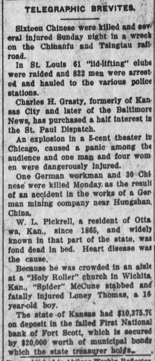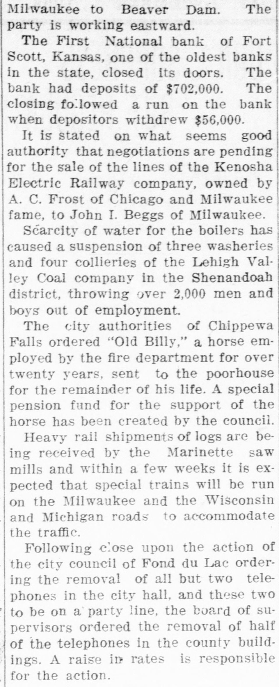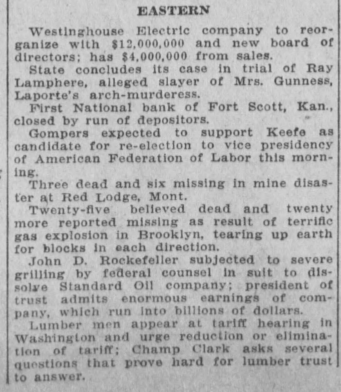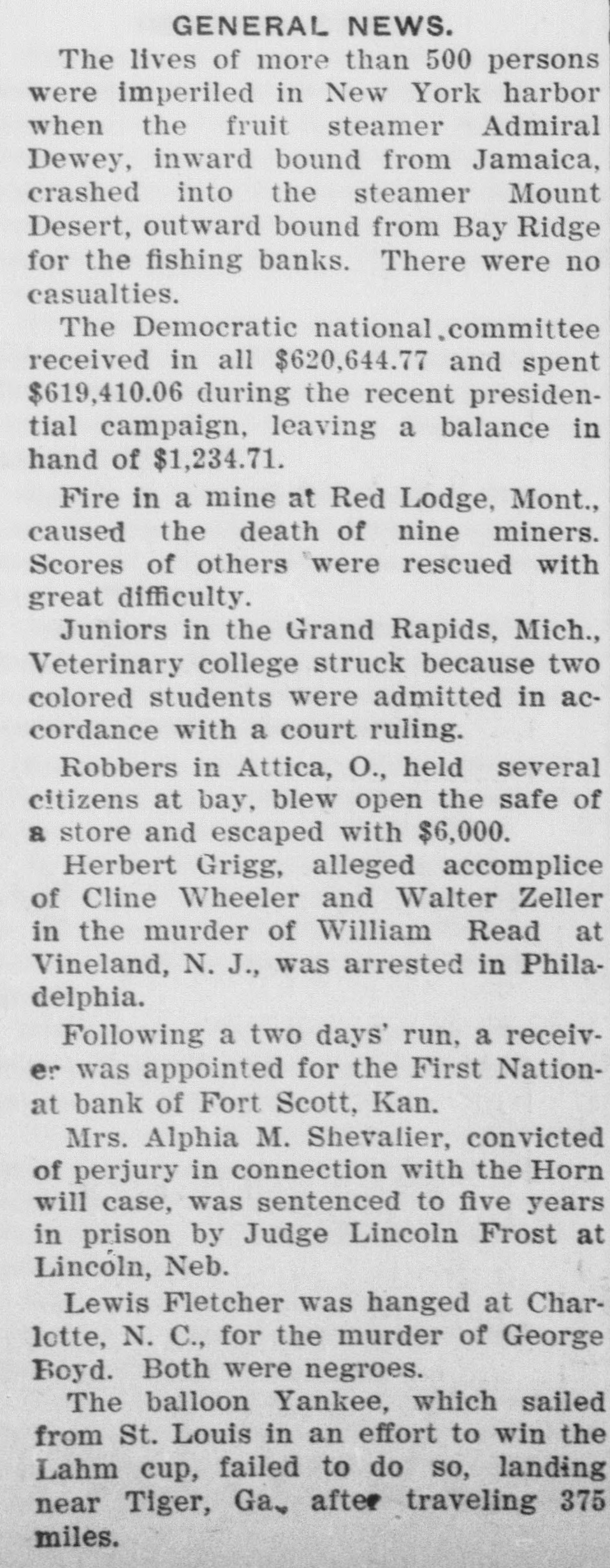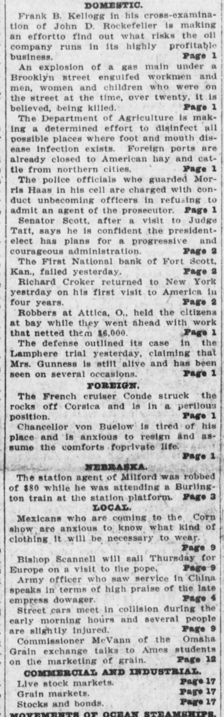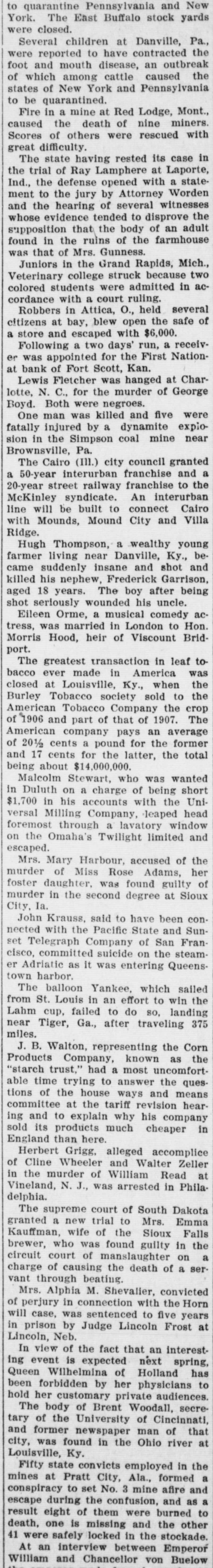 to quarantine Pennsylvania and New York. The East Buffalo stock yards were closed. Several children at Danville, Pa., were reported to have contracted the foot and mouth disease, an outbreak of which among cattle caused the states of New York and Pennsylvania to be quarantined. Fire in a mine at Red Lodge, Mont., caused the death of nine miners. Scores of others were rescued with great difficulty. The state having rested its case in the trial of Ray Lamphere at Laporte, Ind., the defense opened with a statement to the jury by Attorney Worden and the hearing of several witnesses whose evidence tended to disprove the supposition that the body of an adult found in the ruins of the farmhouse was that of Mrs. Gunness. Juniors in the Grand Rapids, Mich., Veterinary college struck because two colored students were admitted in accordance with a court ruling. Robbers in Attica, O., held several citizens at bay, blew open the safe of a store and escaped with $6,000. Following a two days' run, a receiver was appointed for the First Nationat bank of Fort Scott, Kan. Lewis Fletcher was hanged at Charlotte, N. C., for the murder of George Boyd. Both were negroes. One man was killed and five were fatally injured by a dynamite explosion in the Simpson coal mine near Brownsville, Pa. The Cairo (Ill.) city council granted a 50-year interurban franchise and a 20-year street railway franchise to the McKinley syndicate. An interurban line will be built to connect Cairo with Mounds, Mound City and Villa Ridge. Hugh Thompson, a wealthy young farmer living near Danville, Ky., became suddenly insane and shot and killed his nephew, Frederick Garrison, aged 18 years. The boy after being shot seriously wounded his uncle. Eileen Orme, a musical comedy actress, was married in London to Hon. Morris Hood, heir of Viscount Bridport. The greatest transaction in leaf tobacco ever made in America was closed at Louisville, Ky., when the Burley Tobacco society sold to the American Tobacco Company the crop of 1906 and part of that of 1907. The American company pays an average of 201/2 cents a pound for the former and 17 cents for the latter, the total being about $14,000,000. Malcolm Stewart, who was wanted in Duluth on a charge of being short $1,700 in his accounts with the Universal Milling Company, leaped head foremost through a lavatory window on the Omaha's Twilight limited and escaped. Mrs. Mary Harbour, accused of the murder of Miss Rose Adams, her foster daughter, was found guilty of murder in the second degree at Sioux City, Ia. John Krauss, said to have been connected with the Pacific State and Sunset Telegraph Company of San Francisco, committed suicide on the steamer Adriatic as it was entering Queenstown harbor. The balloon Yankee, which sailed from St. Louis in an effort to win the Lahm cup, failed to do so, landing near Tiger, Ga., after traveling 375 miles. J. B. Walton, representing the Corn Products Company, known as the "starch trust," had a most uncomfortable time trying to answer the questions of the house ways and means committee at the tariff revision hearing and to explain why his company sold its products much cheaper in England than here. Herbert Grigg, alleged accomplice of Cline Wheeler and Walter Zeller in the murder of William Read at Vineland, N. J., was arrested in Philadelphia. The supreme court of South Dakota granted a new trial to Mrs. Emma Kauffman, wife of the Sioux Falls brewer, who was found guilty in the circuit court of manslaughter on a charge of causing the death of a servant through beating. Mrs. Alphia M. Shevalier, convicted of perjury in connection with the Horn will case, was sentenced to five years in prison by Judge Lincoln Frost at Lincoln, Neb. In view of the fact that an interesting event is expected next spring, Queen Wilhelmina of Holland has been forbidden by her physicians to hold her customary private audiences. The body of Brent Woodall, secretary of the University of Cincinnati, and former newspaper man of that city, was found in the Ohio river at Louisville, Ky. Fifty state convicts employed in the mines at Pratt City, Ala., formed a conspiracy to set No. 3 mine afire and escape during the confusion, and as a result eight of them were burned to death, one is missing and the other 41 were safely locked in the stockade. At an interview between Emperor