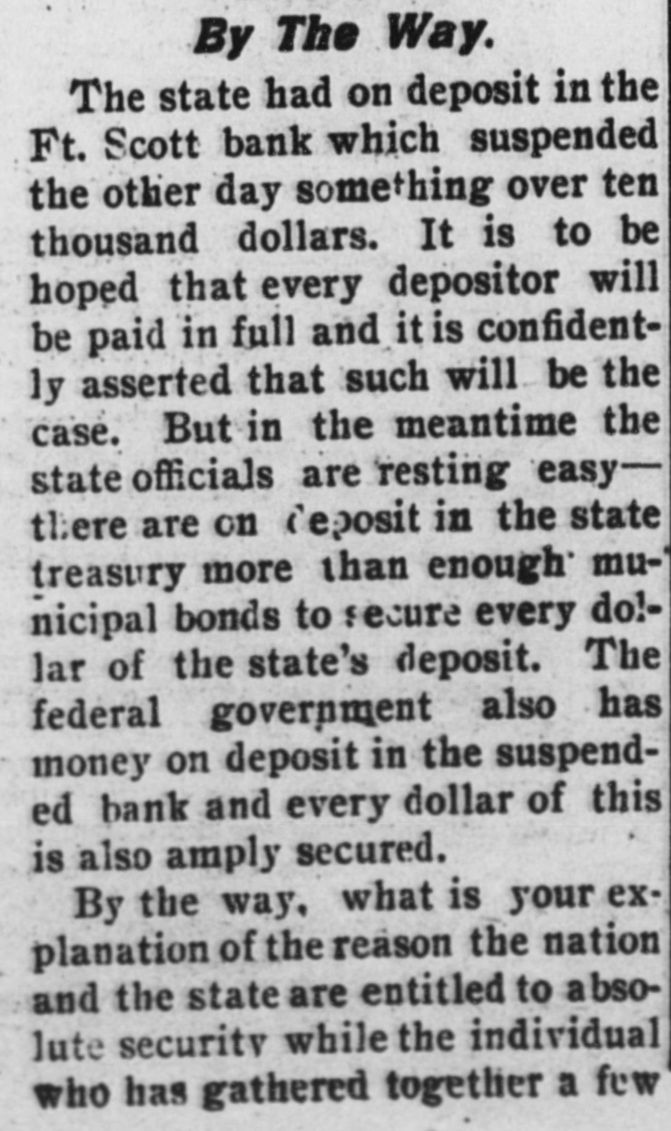 By The Way. The state had on deposit in the Ft. Scott bank which suspended the other day something over ten thousand dollars. It is to be hoped that every depositor will be paid in full and it is confidently asserted that such will be the case. But in the meantime the state officials are resting easythere are on deposit in the state treasury more than enough municipal bonds to secure every do!lar of the state's deposit. The federal government also has money on deposit in the suspended bank and every dollar of this is also amply secured. By the way, what is your explanation of the reason the nation and the state are entitled to absolute security while the individual who has gathered togetlier a few