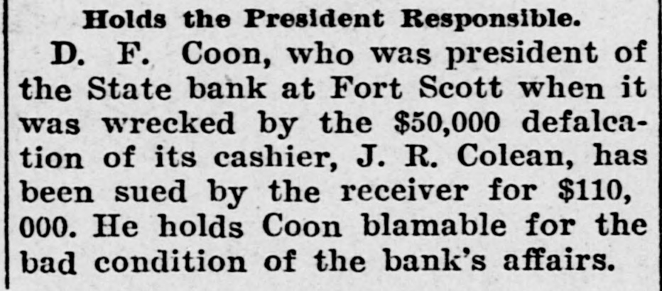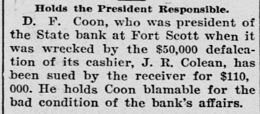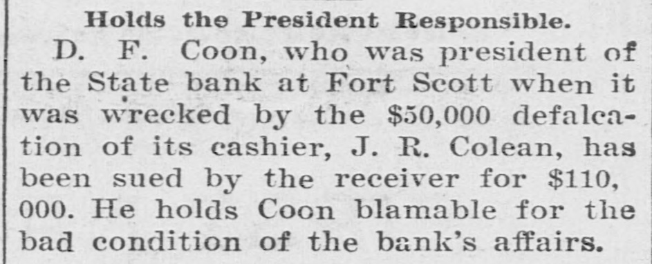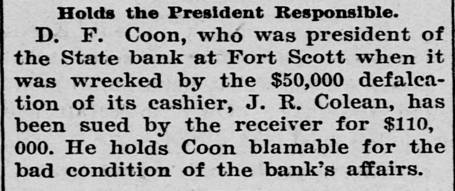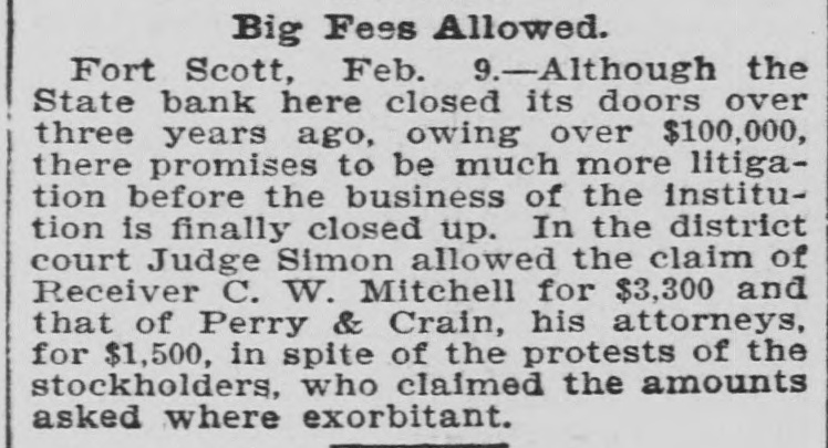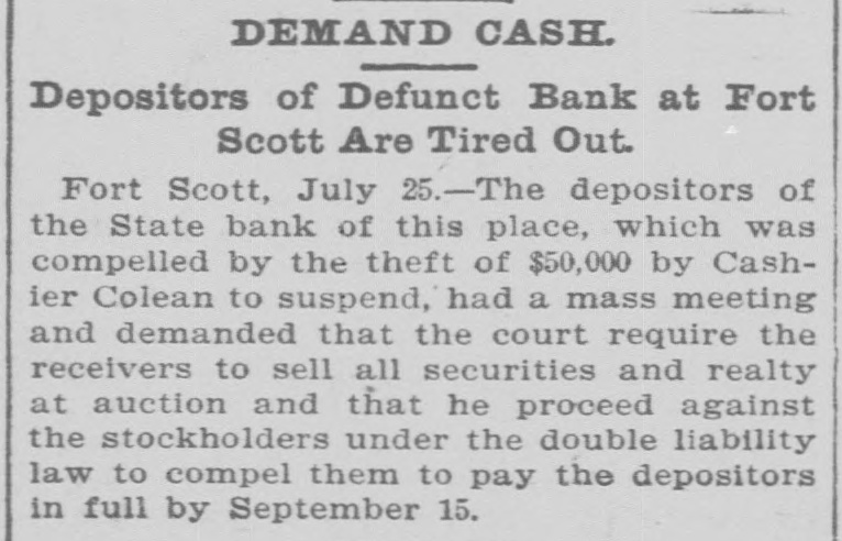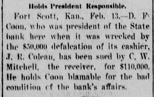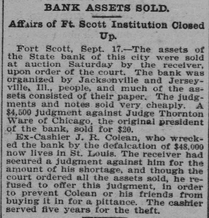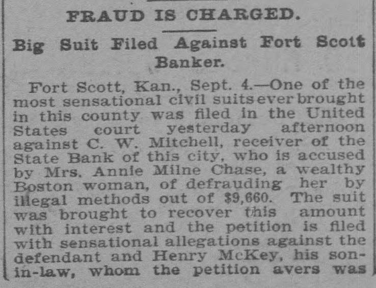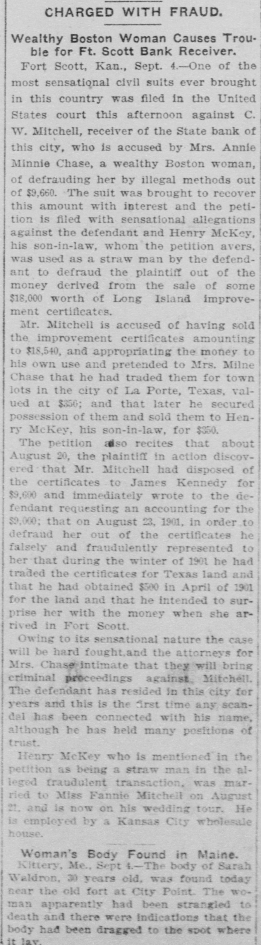 CHARGED WITH FRAUD. Wealthy Boston Woman Causes Trouble for Ft. Scott Bank Receiver. Fort Scott, Kan., Sept. 4.-One of the most sensational civil suits ever brought in this country was filed in the United States court this afternoon against C. W. Mitchell, receiver of the State bank of this city, who is accused by Mrs. Annie Minnie Chase, a wealthy Boston woman, of defrauding her by illegal methods out of $9,660. The suit was brought to recover this amount with interest and the petition is filed with sensational allegations against the defendant and Henry McKey, his son-in-law, whom the petition avers, was used as a straw man by the defendant to defraud the plaintiff out of the money derived from the sale of some $18,000 worth of Long Island improvement certificates. Mr. Mitchell is accused of having sold the improvement certificates amounting to $18,540, and appropriating the money to his own use and pretended to Mrs. Milne Chase that he had traded them for town lots in the city of La Porte, Texas, valued at $350; and that later he secured possession of them and sold them to Henry McKey, his son-in-law, for $350. so recites that about The petition August 20, the plaintiff in action discovered that Mr. Mitchell had disposed of the certificates to James Kennedy for $9,600 and immediately wrote to the defendant requesting an accounting for the $9,000; that on August 23, 1901, in order to defraud her out of the certificates he falsely and fraudulently represented to her that during the winter of 1901 he had traded the certificates for Texas land and that he had obtained $500 in April of 1901 for the land and that he intended to surprise her with the money when she arrived in Fort Scott. Owing to its sensational nature the case will be hard fought,and the attorneys for Mrs. Chase intimate that they will bring criminal proceedings against. Mitchell. The defendant has resided in this city for years and this is the first time any scandal has been connected with his name, although he has held many positions of trust. Henry McKey who is mentioned in the petition as being a straw man in the alleged fraudulent transaction, was married to Miss Fannie Mitchell on August 21, and is now on his wedding tour. He is employed by a Kansas City wholesale house. Woman's Body Found in Maine. Kittery, Me., Sept 4.-The body of Sarah Waldron, 30 years old, was found today near the old fort at City Point. The woman apparently had been strangled to death and there were indications that the body had been dragged to the spot where it lav.