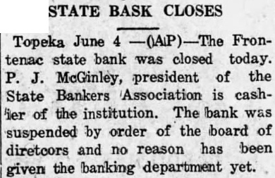 Topeka June Frontenac state bank was closed today. McGinley, president of the State Bankers Association is cashier of the institution. The bank was suspended by order of the board of diretcors and no reason has been given the banking department yet.