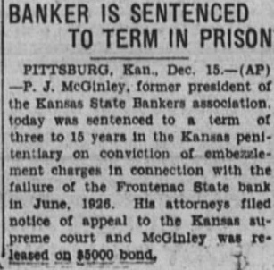 PITTSBURG. Kan., Dec. former president of the Kansas State Bankers association. today was sentenced to term of three to years in the Kansas penitentiary conviction ment charges in connection with the failure of the Frontenac State bank June, 1926. His attorneys filed notice appeal the Kansas supreme court and McGinley was leased bond,