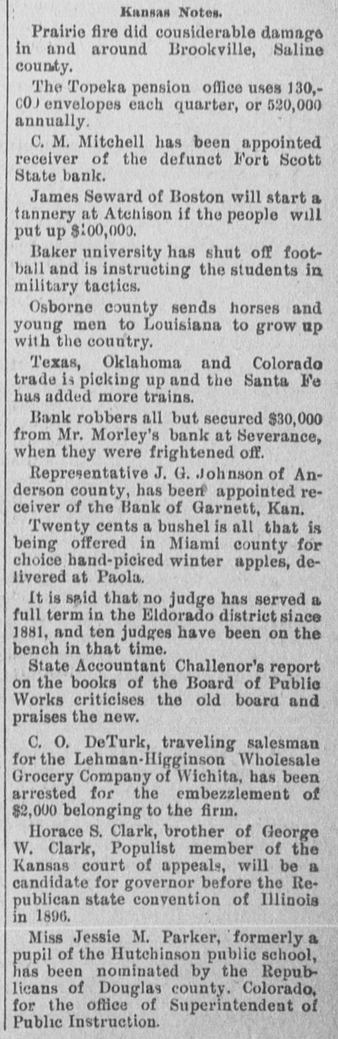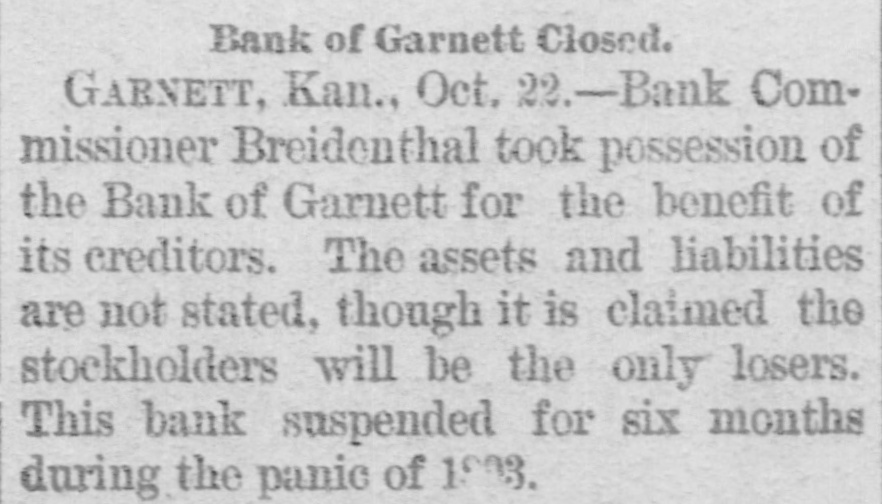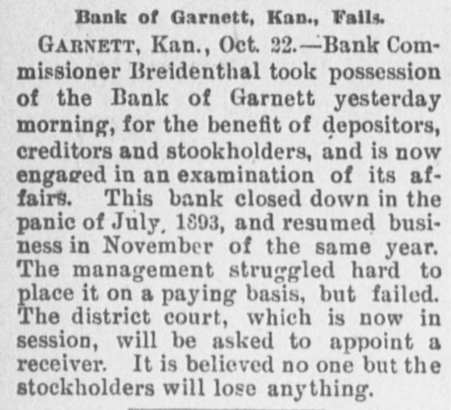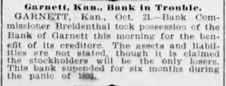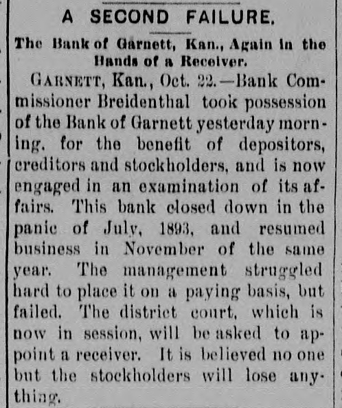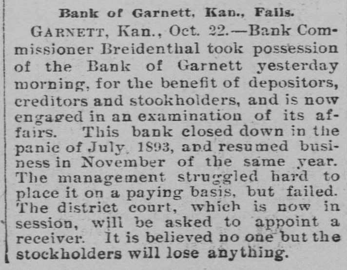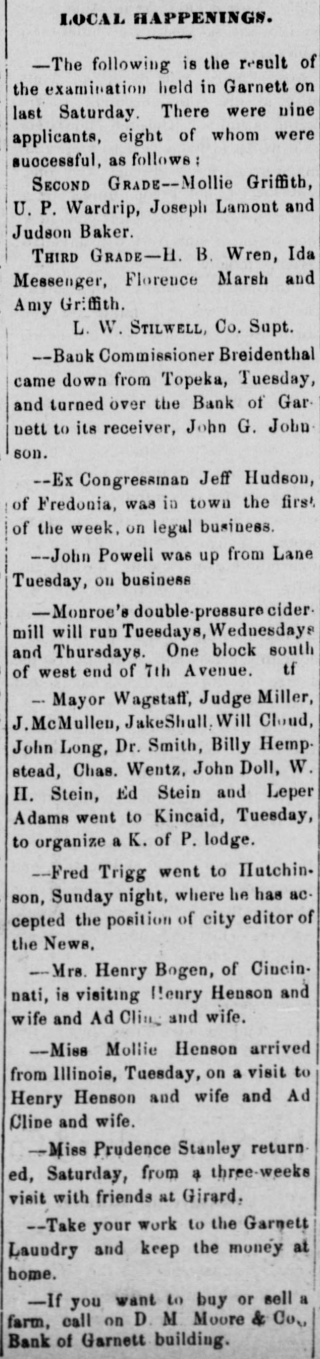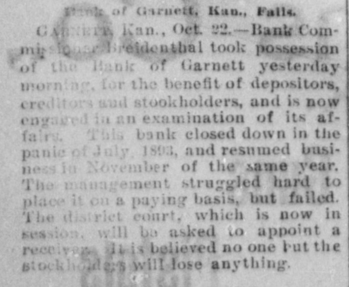 -Save money by having your old clothes dyed at the Garnett Laundry. -The Bank of Garnett has brought suit for damages against the county commissioners and the First National Bank. These suits have grown out of the trouble whereby the Bank of Garnett was compelled to close its doors some time ago. -Keep your money at home by patronizing the Garnett Laundry. -Isn't it about time for our city officials to levy another assessment on the joints that are running wide open, and have been since the day the last arrests were made? Wonder if they think the people don't know the difference between "enforcement of the law" and fines that are a license, amounting virtually to protection of the traffic. --Luke Bell has gone to Galveston, Texas, on a visit of several months. -The Garnett Laundry will do your work at living prices.