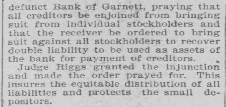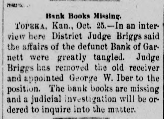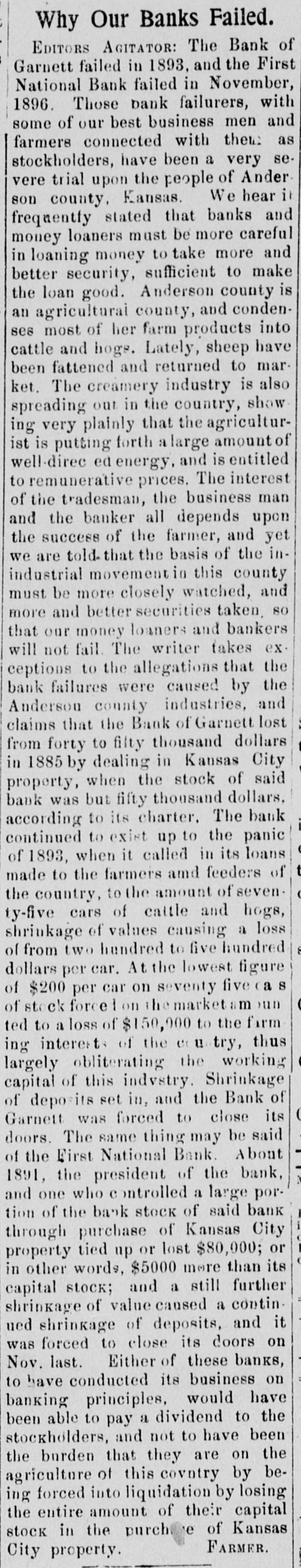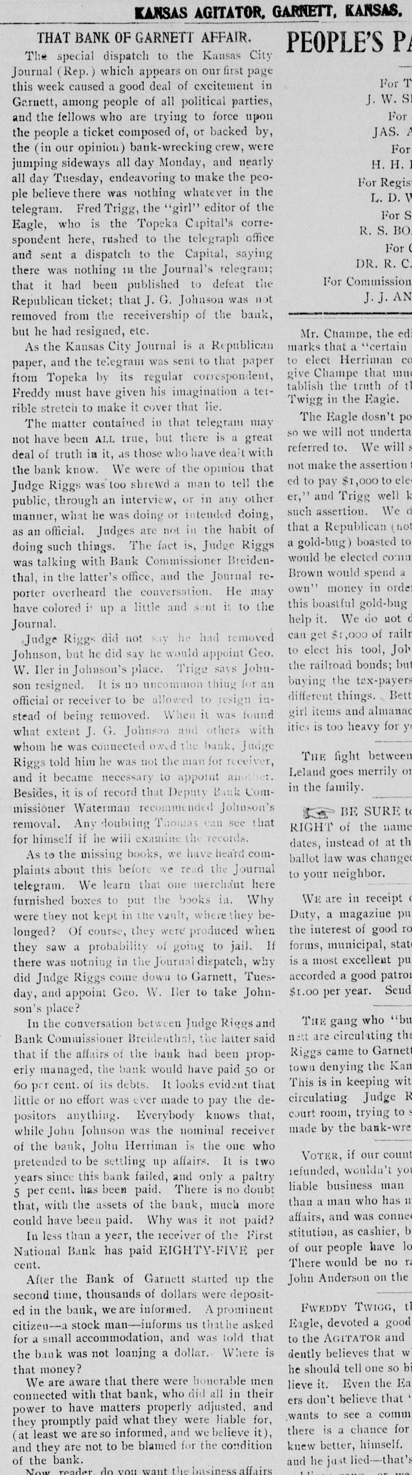 KANSAS AGITATOR, GARNETT, KANSAS THAT BANK OF GARNETT AFFAIR. PEOPLE'S I The special dispatch to the Kansas City Journal (Rep.) which appears on our first page For this week caused a good deal of excitement in J. W. Garnett, among people of all political parties, Fc and the fellows who are trying to force upon JAS. the people a ticket composed of, or backed by, F the (in our opinion) bank-wrecking crew, were H. H jumping sideways all day Monday, and nearly all day Tuesday, endeavoring to make the peoFor Reg ple believe there was nothing whatever in the L. D. telegram. Fred Trigg, the "girl" editor of the For Eagle, who is the Topeka Capital's correR. S. E spondent here, rushed to the telegraph office Fo and sent a dispatch to the Capital, saying DR. R. there was nothing 111 the Journal's relegram; For Commissi that it had been published to defeat the J.J.A Republican ticket; that J. G. Johnson was not removed from the receivership of the bank, but he had resigned, etc. Mr. Champe, the marks that a "certai As the Kansas City Journal is a Republican to elect Herriman paper, and the telegram was sent to that paper give Champe that 11 from Topeka by its regular correspondent, tablish the truth of Freddy must have given his imagination a terTwigg in the Eagle. rible stretch to make it cover that lie. The Eagle dosn't The matter contained in that telegram may so we will not under not have been ALL true, but there is a great referred to. We wil deal of truth in it, as those who have dealt with not make the assertio the bank know. We were of the opinion that ed to pay $1,000 to e Judge Riggs was too shrewd a man to tell the er," and Trigg well public, through an interview, or in any other such assertion. We manner, what he was doing or intended doing, that a Republican (1 as an official. Judges are not in the habit of a gold-bug) boasted doing such things. The fact is, Judge Riggs would be elected con was talking with Bank Commissioner BreidenBrown would spend thal, in the latter's office, and the Journal reown" money in or porter overheard the conversation. He may this boastful gold-bu have colored it up a little and sent it to the help it. We do not Journal. can get $1,000 of ra Judge Riggs did not say he had removed to elect his tool, J Johnson, but he did say he would appoint Geo. the railroad bonds; 1 W. Iler in Johnson's place. Trigg says Johnbuying the tax-pay son resigned. It is no uncommon thing for an different things. B official or receiver to be allowed to resign ingirl items and almar stead of being removed. When it was found itics is too heavy for what extent J. G. Johnson and others with whom he was connected owed the bank, Judge THE fight betwe Riggs told him he was not the man for receiver, Leland goes merrily and it became necessary to appoint another. in the family. Besides, it is of record that Deputy Bank Commissioner Waterman recommended Johnson's BE SURE removal, Any doubting Thomas can see that RIGHT of the nar for himself if he will examine the records. dates, instead of at As to the missing books, we have heard comballot law was chang plaints about this before we read the Journal to your neighbor. telegram. We learn that one merchant here WE are in receip furnished boxes to put the books in. Why Duty, a magazine were they not kept in the vault, where they bethe interest of good longed? Of course, they were produced when forms, municipal, st they saw a probability of going to jail. If is a most excellent there was notning in the Journal dispatch, why accorded a good pati did Judge Riggs come down to Garnett, Tues$1.00 per year. Se day, and appoint Geo. W. Iler to take Johnson's place? THE gang who " In the conversation between Judge Riggs and nett are circulating Bank Commissioner Breidenthal, the latter said Riggs came to Garn that if the affairs of the bank had been proptown denying the K erly managed, the bank would have paid 50 or This is in keeping v 60 per cent. of its debts. It looks evident that circulating Judge little or no effort was ever made to pay the decourt room, trying t positors anything. Everybody knows that, made by the bank-w while John Johnson was the nominal receiver of the bank, John Herriman is the one who VOTER, if our cot pretended to be settling up affairs. It is two refunded, wouldn't years since this bank failed, and only a paltry liable business mai 5 per cent. has been paid. There is no doubt than a man who has that, with the assets of the bank, much more affairs, and was cont could have been paid. Why was it not paid? stitution, as cashier, In less than a year, the receiver of the First of our people have National Bank has paid EIGHTY-FIVE per There would be no cent. John Anderson on tl After the Bank of Garnett started up the second time, thousands of dollars were depositFWEDDY TWIGG, ed in the bank, we are informed. A prominent citizen-a stock man-informs us that he asked Eagle, devoted a go to the AGITATOR an for a small accommodation, and was told that the bank was not loaning a dollar. Where is dently believes that he should tell one so that money? We are aware that there were honorable men lieve it. Even the connected with that bank, who did all in their ers don't believe tha power to have matters properly adjusted, and wants to see a com they promptly paid what they were liable for, there is a chance f (at least we are so informed, and we believe it), knew better, himself and they are not to be blamed for the condition of the bank. and he just lied-tha Now reader do vou want the business affairs