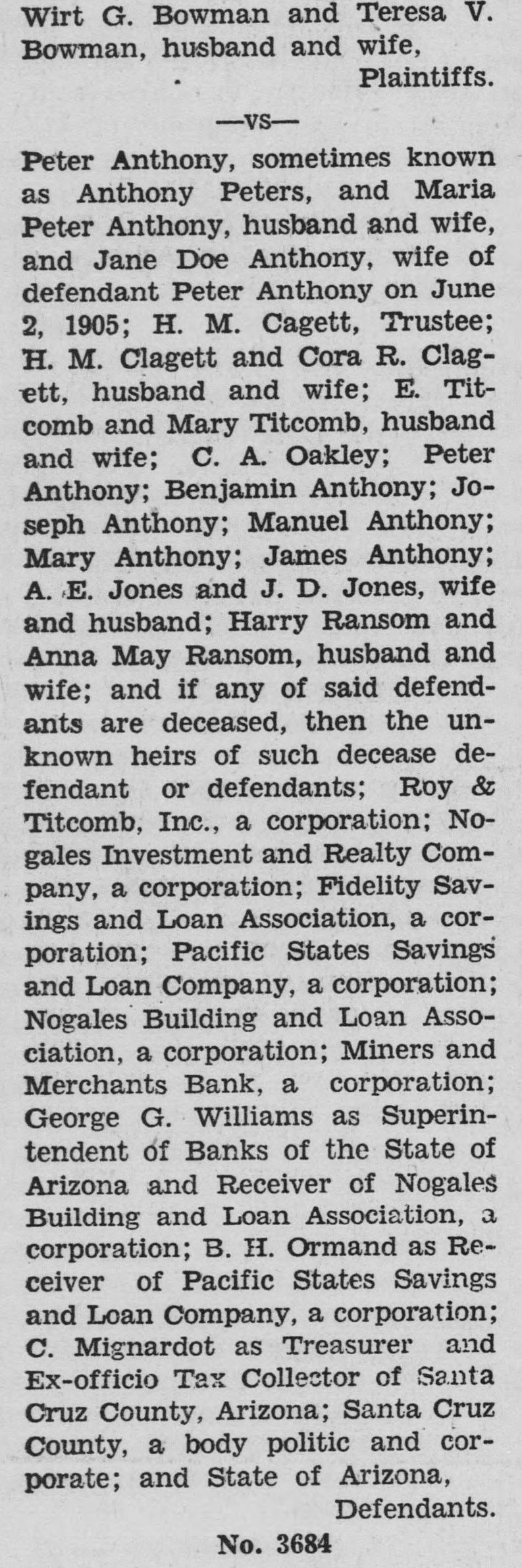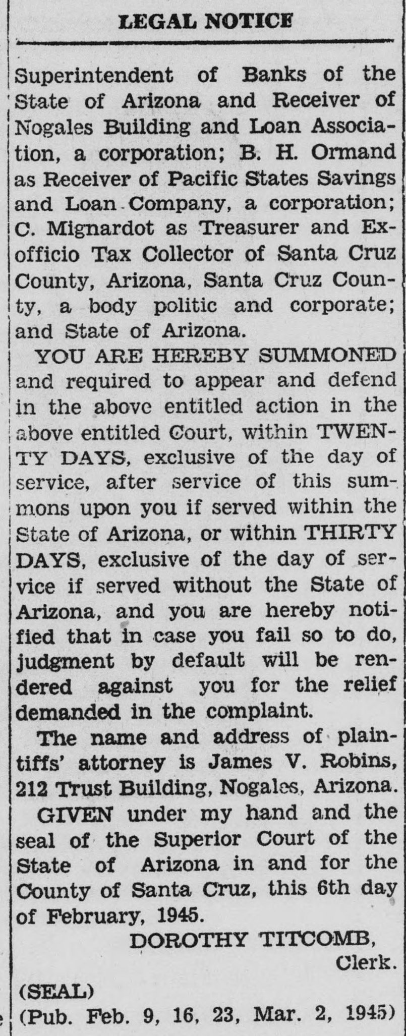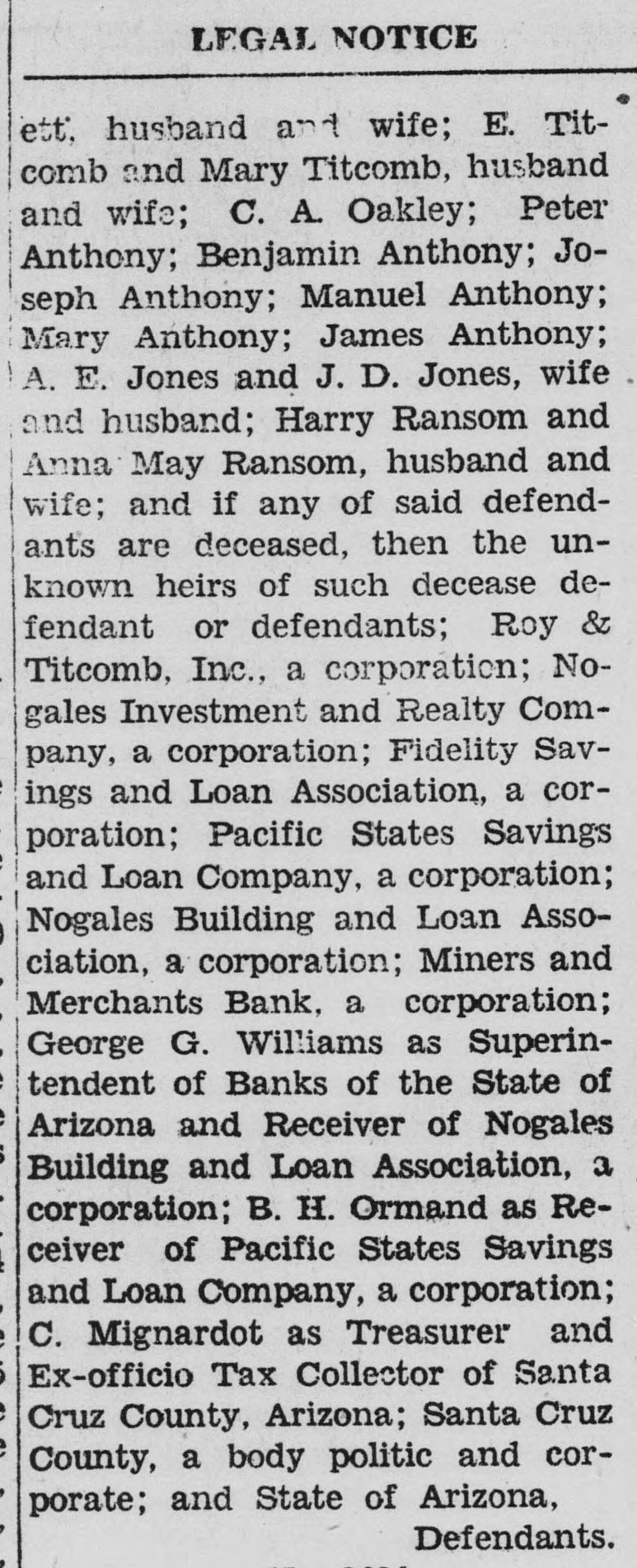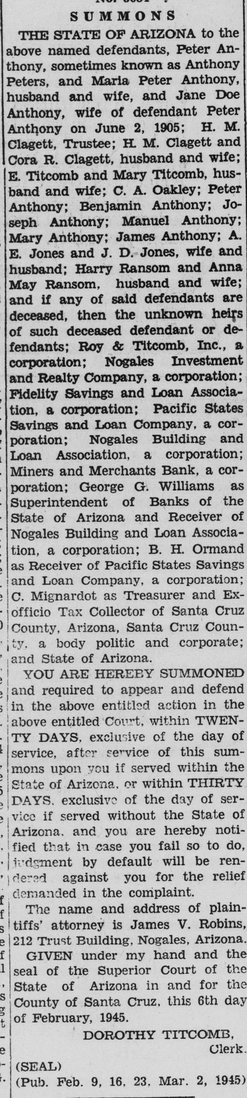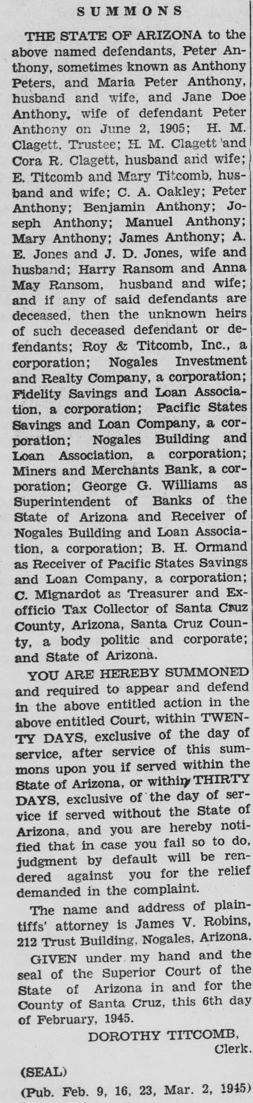 SUMMONS THE STATE OF ARIZONA to the above named defendants, Peter Anthony, sometimes known as Anthony Peters, and Maria Peter Anthony, husband and wife, and Jane Doe Anthony. wife of defendant Peter Anthony on June 2, 1905; H. M. Clagett, Trustee; H. M. Clagett and Cora R. Clagett, husband and wife; E. Titcomb and Mary Titcomb, husband and wife; C. A. Oakley; Peter Anthony; Benjamin Anthony; Joseph Anthony; Manuel Anthony; Mary Anthony; James Anthony; A. E. Jones and J. D. Jones, wife and husband; Harry Ransom and Anna May Ransom, husband and wife; and if any of said defendants are deceased, then the unknown heirs of such deceased defendant or defendants; Roy & Titcomb, Inc., a corporation; Nogales Investment and Realty Company, a corporation; Fidelity Savings and Loan Association, a corporation; Pacific States Savings and Loan Company, a corporation; Nogales Building and Loan Association, a corporation; Miners and Merchants Bank, a corporation; George G. Williams as Superintendent of Banks of the State of Arizona and Receiver of Nogales Building and Loan Association, a corporation; B. H. Ormand as Receiver of Pacific States Savings and Loan Company, a corporation; C. Mignardot as Treasurer and Exofficio Tax Collector of Santa Cruz County, Arizona, Santa Cruz County, a body politic and corporate; and State of Arizona. YOU ARE HEREBY SUMMONED and required to appear and defend in the above entitled action in the above entitled Court, within TWENTY DAYS, exclusive of the day of service, after service of this summons upon you if served within the State of Arizona, or within THIRTY DAYS, exclusive of the day of service if served without the State of Arizona, and you are hereby notified that in case you fail so to do, judgment by default will be rendered against you for the relief demanded in the complaint. The name and address of plaintiffs' attorney is James V. Robins, 212 Trust Building, Nogales, Arizona. GIVEN under. my hand and the seal of the Superior Court of the State of Arizona in and for the County of Santa Cruz, this 6th day of February, 1945. DOROTHY TITCOMB, Clerk. (SEAL) (Pub. Feb. 9, 16, 23, Mar. 2, 1945)