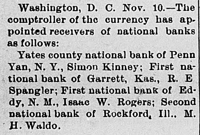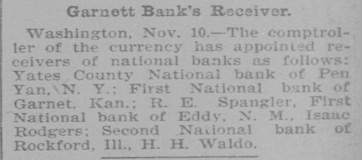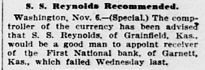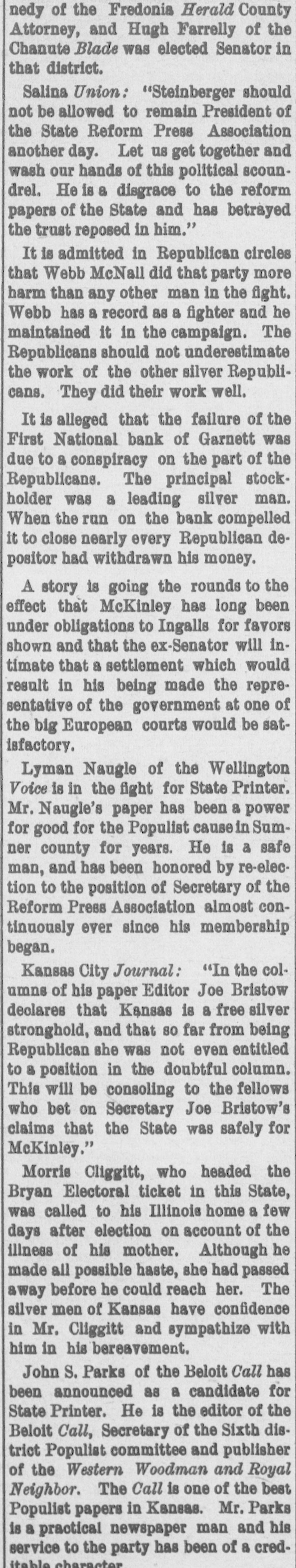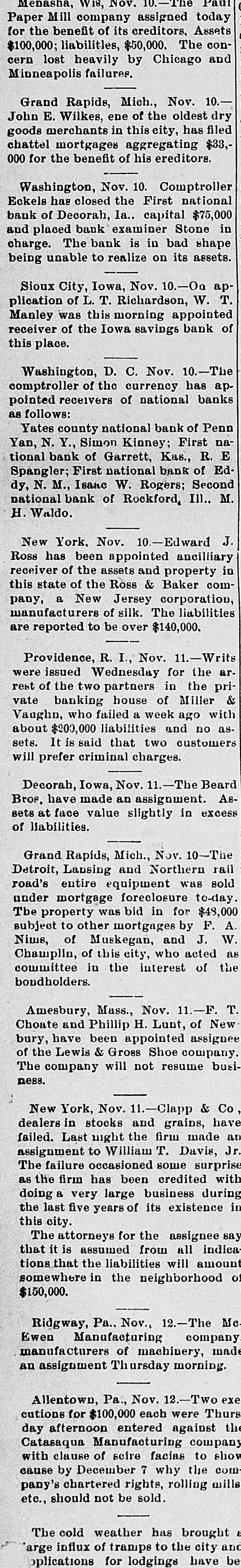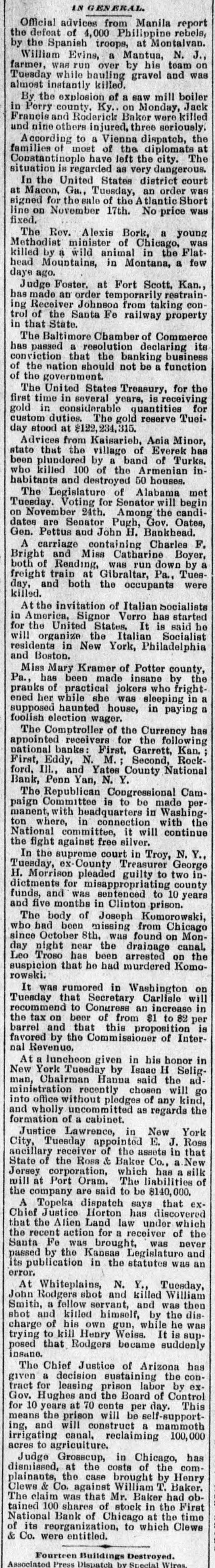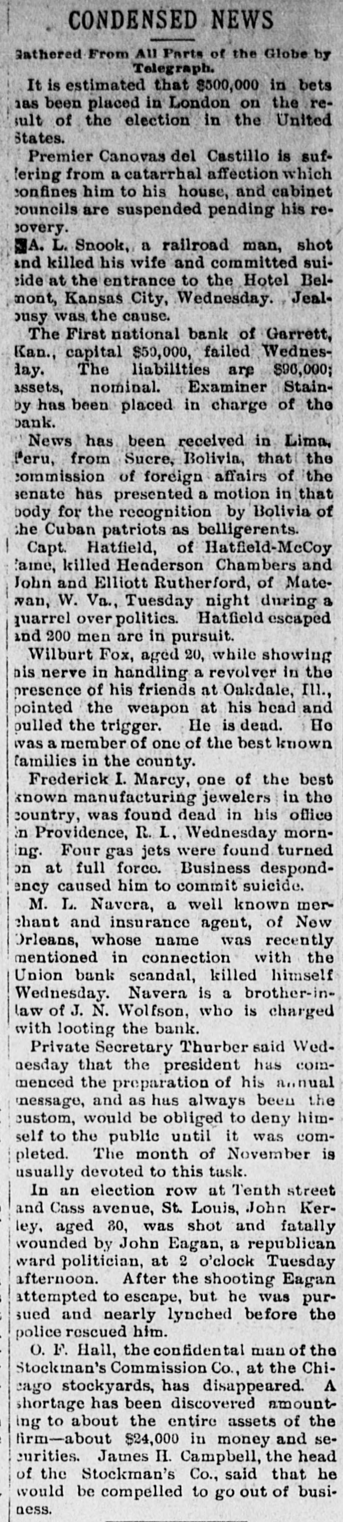 CONDENSED NEWS Gathered From All Parts of the Globe by Telegraph. It is estimated that $500,000 in bets has been placed in London on the result of the election in the United States. Premier Canovas del Castillo is suf!ering from a catarrhal affection which confines him to his house, and cabinet councils are suspended pending his recovery. A. L. Snook, a railroad man, shot and killed his wife and committed suicide at the entrance to the Hotel Belnont, Kansas City, Wednesday. Jealbusy was the cause. The First national bank of Garrett, Kan., capital $50,000, failed Wednesday. The liabilities are $96,000; assets, nominal. Examiner Stainby has been placed in charge of the bank. News has been received in Lima, Peru, from Sucre, Bolivia, that the commission of foreign affairs of the senate has presented a motion in that body for the recognition by Bolivia of the Cuban patriots as belligerents. Capt. Hatfield, of Hatfield-McCoy lame, killed Headerson Chambers and John and Elliott Rutherford, of Matevan, W. Va., Tuesday night during a quarrel over politics. Hatfield escaped and 200 men are in pursuit. Wilburt Fox, aged 20, while showing his nerve in handling a revolver in the presence of his friends at Oakdale, Ill., pointed the weapon at his head and pulled the trigger. He is dead. He was a member of one of the best known families in the county. Frederick I. Marcy, one of the best known manufacturing jewelers in the country, was found dead in his office in Providence, R. L, Wednesday morning. Four gas jets were found turned on at full force. Business despondency caused him to commit suicide. M. L. Navera, a well known merchant and insurance agent, of New Orleans, whose name was recently mentioned in connection with the Union bank scandal, killed himself Wednesday. Navera is a brother-inlaw of J. N. Wolfson, who is charged with looting the bank. Private Secretary Thurber said Wednesday that the president has commenced the preparation of his annual message, and as has always been the custom, would be obliged to deny himself to the public until it was completed. The month of November is usually devoted to this task. In an election row at Tenth street and Cass avenue, St. Louis, John Kerley, aged 30, was shot and fatally wounded by John Eagan, a republican ward politician, at 2 o'clock Tuesday afternoon. After the shooting Eagan attempted to escape, but he was pursued and nearly lynched before the police rescued him. O. F. Hall, the confidental man of the Stockman's Commission Co., at the Chicago stockyards, has disappeared. A shortage has been discovered amounting to about the entire assets of the firm-about $24,000 in money and securities. James H. Campbell, the head of the Stockman's Co., said that he would be compelled to go out of business.