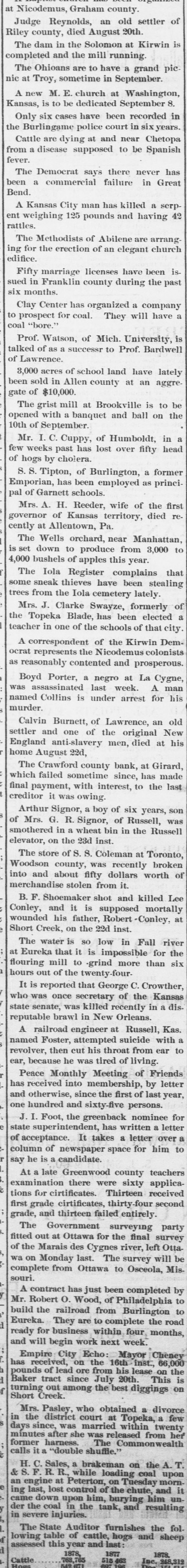 The Ohioans are to have a grand pic. nic at Troy, sometime in September. A new M. E. church at Washington, Kansas, is to be dedicated September 8. Only six cases have been recorded in the Burlingame police court in six years. Cattle are dying at and near Chetopa from a disease supposed to be Spanish fever. The Democrat says there never has been a commercial failure in Great Bend. A Kansas City man has killed a serpent weighing 125 pounds and having 42 rattles. The Methodists of Abilene are arrang. ing for the erection of an elegant church edifice. Fifty marriage licenses have been issued in Franklin county during the past six months. Clay Center has organized a company to prospect for coal. They will have a coal "bore." Prof. Watson, of Mich. University, is talked of as a successr to Prof. Bardwell of Lawrence. 3,000 acres of school land have lately been sold in Allen county at an aggregate of $10,000. The grist mill at Brookville is to be opened with a banquet and ball on the 10th of September. Mr. I.C. Cuppy, of Humboldt, in a few weeks past has lost over fifty head of hogs by cholera. S. S. Tipton, of Burlington, a former Emporian, has been employed as principal of Garnett schools. Mrs. A. H. Reeder, wife of the first governor of Kansas territory, died recently at Allentown, Pa. The Wells orchard, near Manhattan, is set down to produce from 3,000 to 4,000 bushels of apples this year. The Iola Register complains that some sneak thieves have been stealing trees from the Iola cemetery lately. Mrs. J. Clarke Swayze, formerly of the Topeka Blade, has been elected a teacher in one of the schools of that city. A correspondent of the Kirwin Democrat represents the Nicodemus colonists as reasonably contented and prosperous. Boyd Porter, a negro at La Cygne, was assassinated last week. A man named Collins is under arrest for his murder. Calvin Burnett, of Lawrence, an old settler and one of the original New England anti-slavery men, died at his home August 22d, The Crawford county bank, at Girard, which failed sometime since, has made final payment, with interest, to the last creditor it was owing. Arthur Signor, a boy of six years, son of Mrs. G. R. Signor, of Russell, was smothered in a wheat bin in the Russell elevator, on the 23d inst. The store of S.S. Coleman at Toronto, Woodson county, was recently broken into and about fifty dollars worth of merchandise stolen from it. B. F. Shoemaker shot and killed Lee Conley, and it is supposed mortally wounded his father, Robert Conley, at Short Creek, on the 22d inst. The water is so low in Fall river at Eureka that it is impossible for the flouring mill to -grind more than six hours out of the twenty-fourIt is reported that George C. Crowther, who was once secretary of the Kansas state senate, was killed recently in a disreputable brawl in New Orleans. A railroad engineer at Russell, Kas. named Foster, attempted suicide with a revolver, then cut his throat from ear to ear, because he was tired of living. Peace Monthly Meeting of Friends has received into membership, by letter and otherwise, since the first of last year, one hundred and sixty-five persons. J. I. Foot, the greenback nominee for state superintendent, has written a letter of acceptance. It takes a letter over a column of newspaper space for him to say he is a candidate. At a late Greenwood county teachers examination there were sixty applications for cirtificates. Thirteen received first grade cirtificates, thirty four second grade, and thirteen failed entirely. The Government surveying party fitted out at Ottawa for the final survey of the Marais des Cygnes river, left Ottawa on Monday last. The survey will be complete from Ottawa to Osceola, Missouri. A contract has just been completed by Mr. Robert O. Wood, of Philadelphia to build the railroad from Burlington to Eureka. They are to complete the road ready for business within four months, and will begin work next week. Empire City Echo: Mayor Cheney has received, on the 16th inst., 66,000 pounds of lead ore from his lease on the Baker tract since July 20th. This is turning out among the best diggings on Short Creek. Mrs. Pasley, who obtained a divorce in the district court at Topeka, a few days since, was married within twenty minutes after she was released from her former harness. The Commonwealth calls it a "double shuffle." H.C. Sales, a brakeman on the A. T. & S.F. R. R., while loading coal upon an engine at Peterton, on Tuesday morning last, lost control of the chute, and it came down upon him, burying him under the