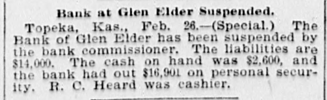 Bank at Glen Elder Suspended. Topeka, Kas., Feb. 26.-(Special.) The Bank of Glen Elder has been suspended by the bank commissioner. The liabilities are $14,000. The cash on hand was $2,600, and the bank had out $16,901 on personal security. R. C. Heard was cashier.